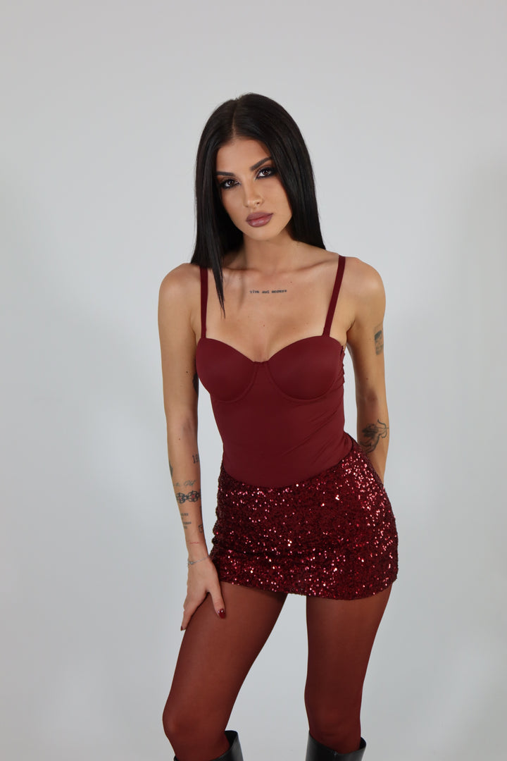 Body in tessuto aderente ed elasticizzato con coppe preformarte. La modella indossa una taglia S.