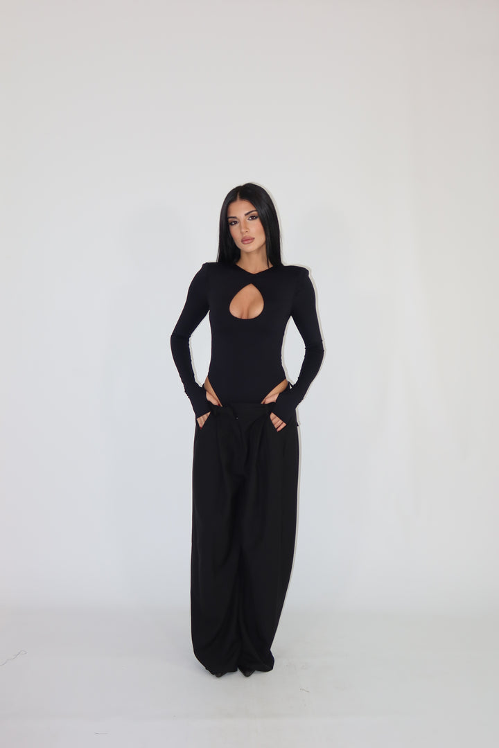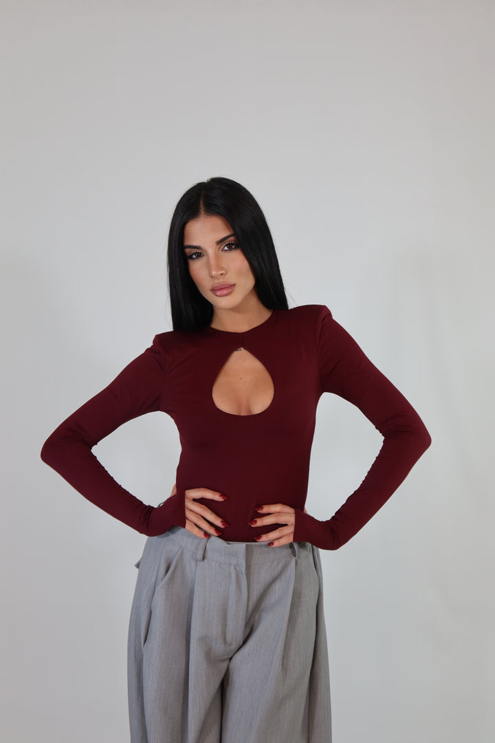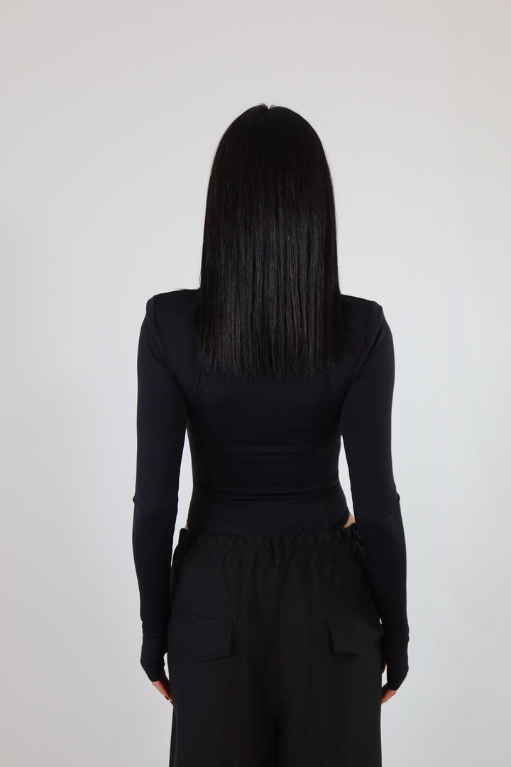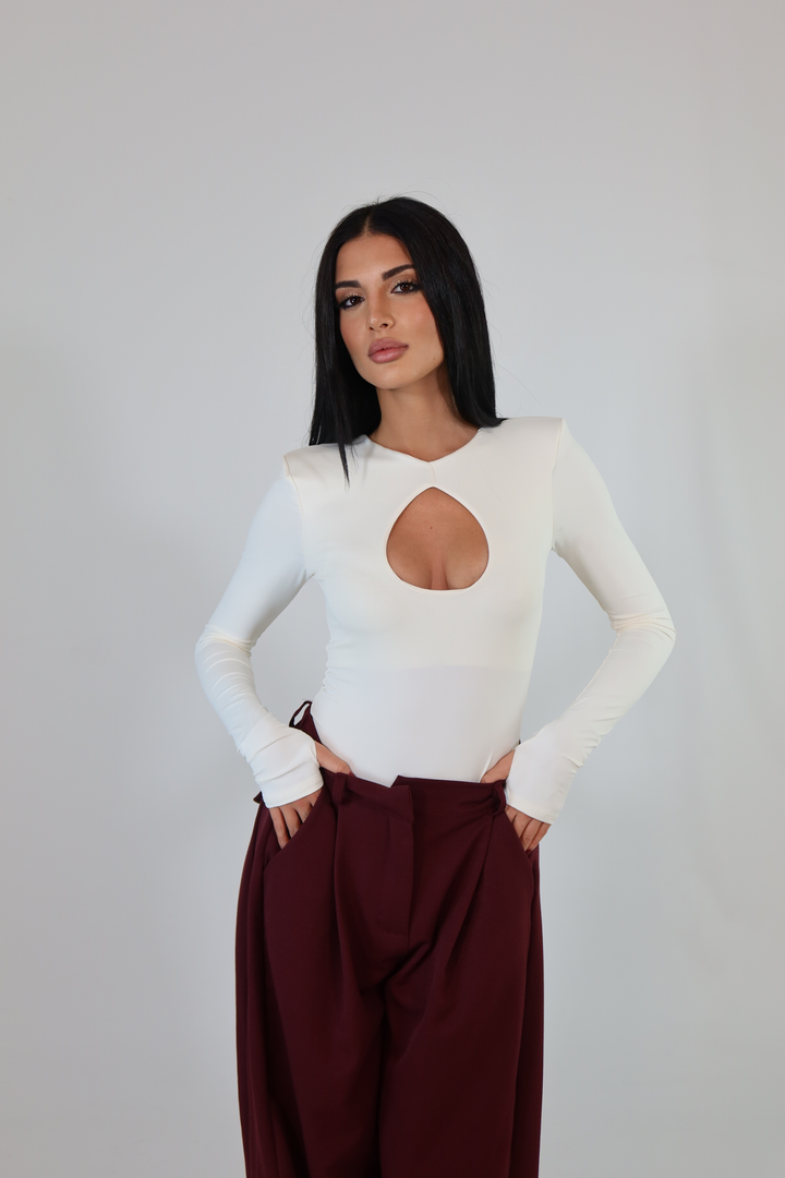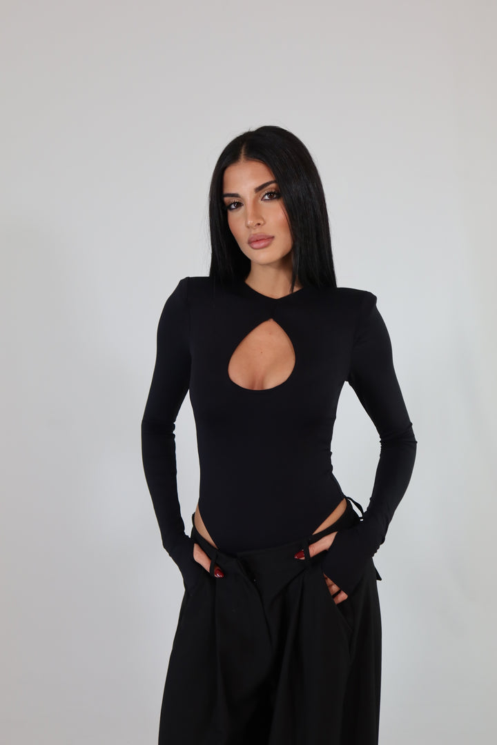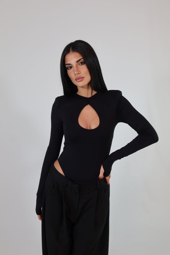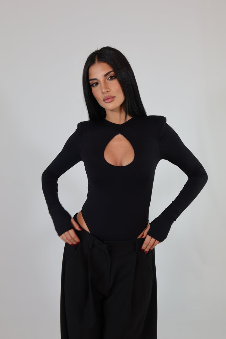 Body in tessuto aderente ed elasticizzato, con maniche a guanto, spalline imbottite e scollo sul seno. Si adattano da una XS ad una taglia M/L.
