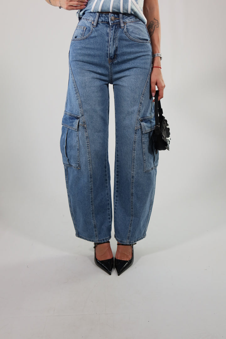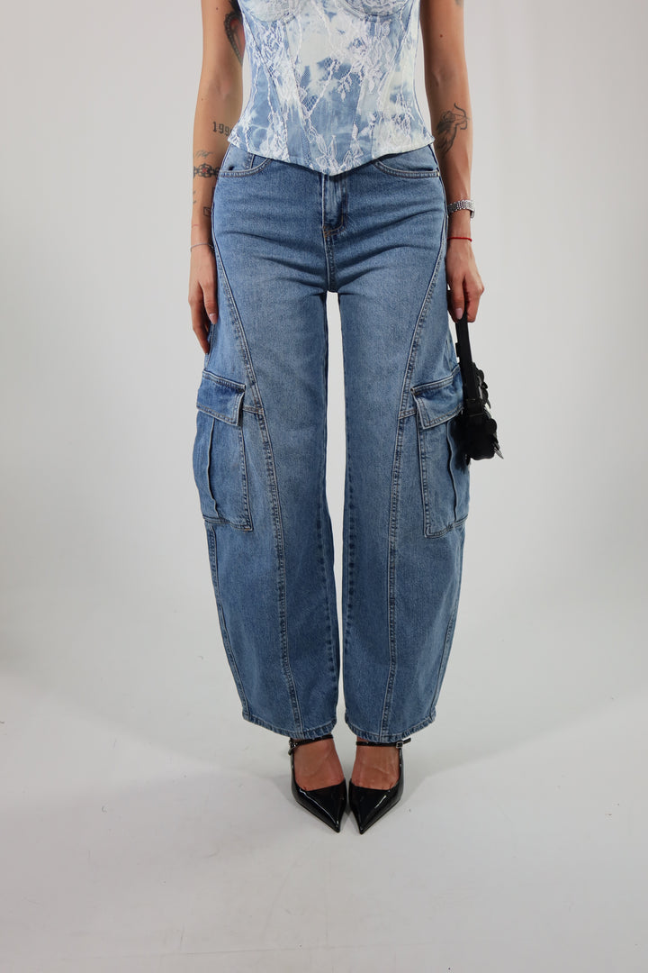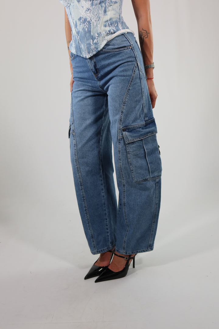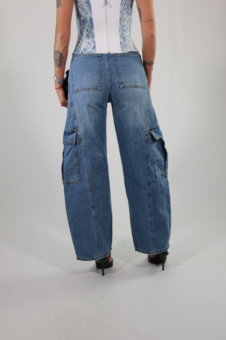 Cargo in denim dal fit baloon, la modella indossa la taglia XS ed è alta 1.72.