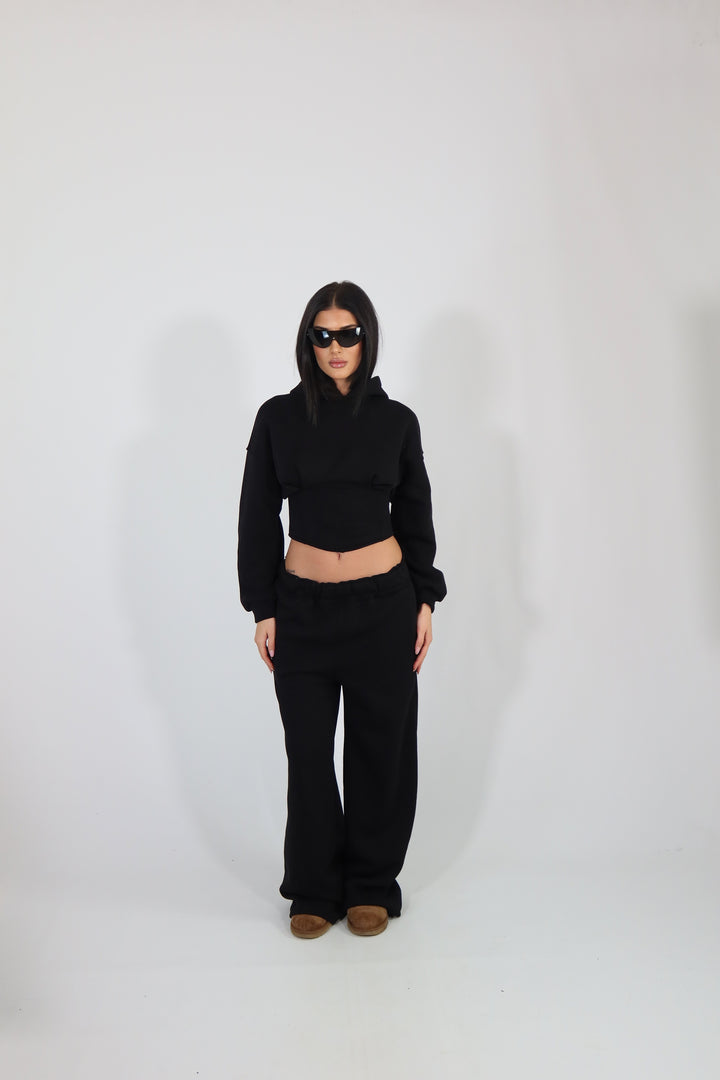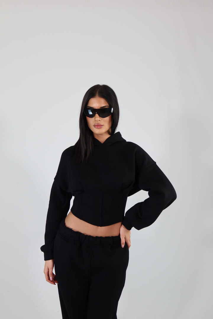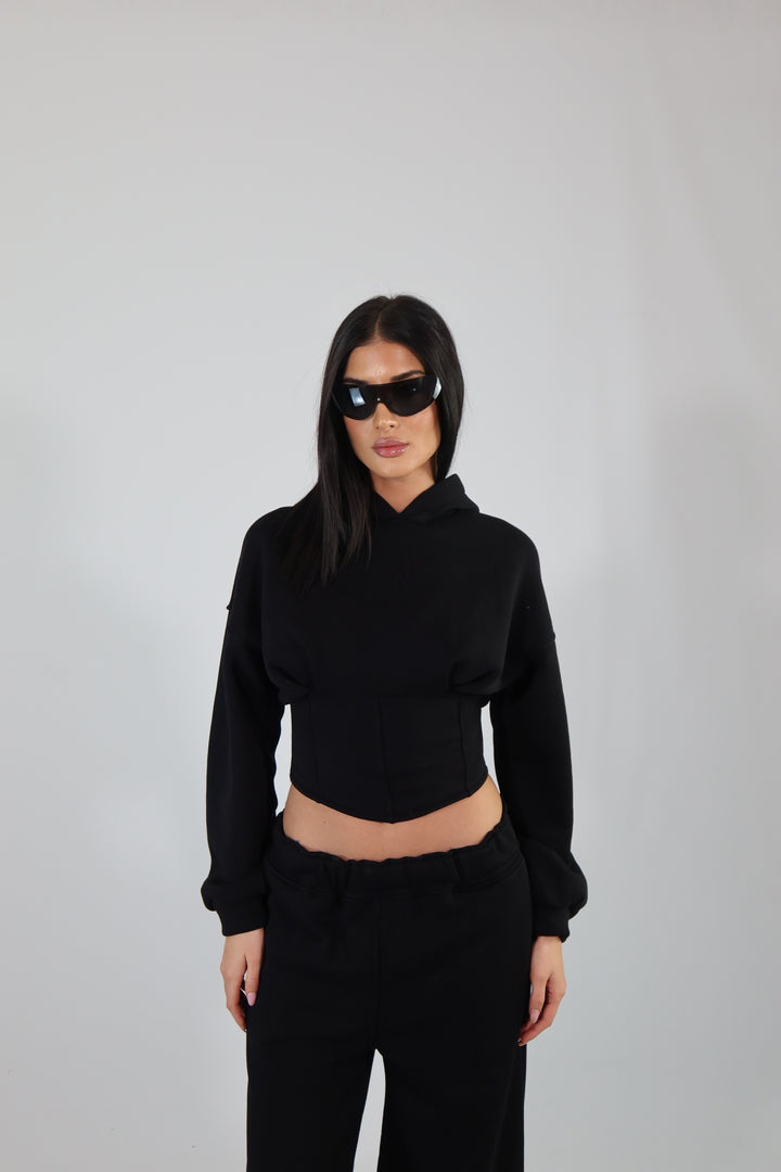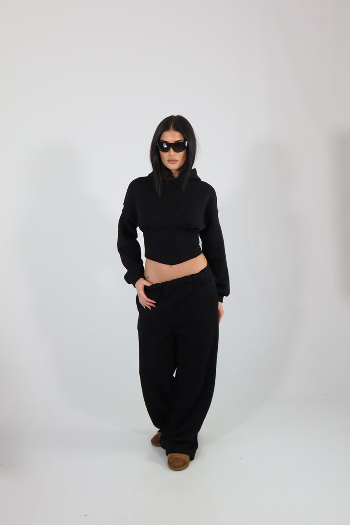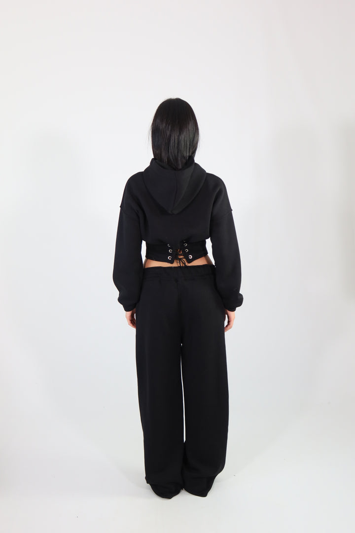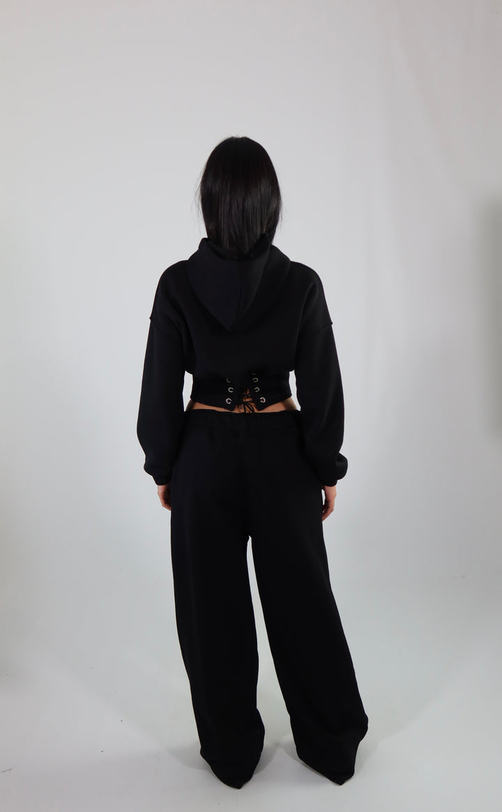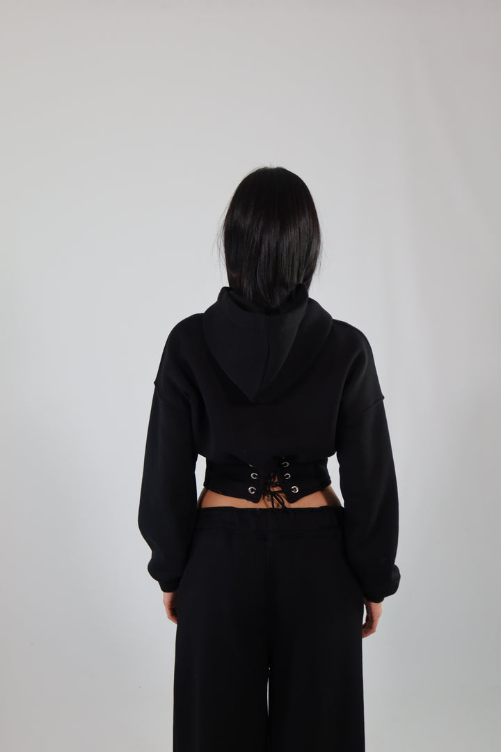 Coordinato di tuta con felpa corsetto regolabile grazie alle stringhe sul retro. Si adatta dalla XS ad una taglia M/L.