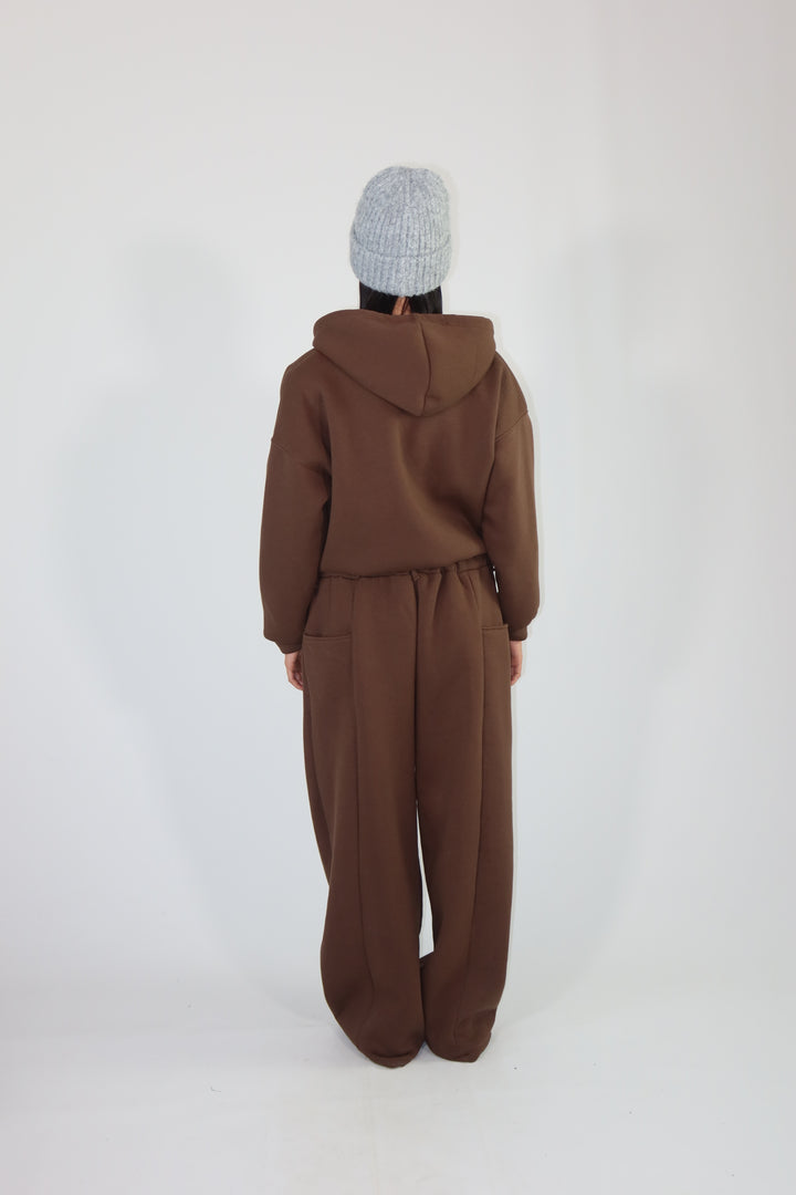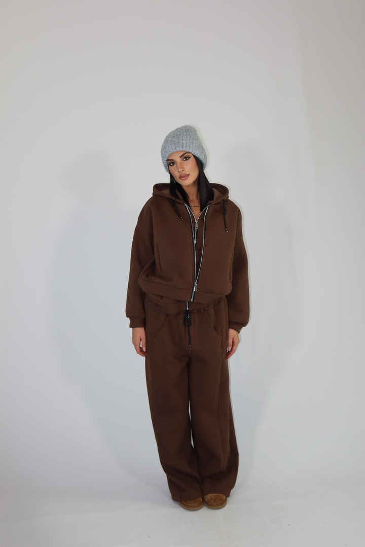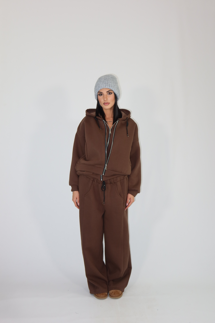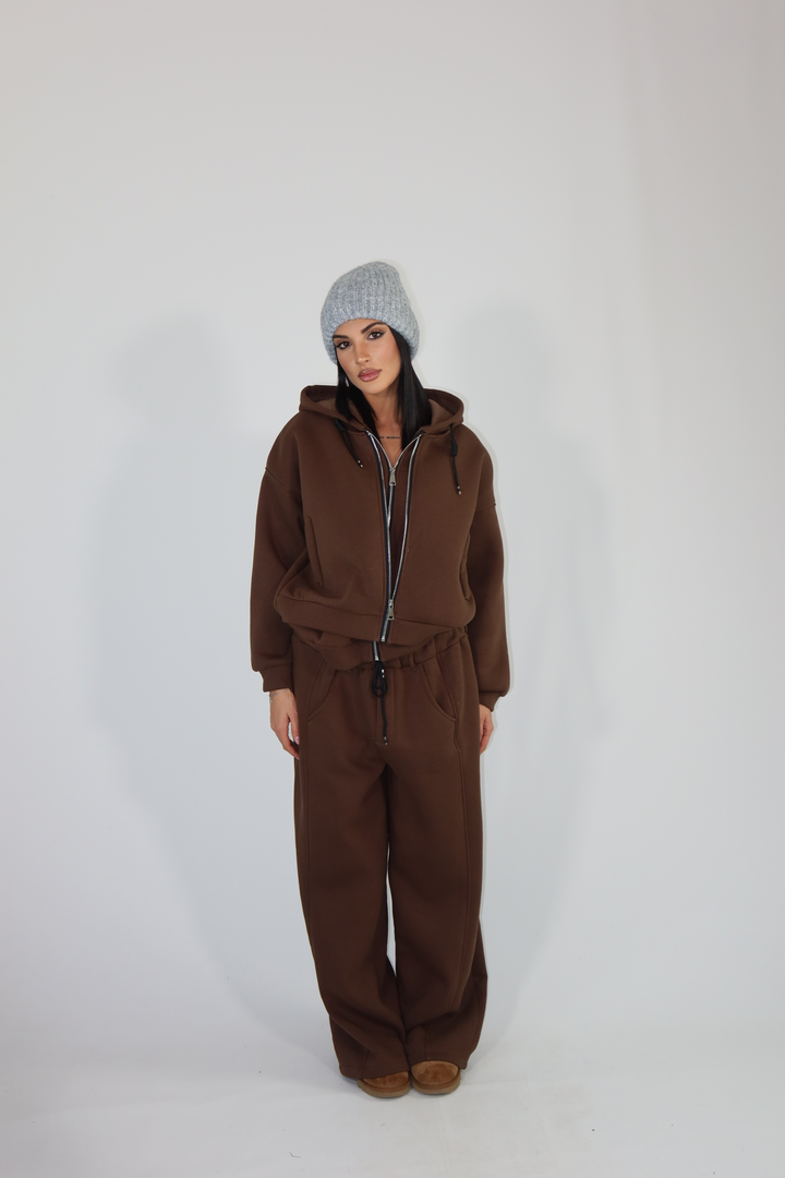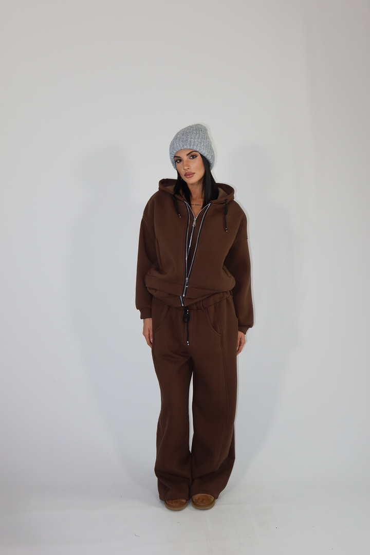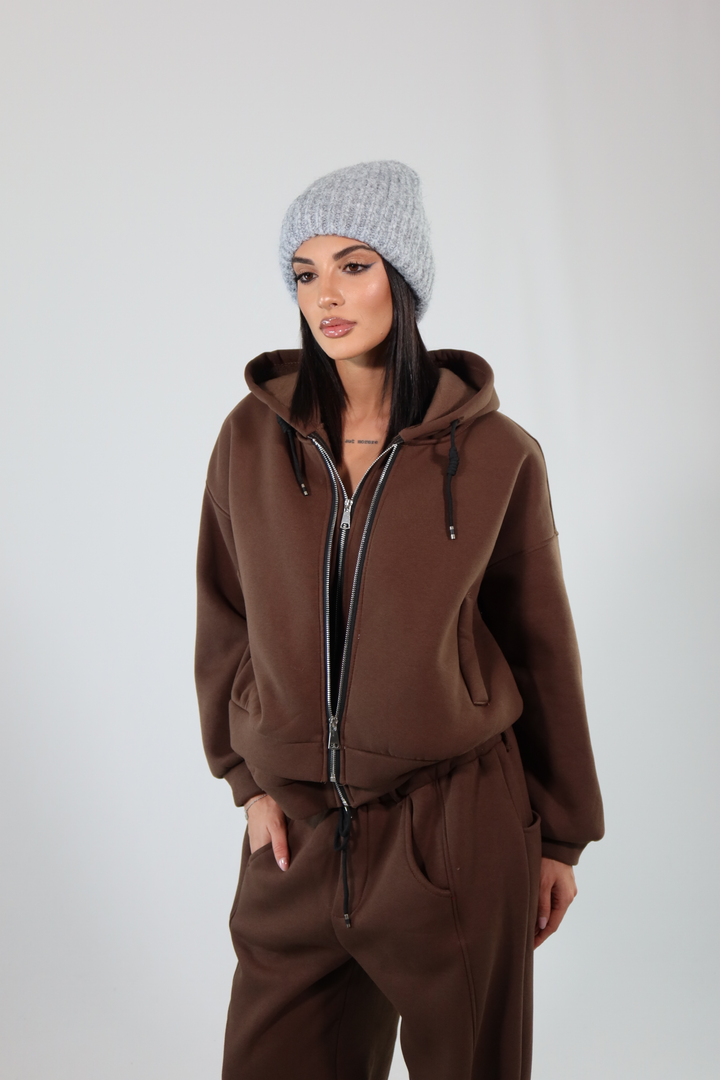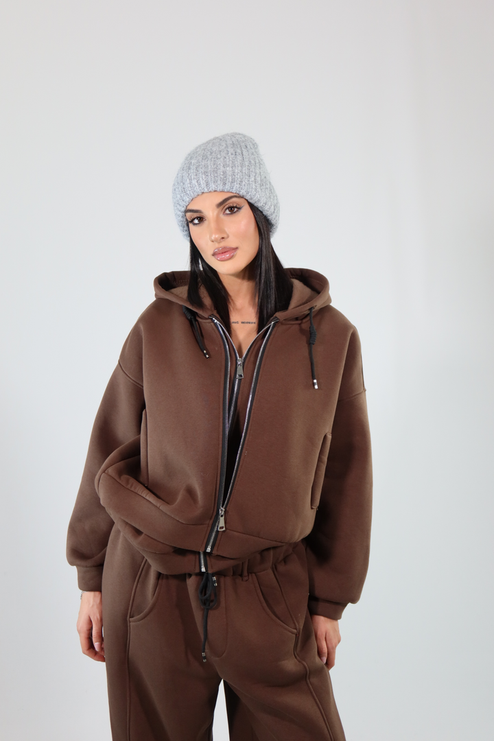 Coordinato di tuta con felpa a doppia zip e pantalone morbido.
