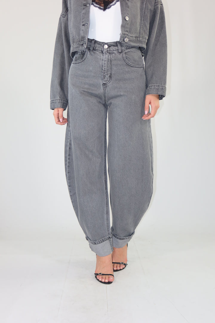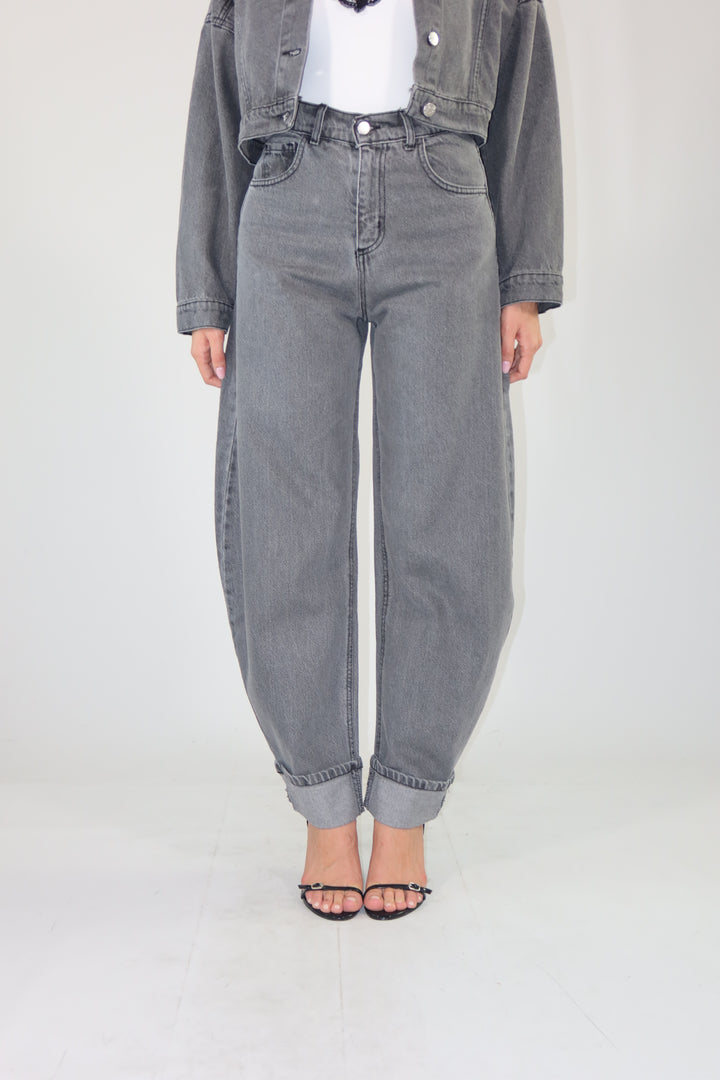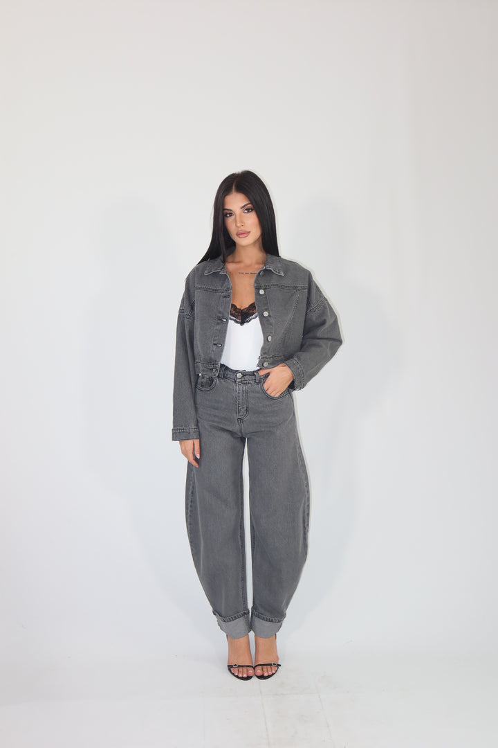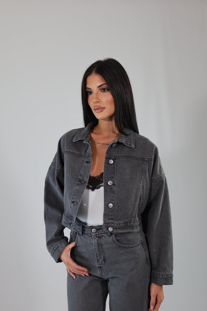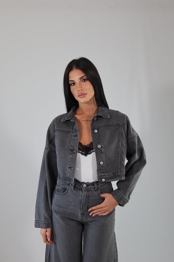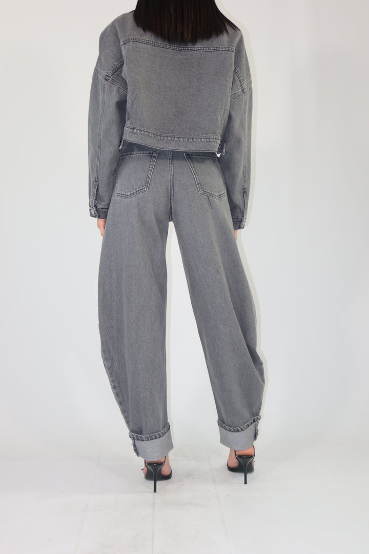 Coordinato in denim grigio, la modella indossa la taglia XS ed è alta 1.72.