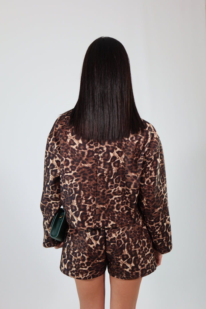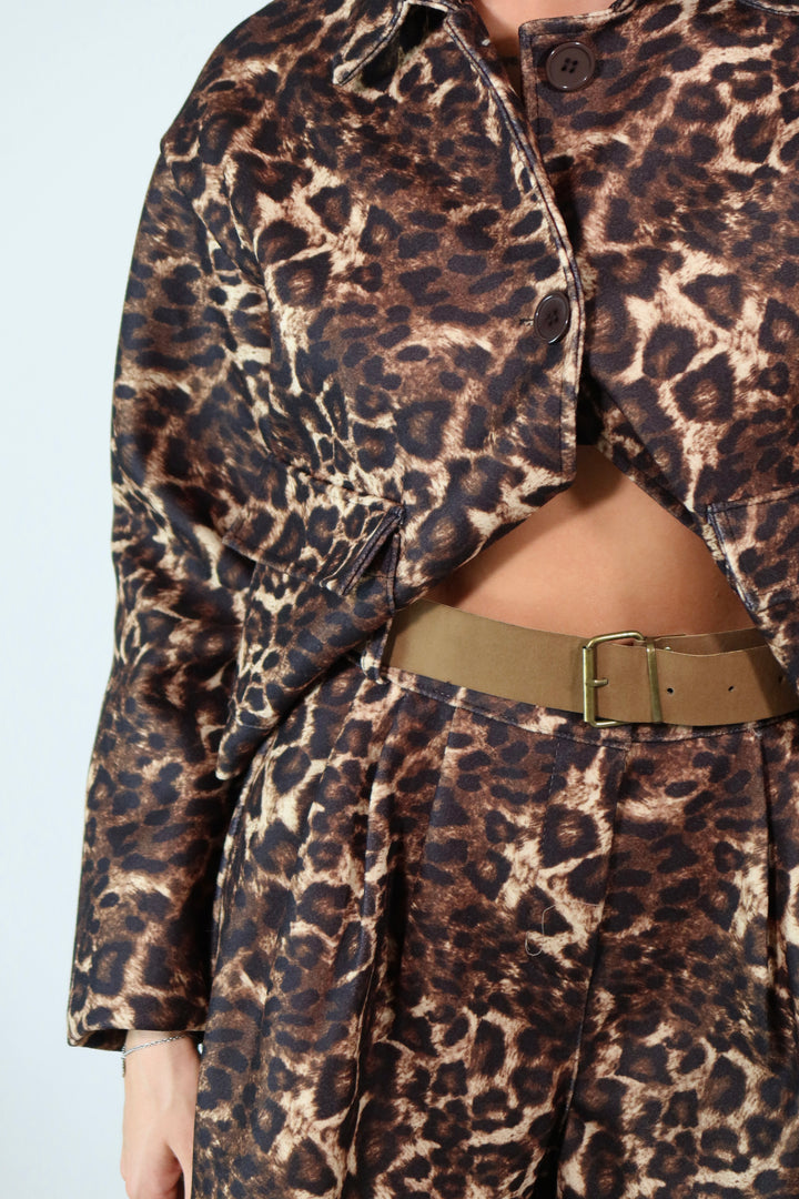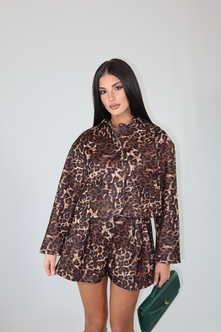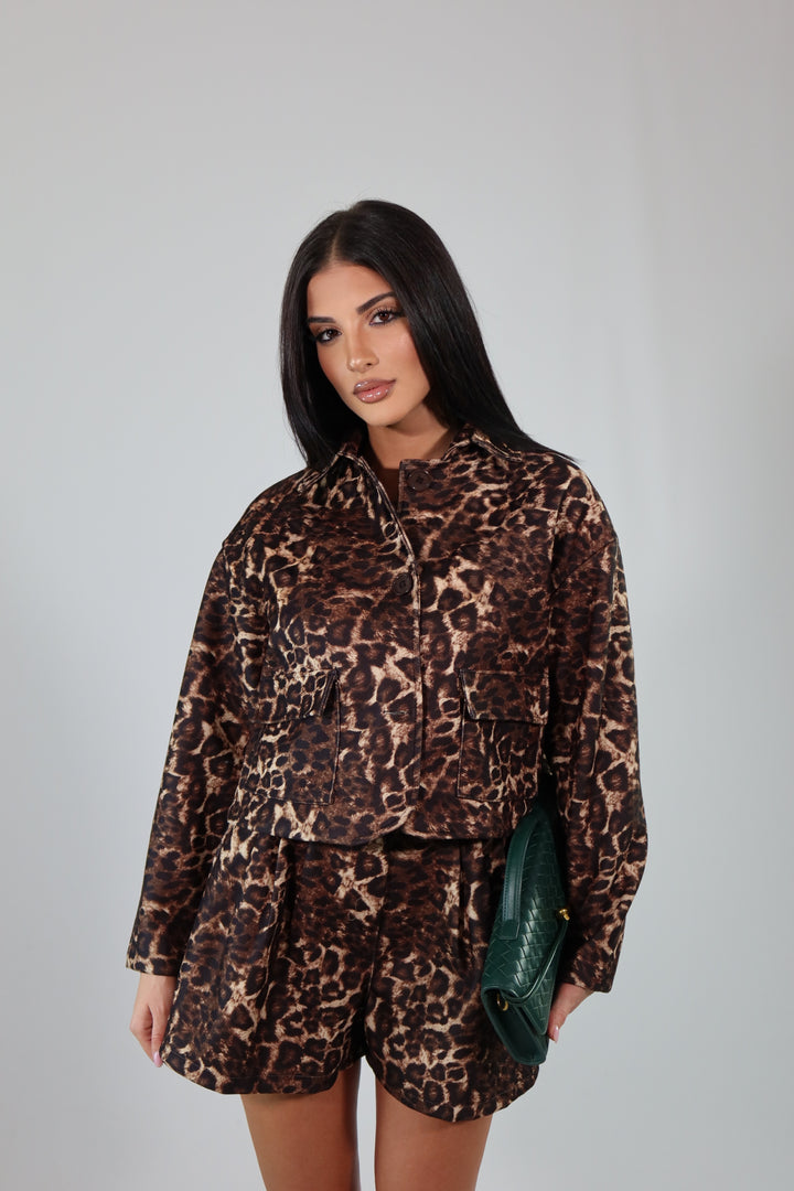Coordinato pantaloncino con cinta e bomber a fantasia.