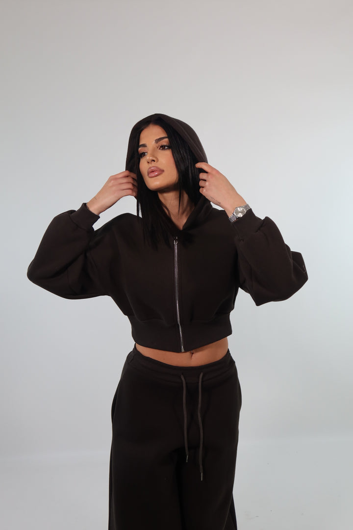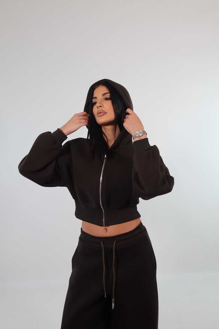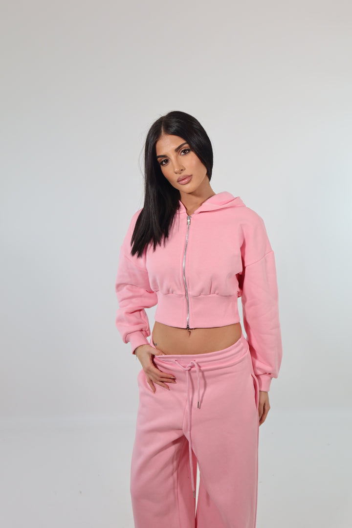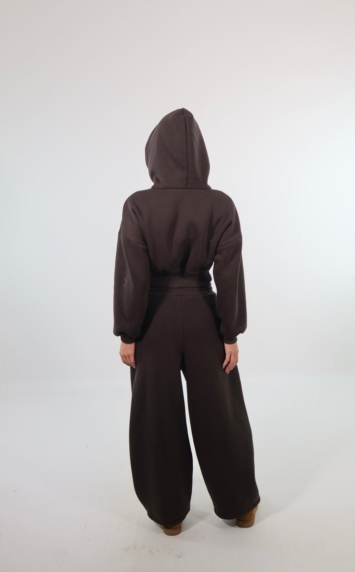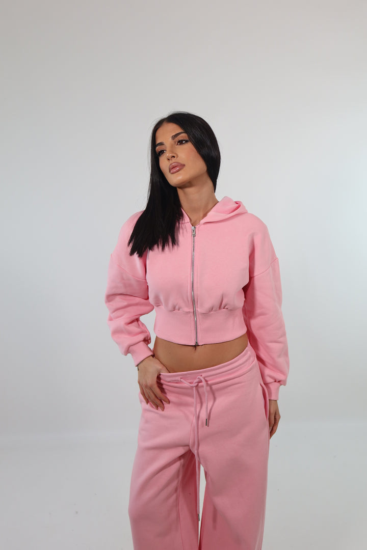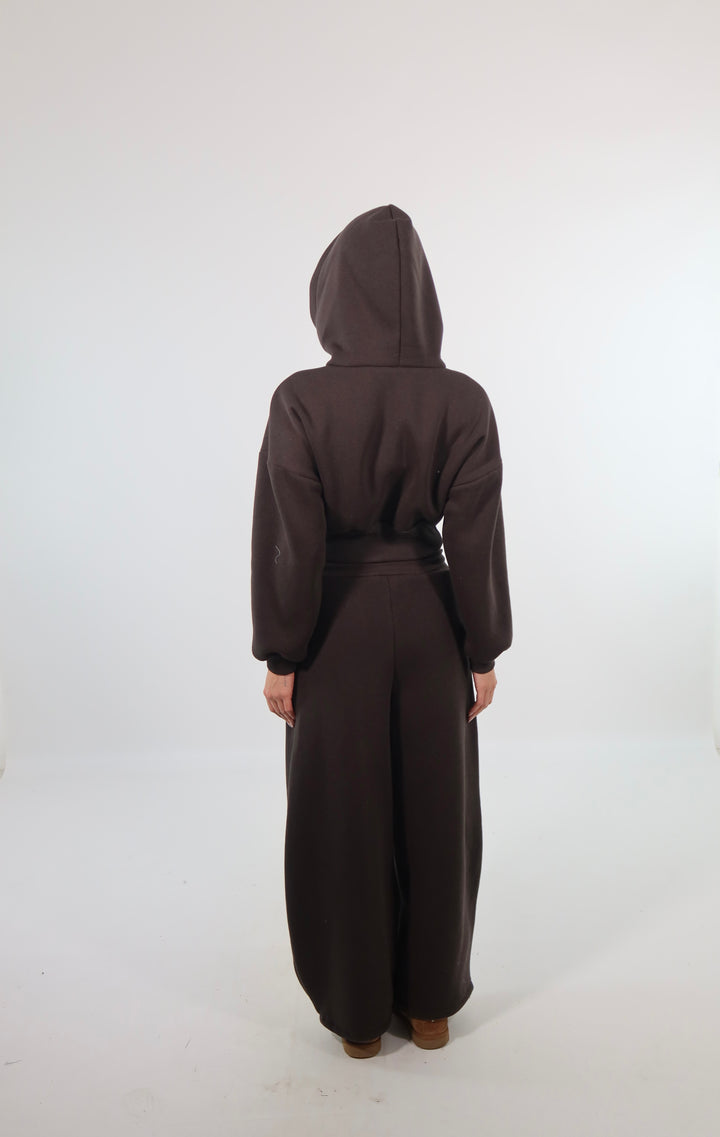 Coordinato caldo di tuta, giacca con zip e cappuccio e pantalone dal fit morbido. Si adatta da una XS ad una taglia M/L. Per rif. la modella è alta 1.72.
