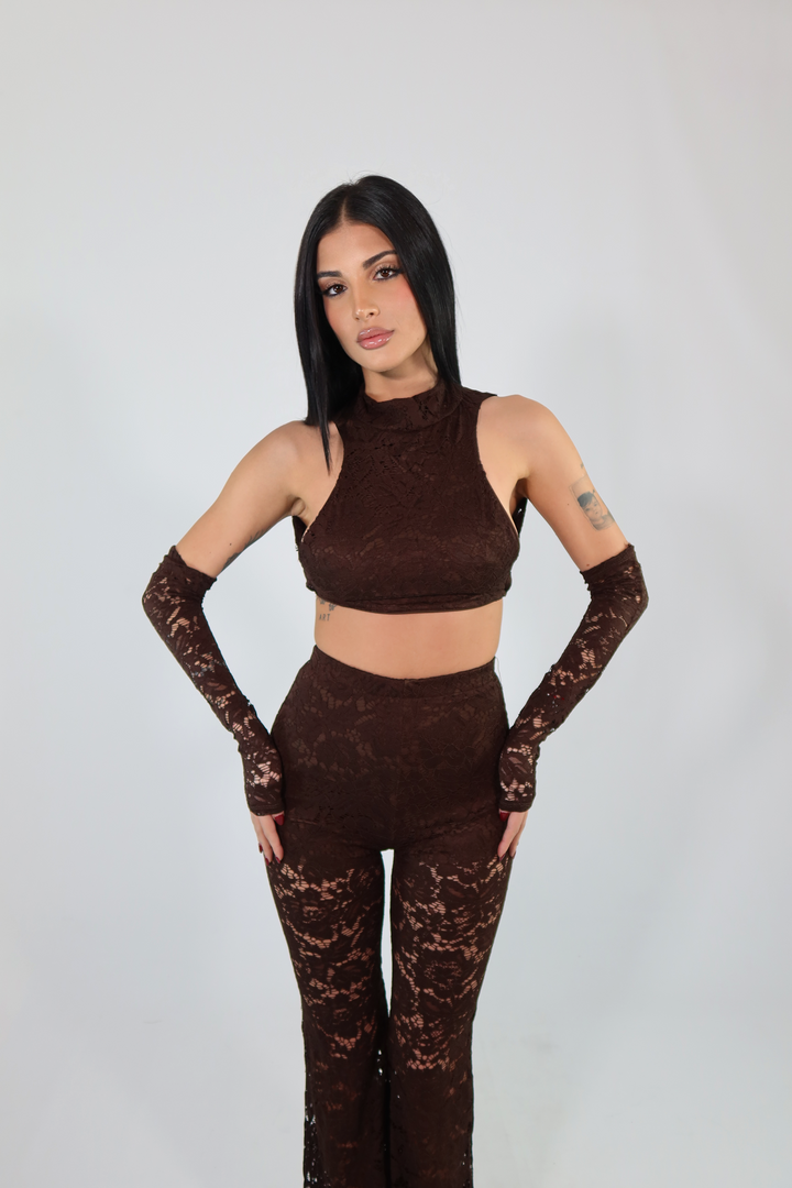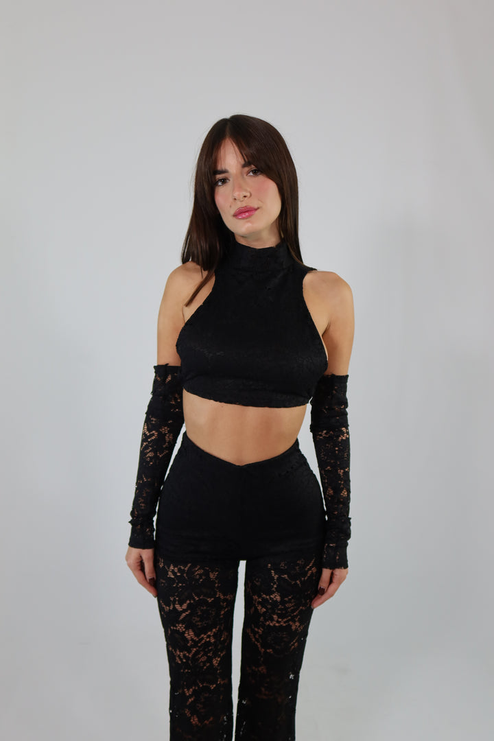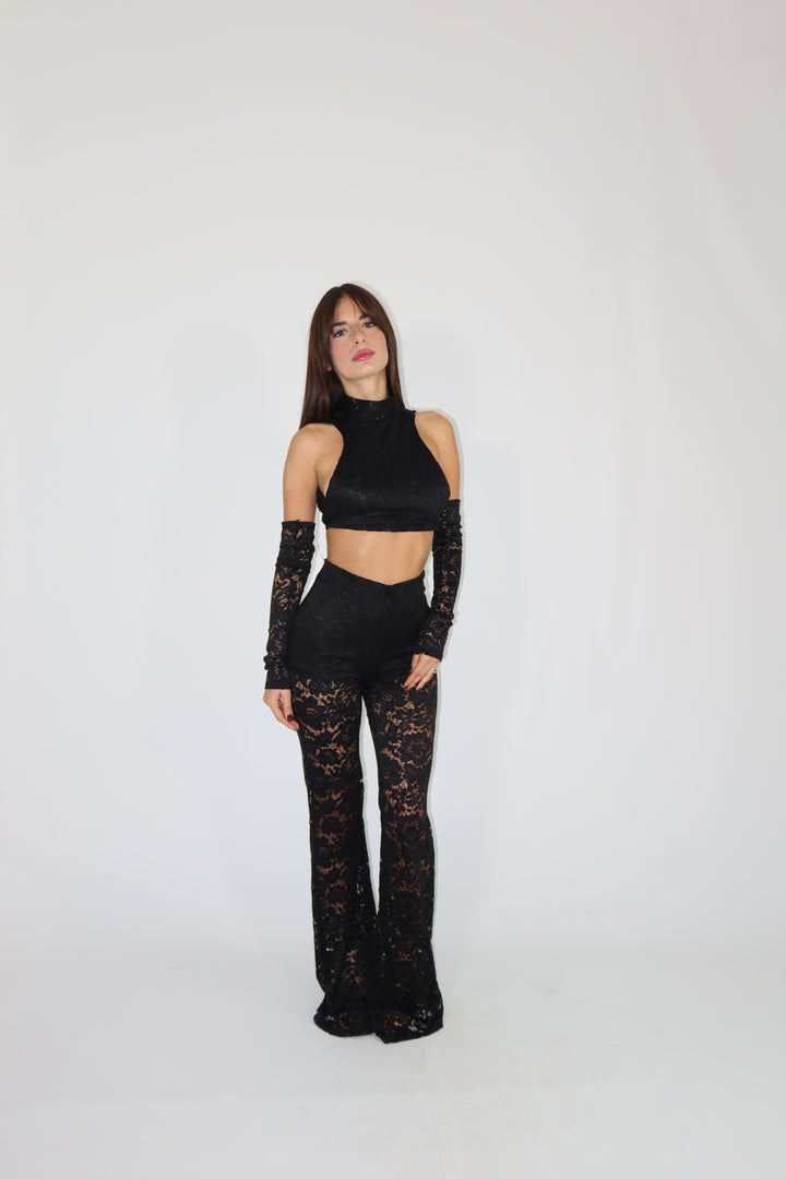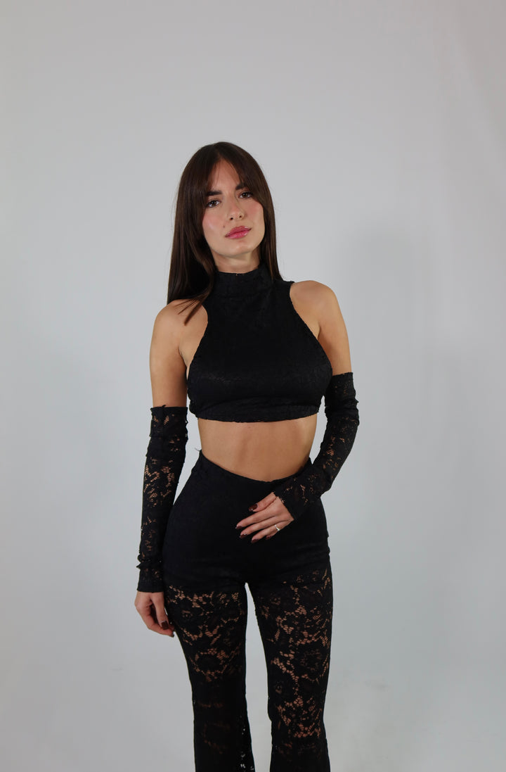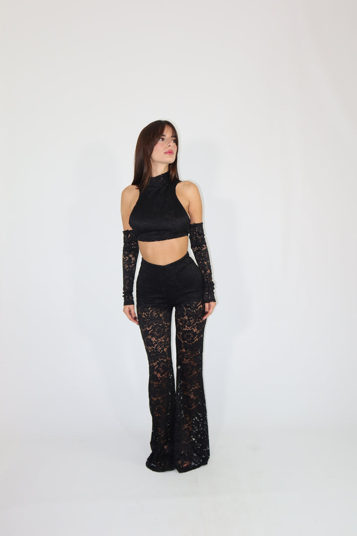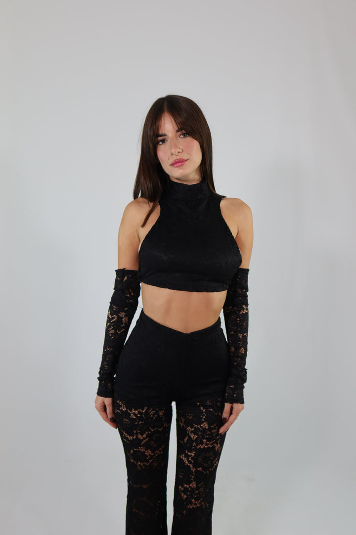 Coordinato di pizzo in tessuto aderente ed elasticizzato, con schiena scoperta, manicotti rimovibili e pantalone a zampa. Si adatta da una XS ad una taglia M/L.