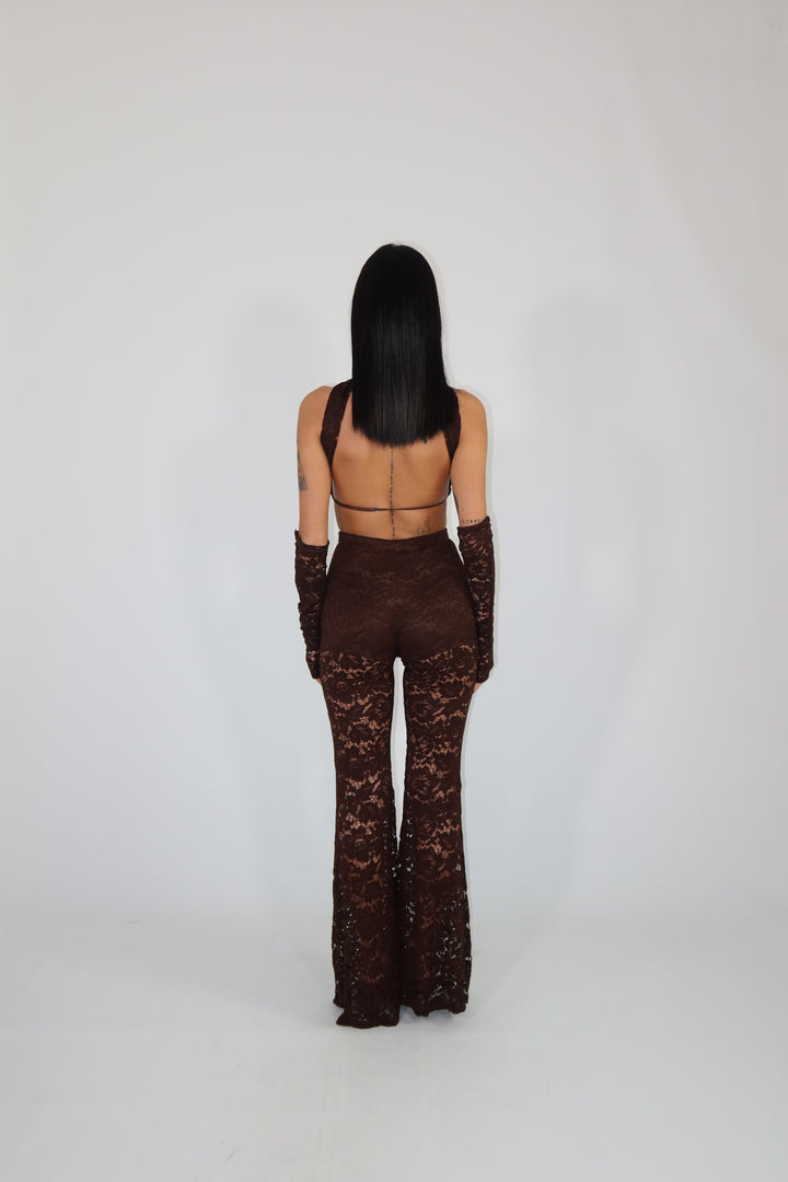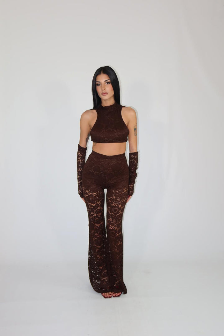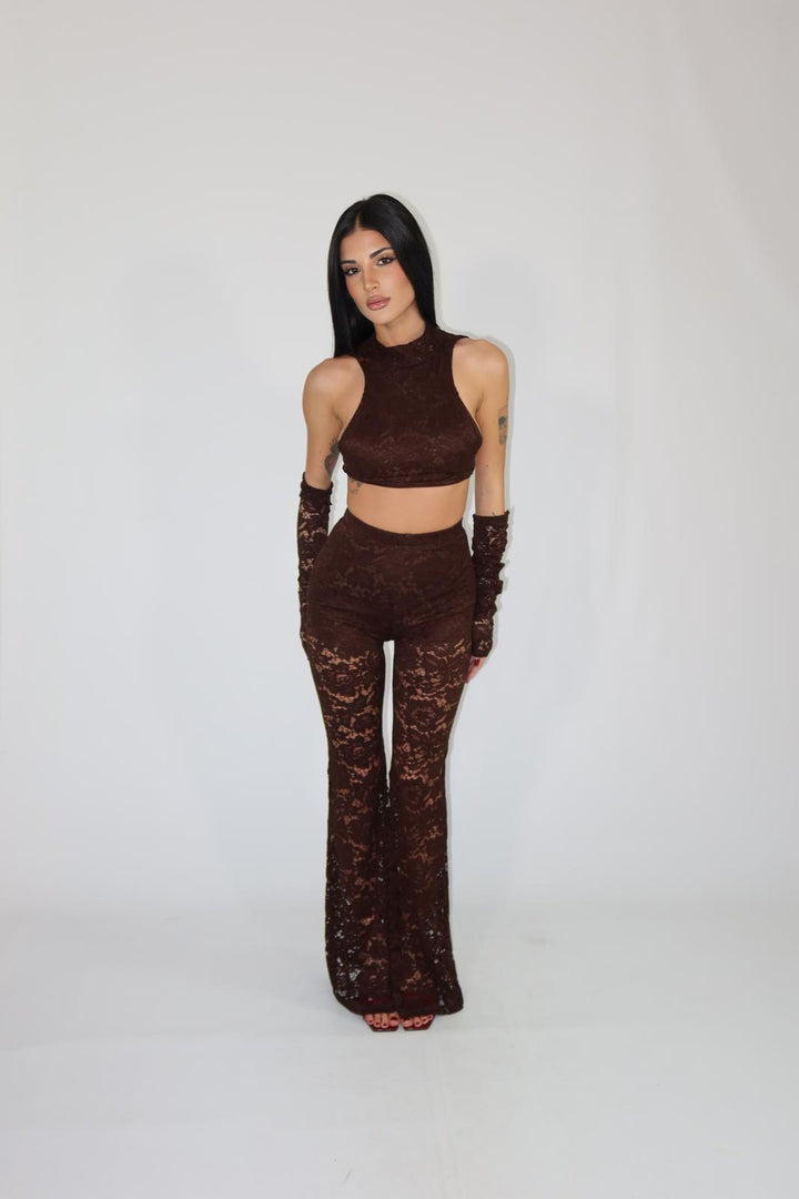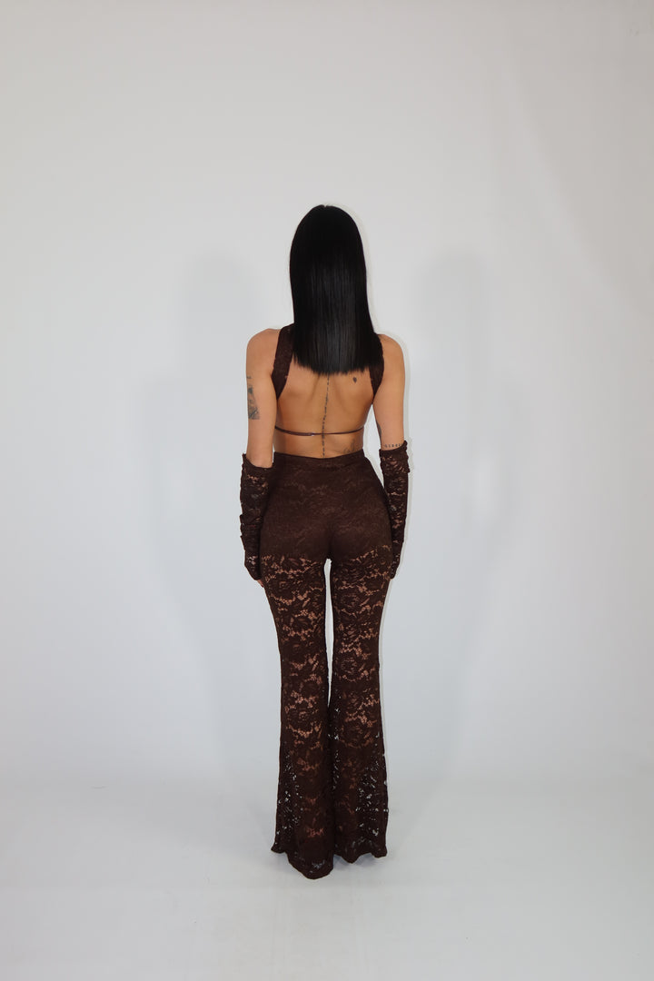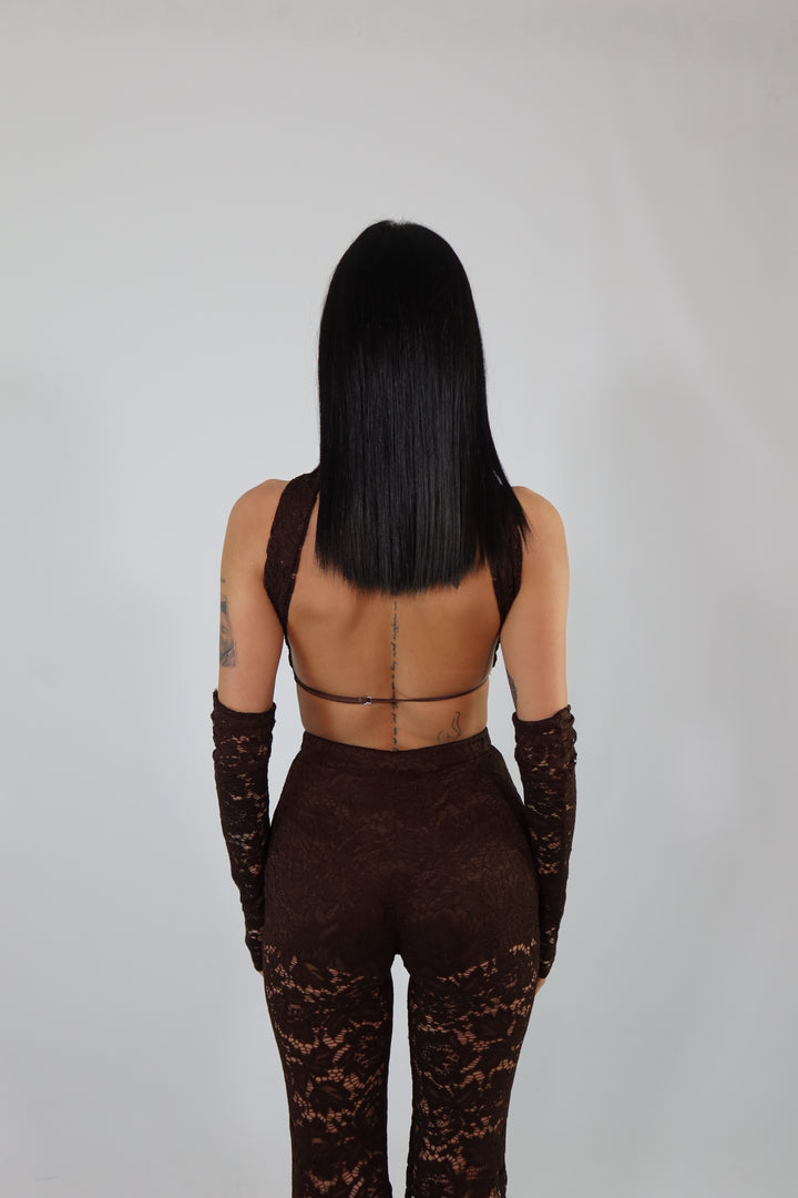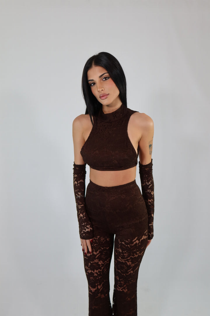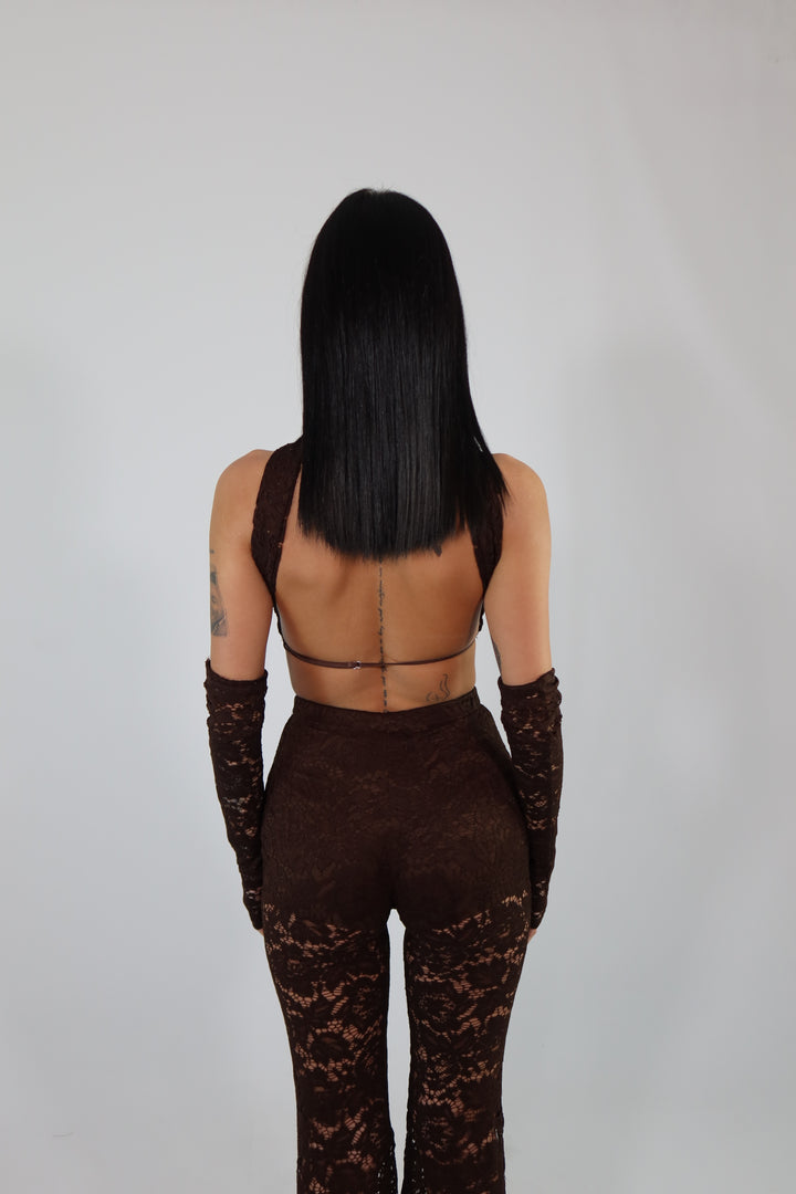 Coordinato di pizzo in tessuto aderente ed elasticizzato, con schiena scoperta, manicotti rimovibili e pantalone a zampa. Si adatta da una XS ad una taglia M/L.