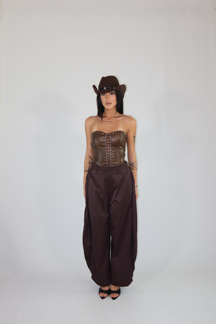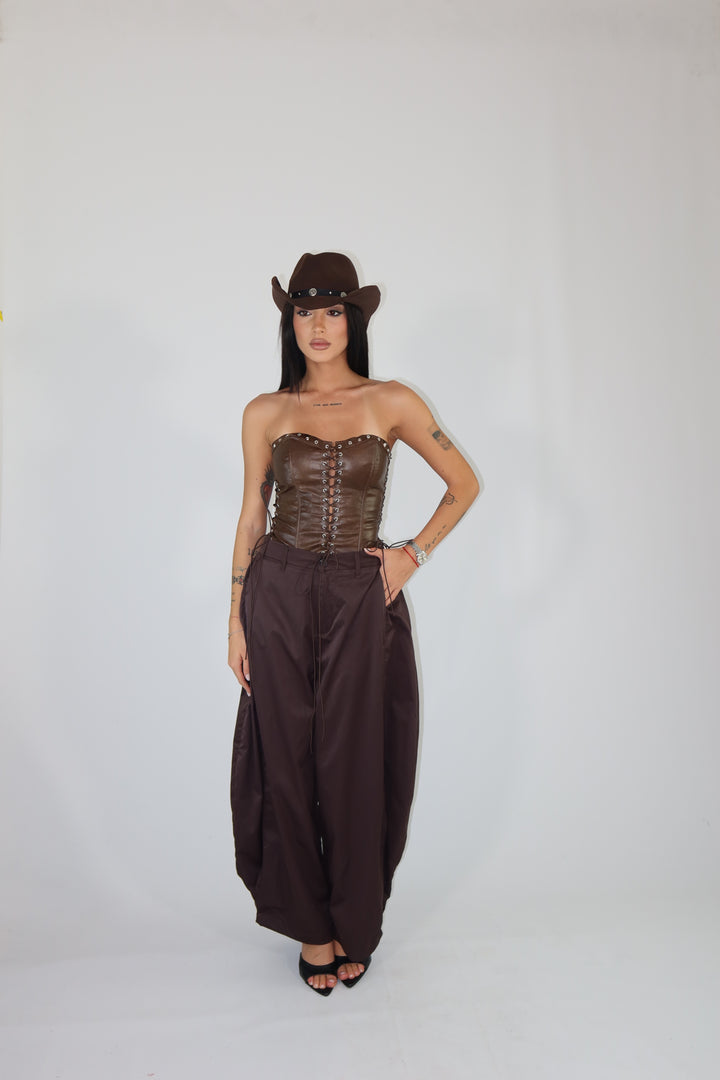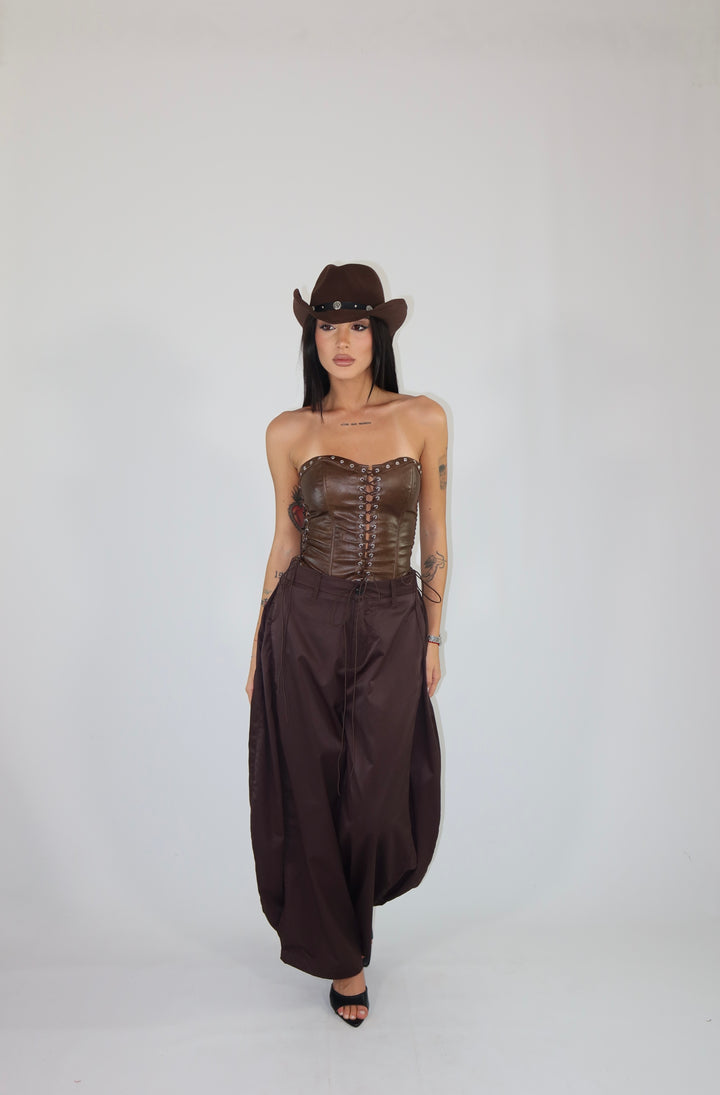 Corsetto in eco-pelle con lacci regolabili. La modella indossa la taglia S/M.