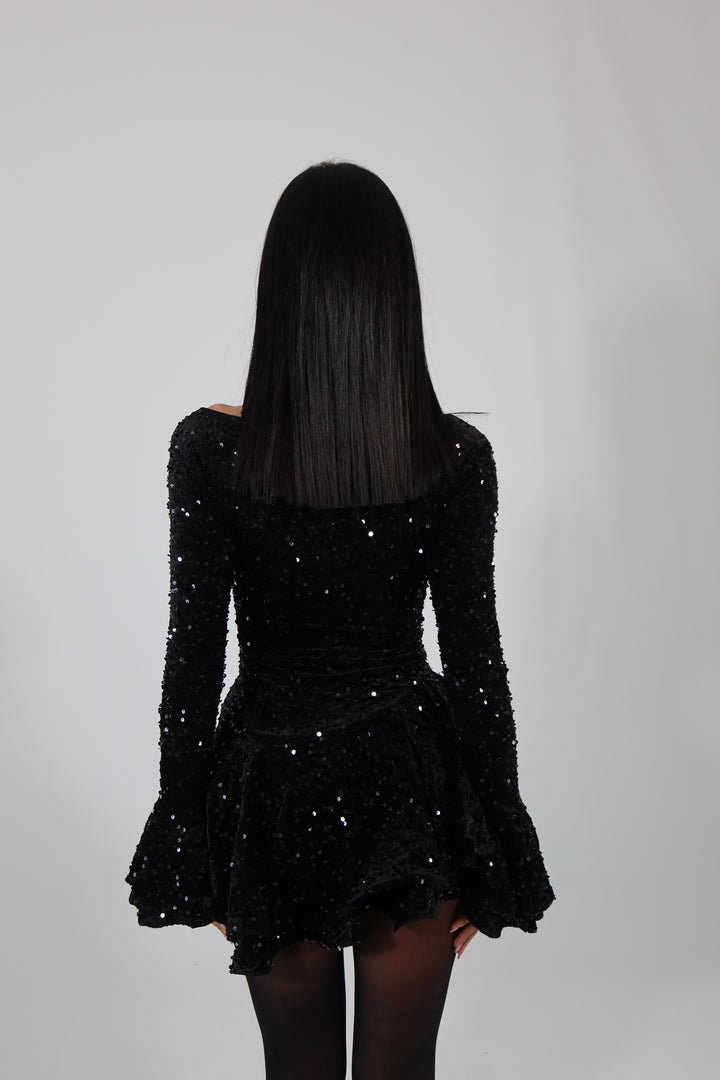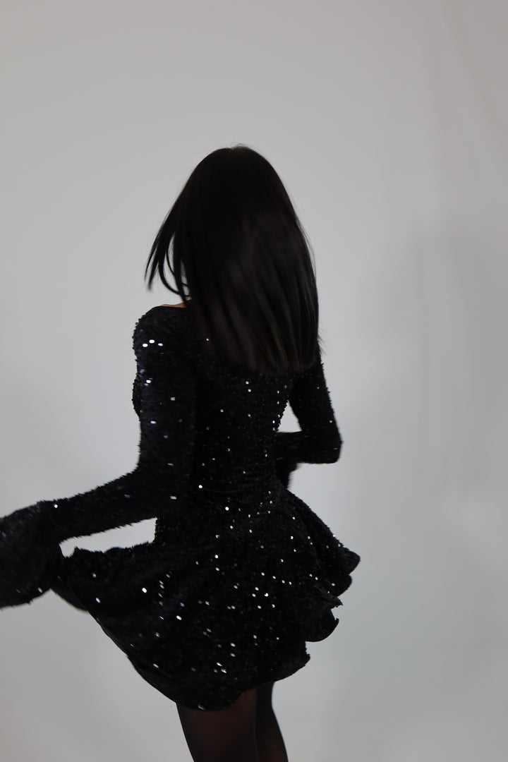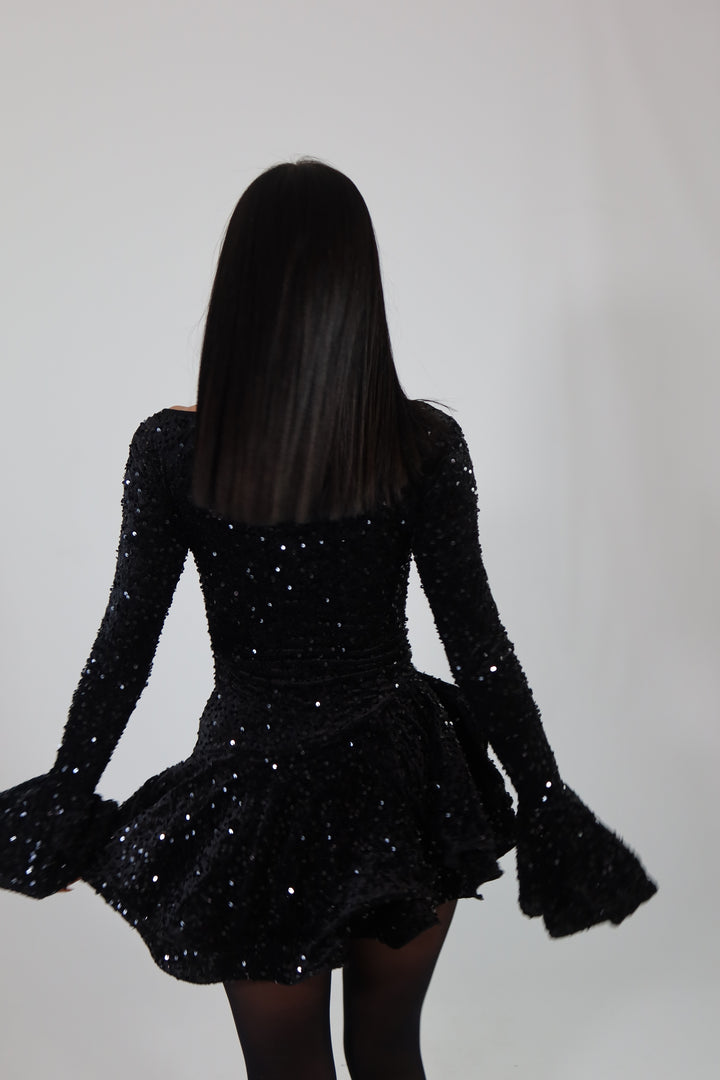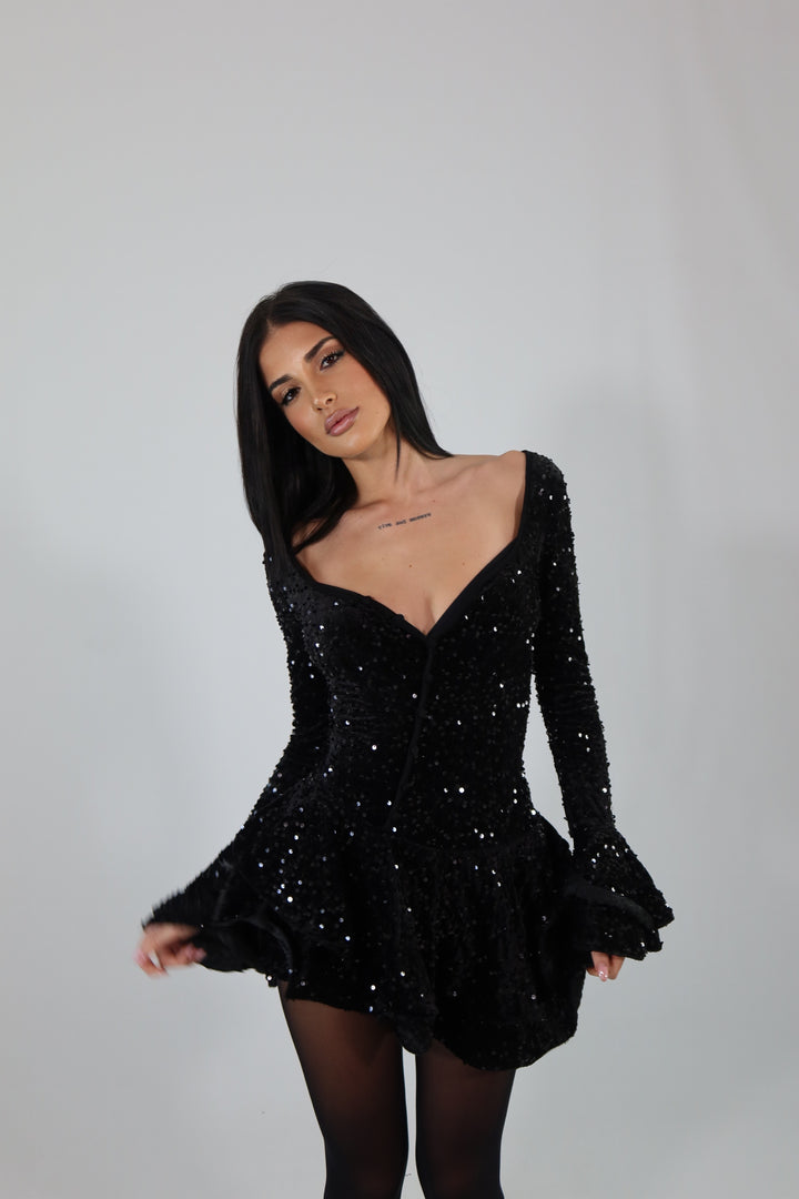 Dress in tessuto aderente ed elasticizzato con paillettes e culotte cucita. Si adatta da una XS ad una taglia M/L.