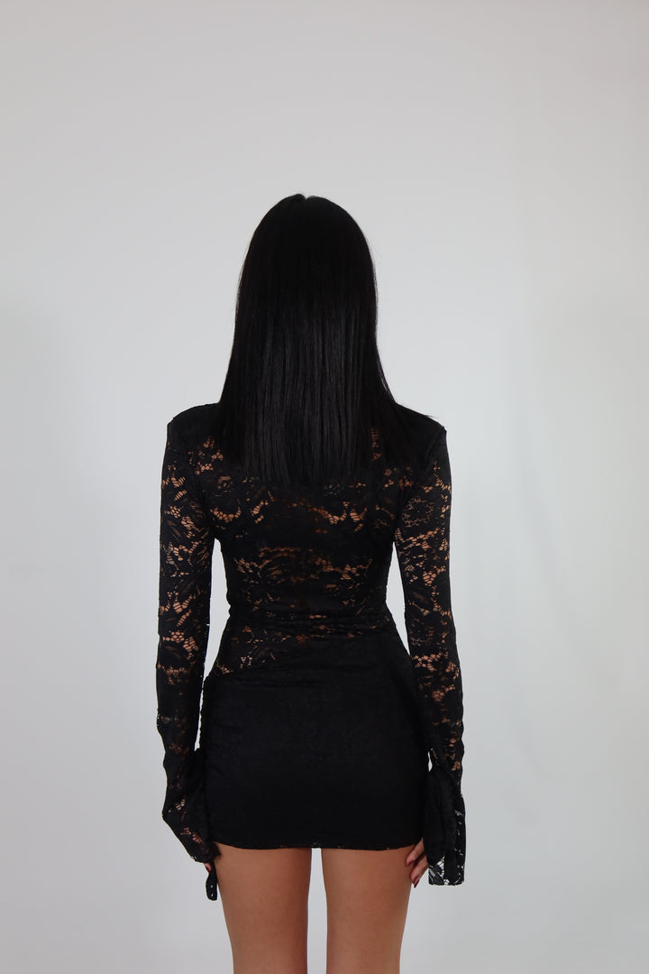 Mini dress a camicia di pizzo in tessuto aderente ed elasticizzato. Si adatta dalla XS ad una taglia M/L.