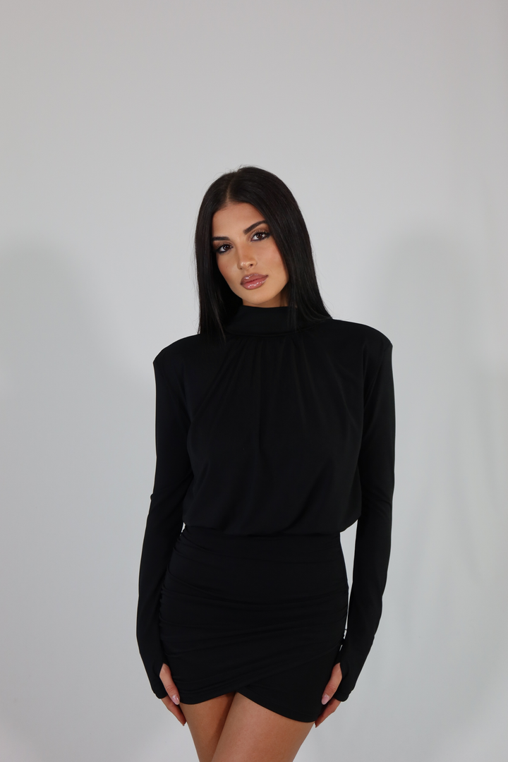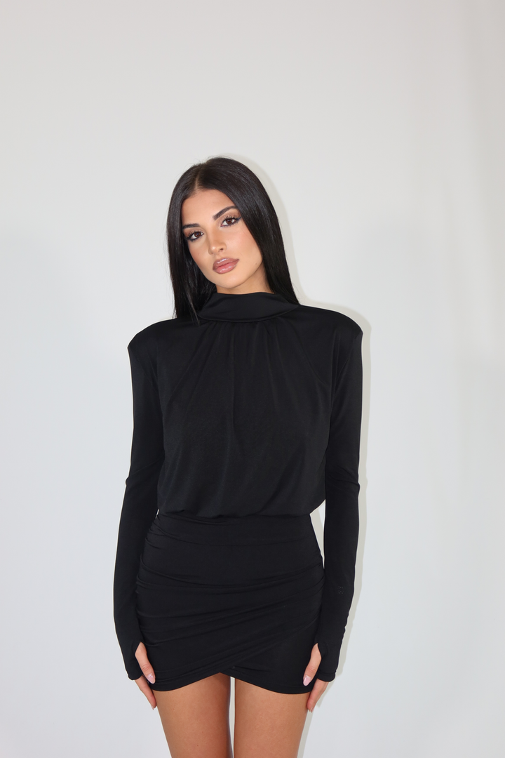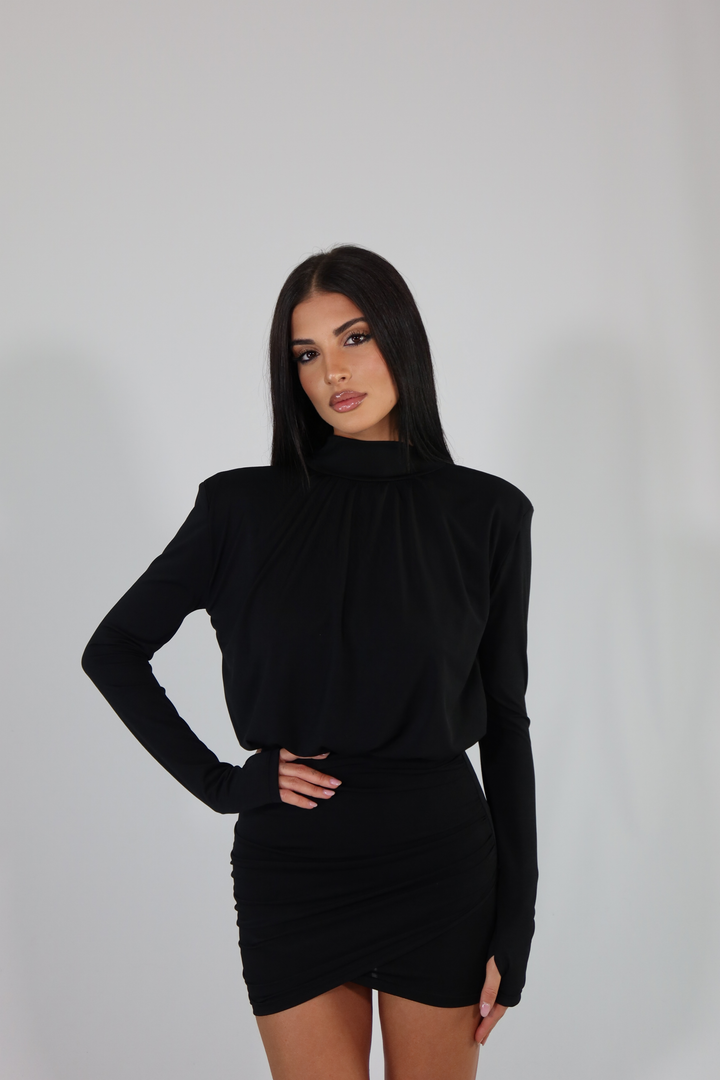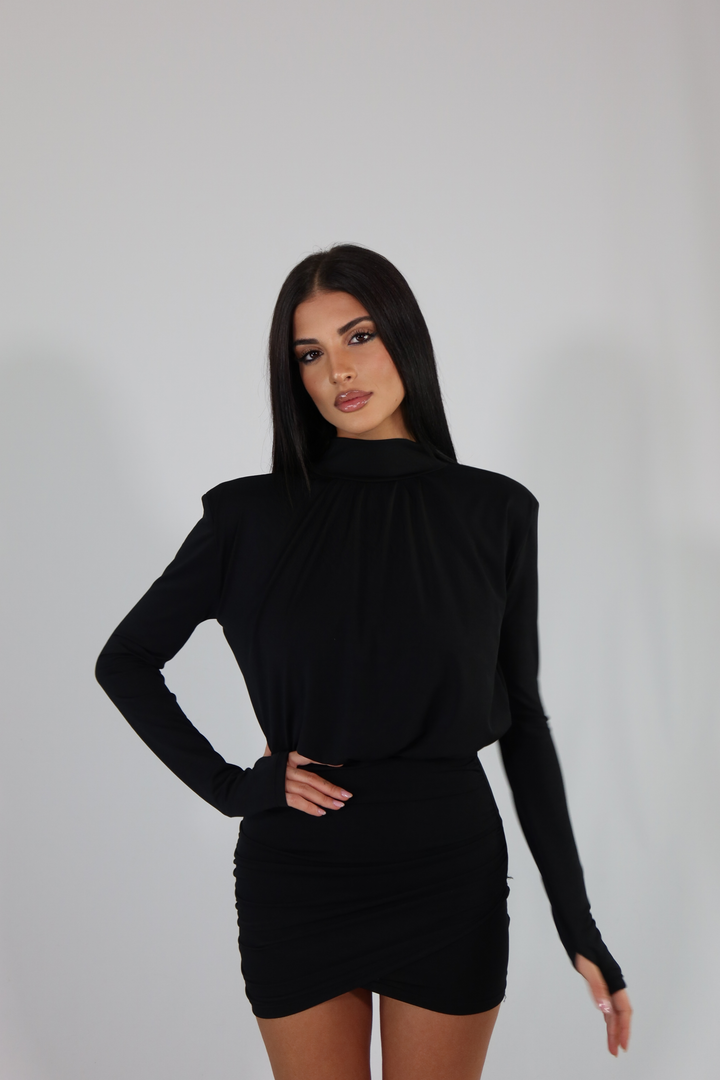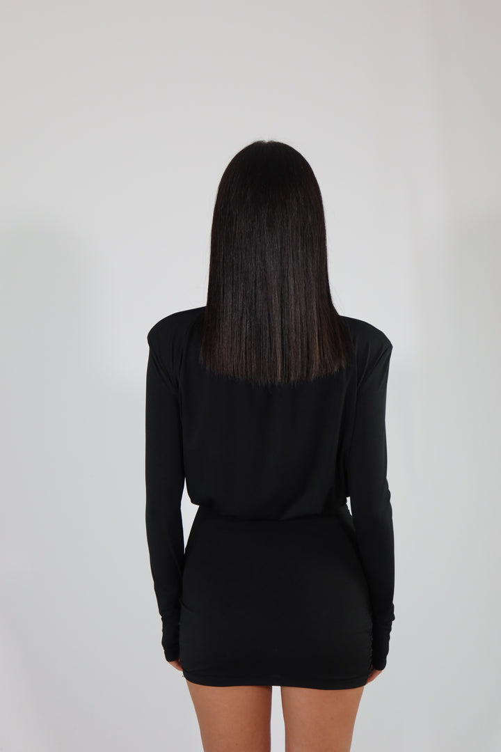 Mini dress manica lunga, spalline imbottite e gonna aderente ed elasticizzata. L’abito si adatta dalla taglia XS alla taglia M/L.