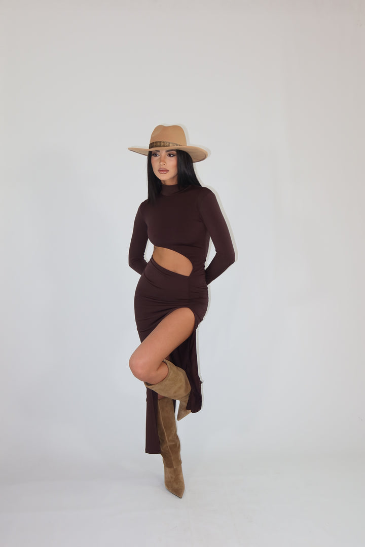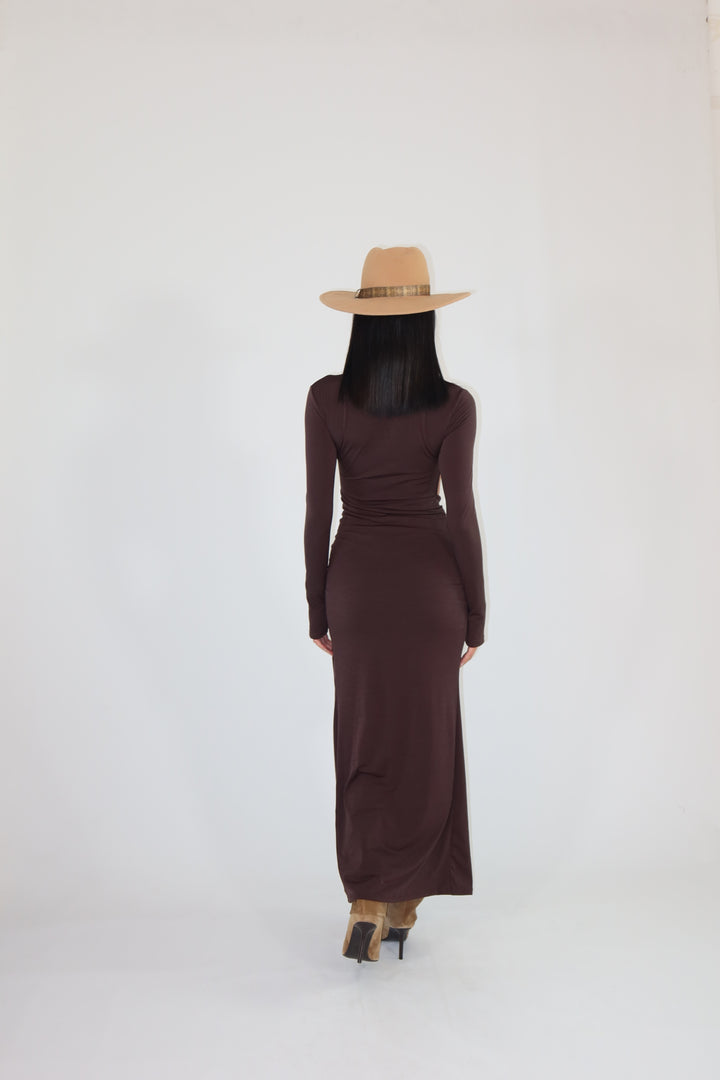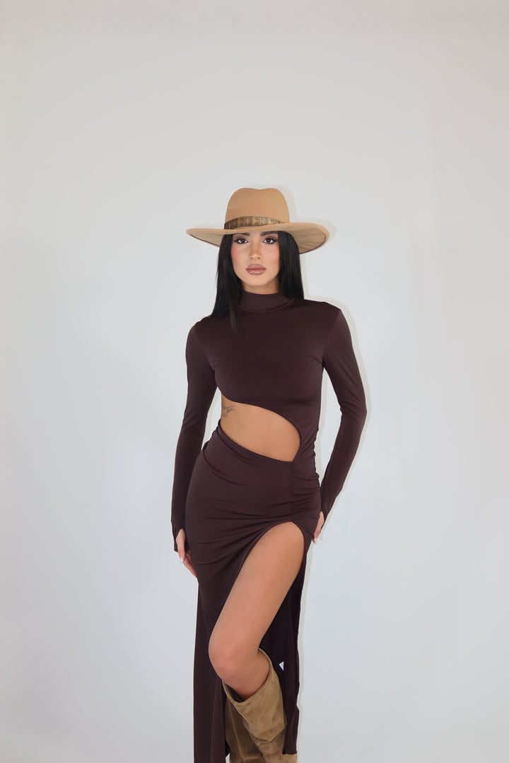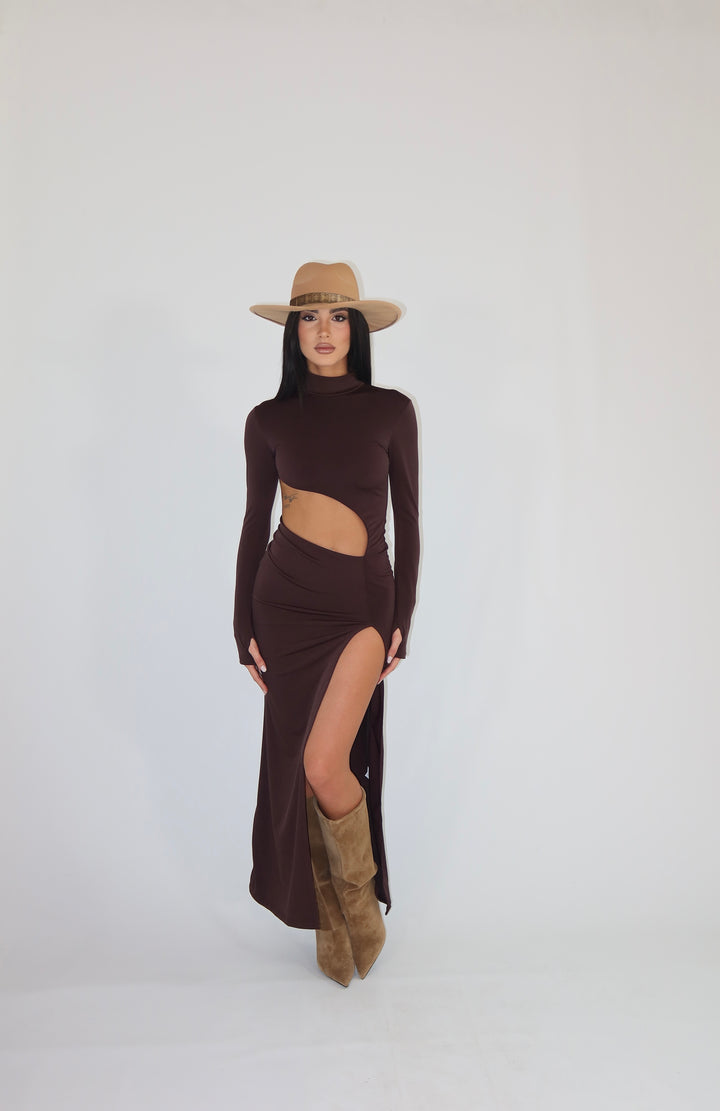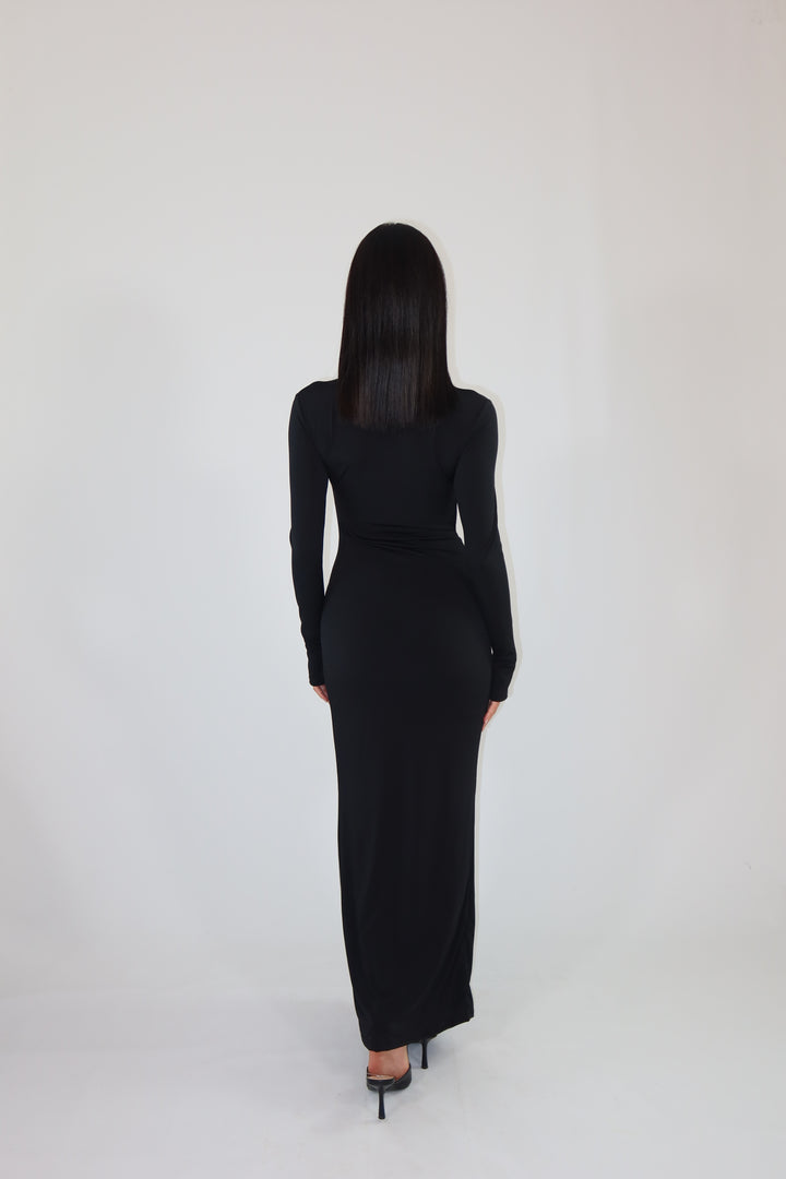 Dress lungo in tessuto aderente ed elasticizzato con cut out e spacco. Si adatta dalla XS ad una taglia M/L.
