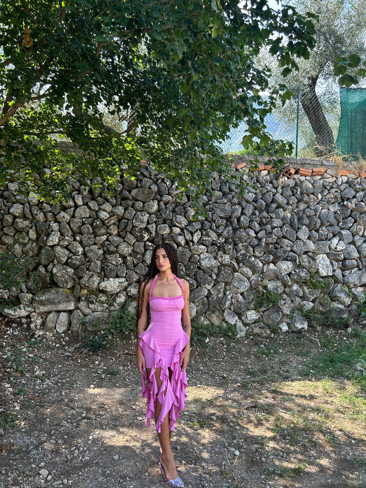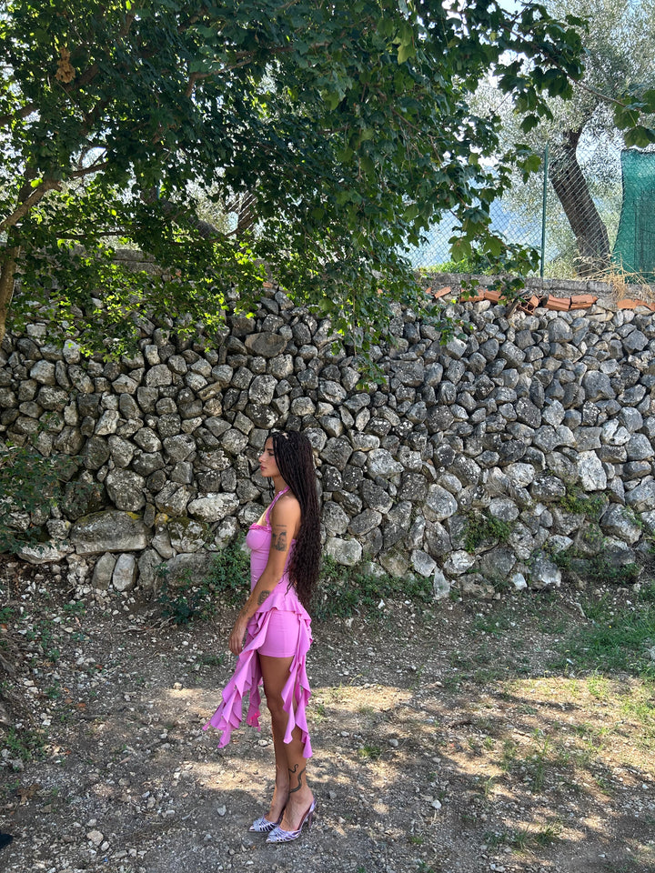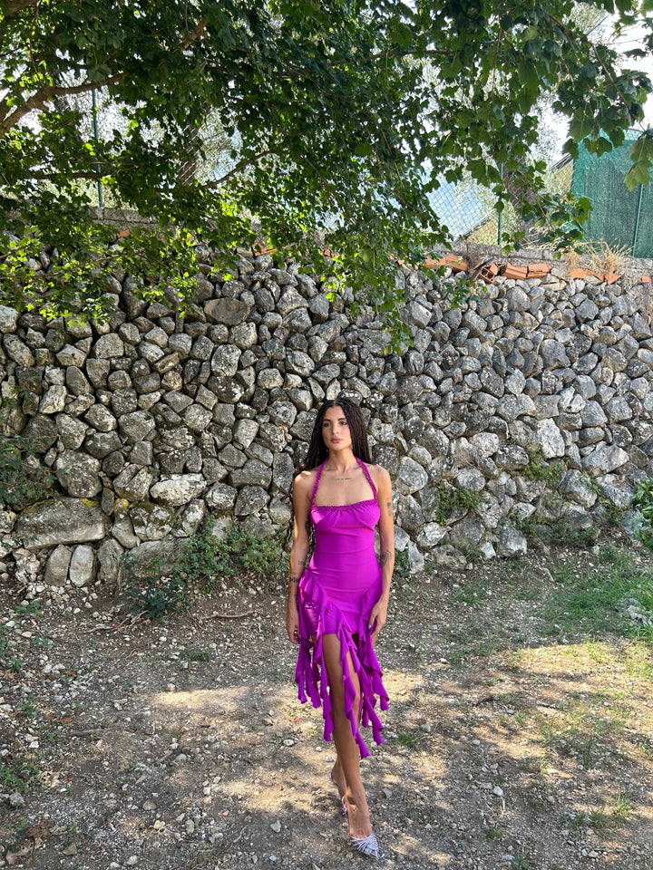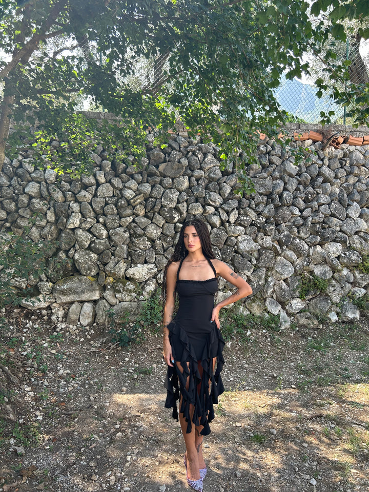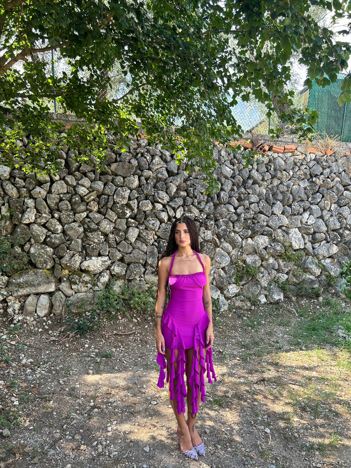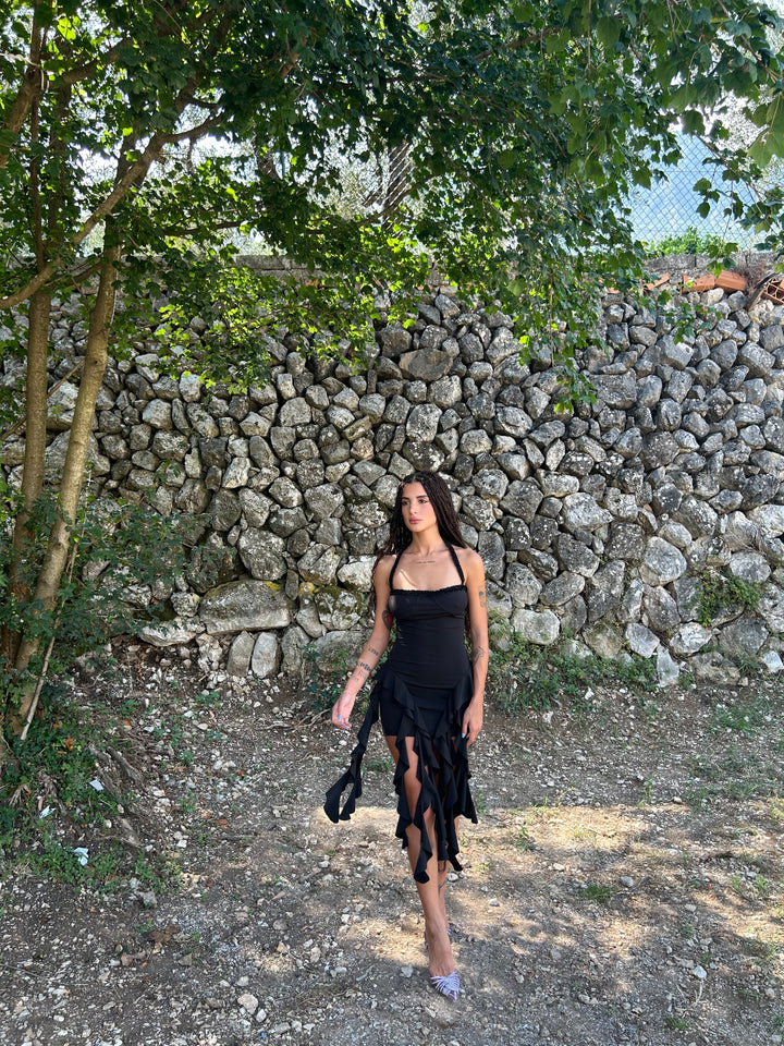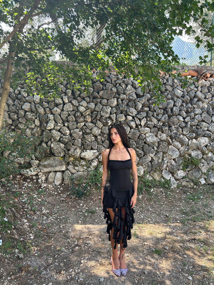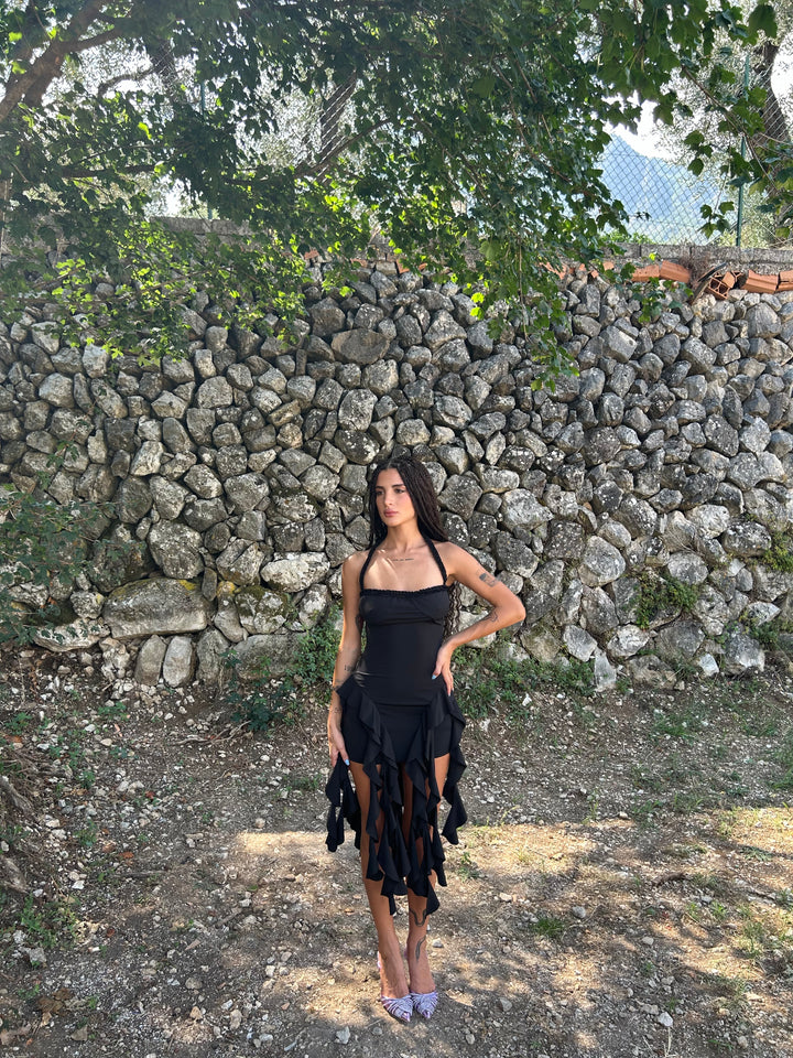 Abito corto con volant lunghi, tessuto lycra elastico .