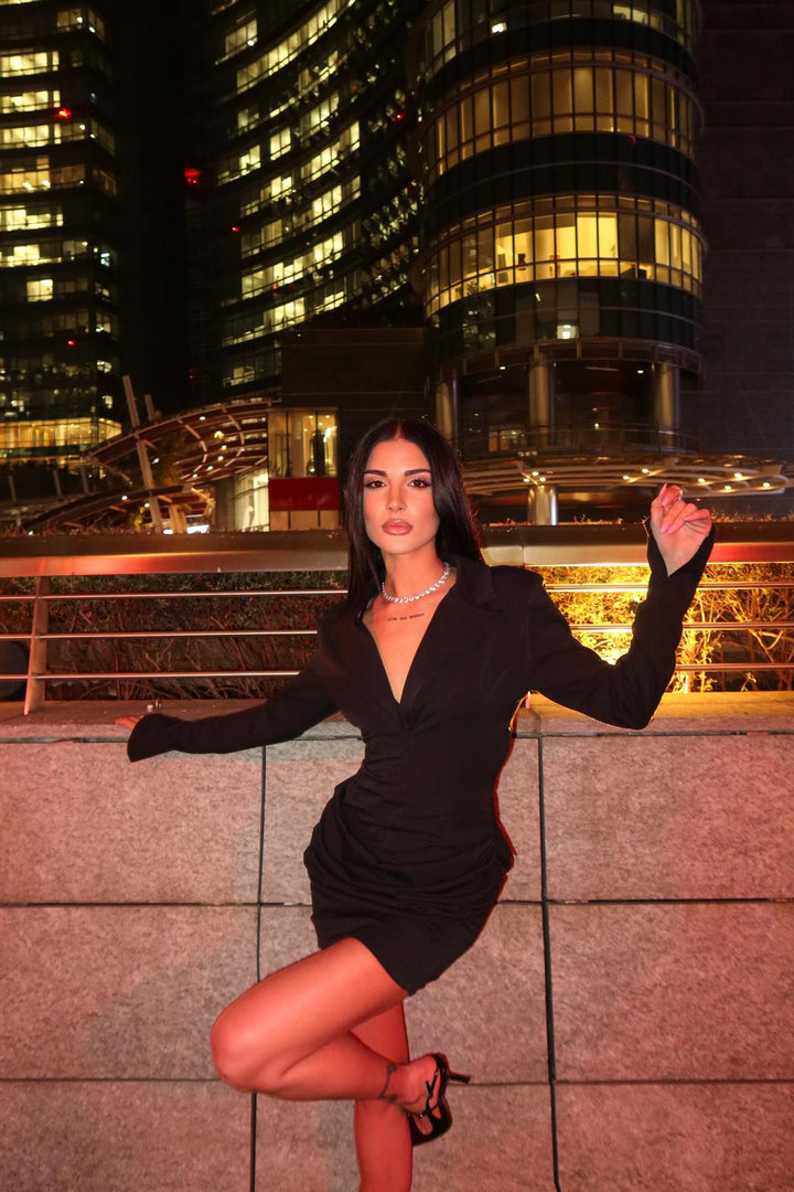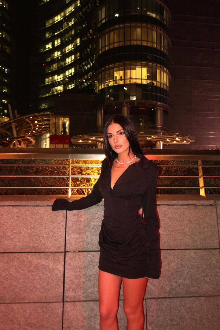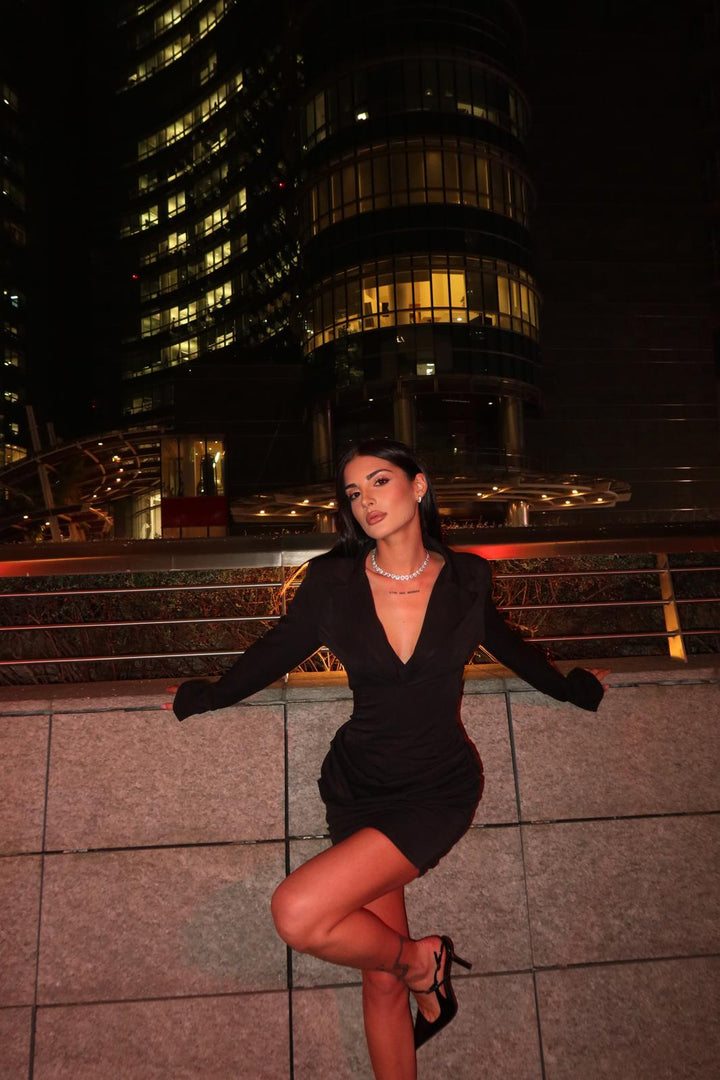 Vestito strutturato a giacca, con scollo sul seno e regolabile dietro i fianchi con cinturino. Si adatta dalla XS ad una taglia M/L.