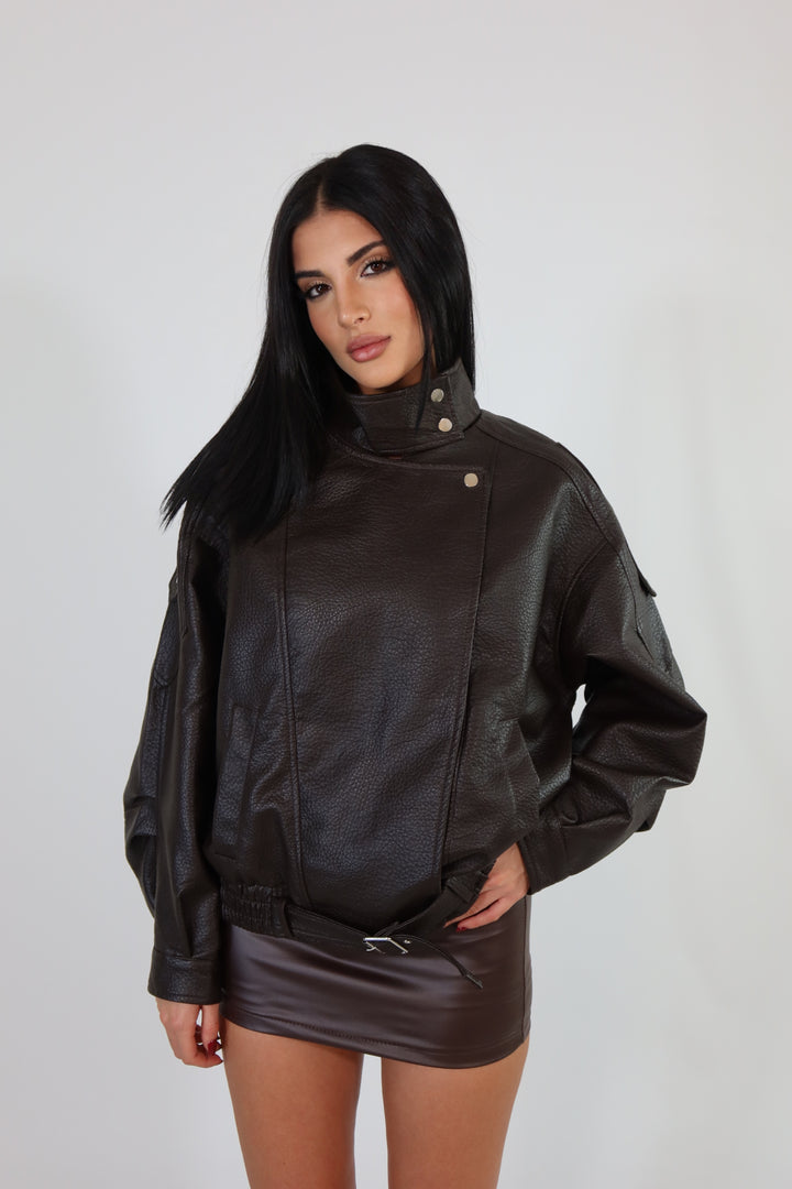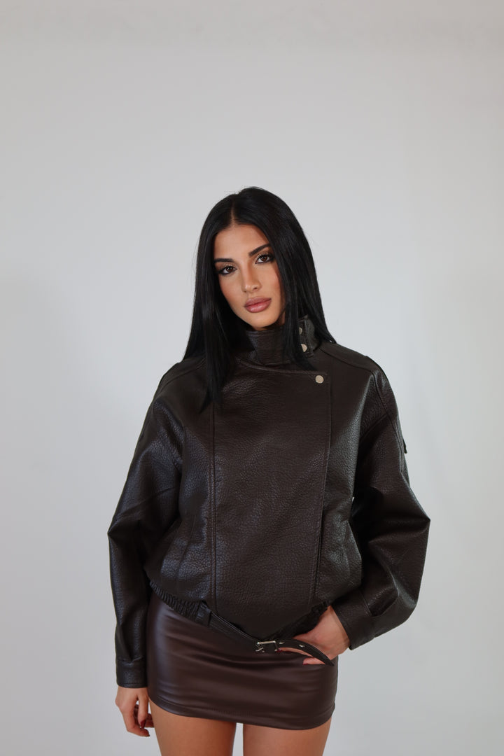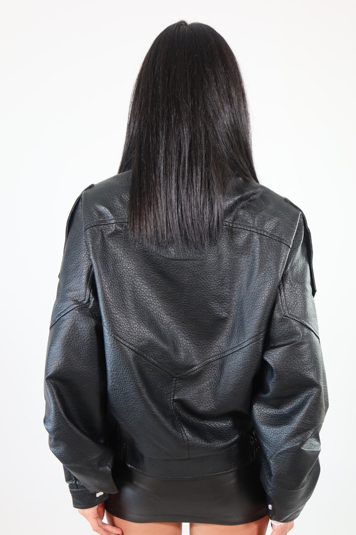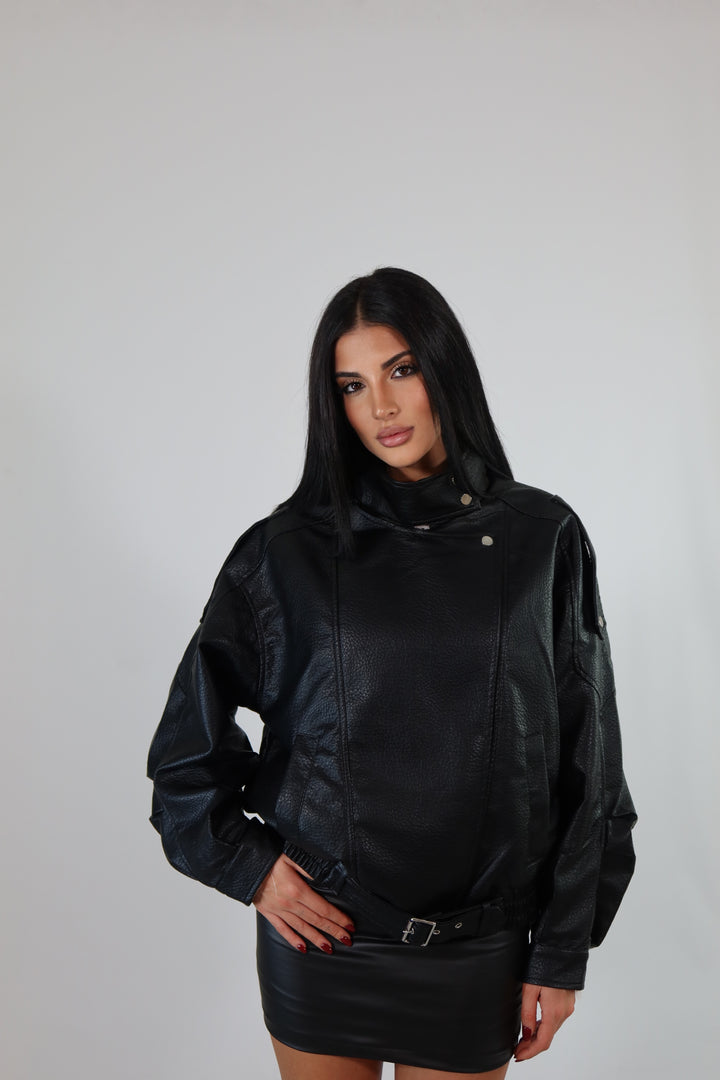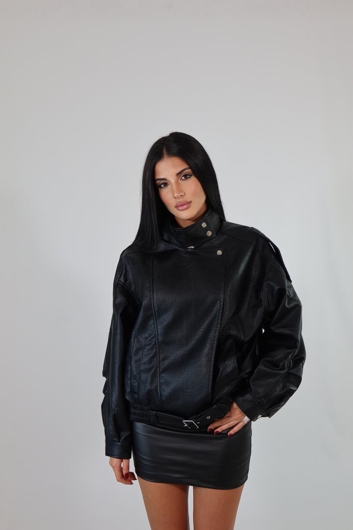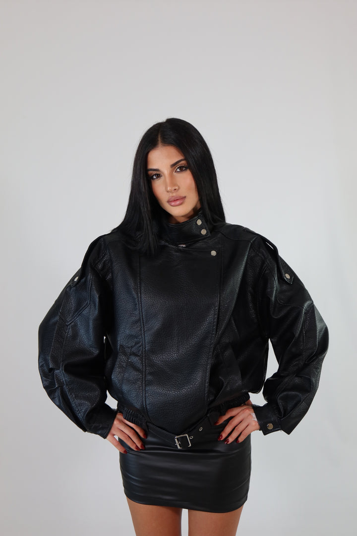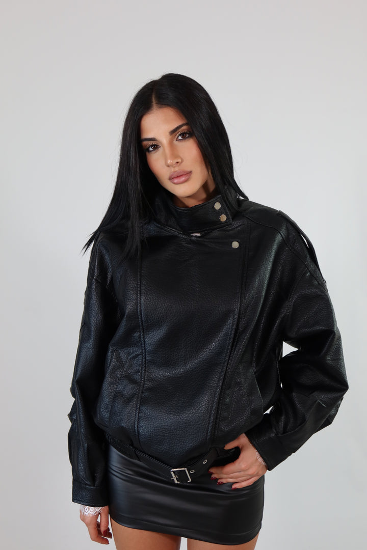 Chiodo in ecopelle martellata dalla vestibilità over. Il giubbino si adatta da una XS ad una taglia M/L.