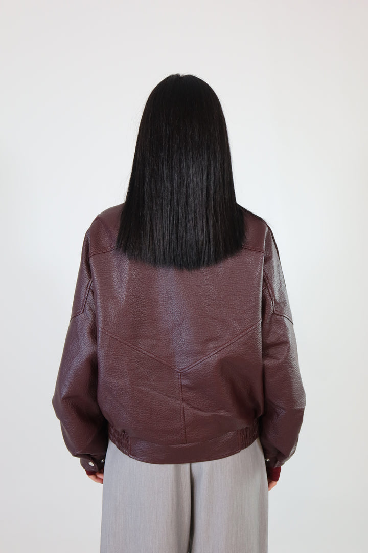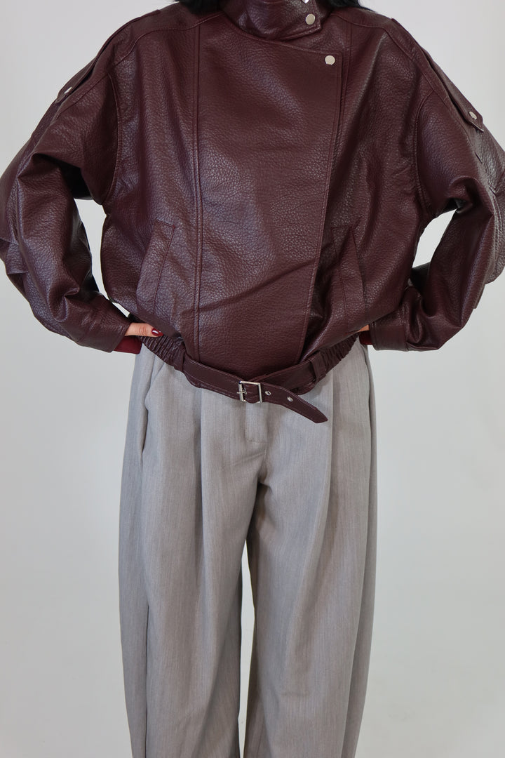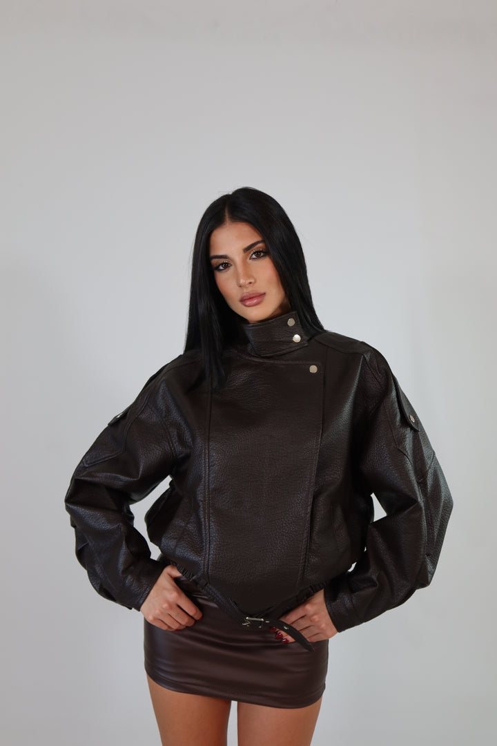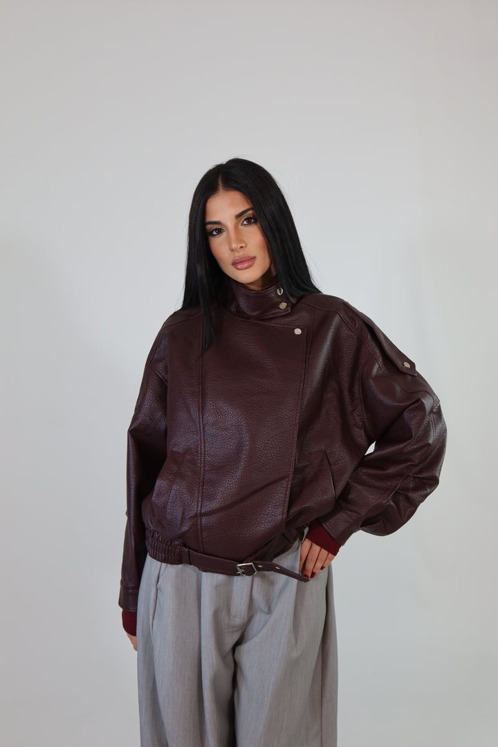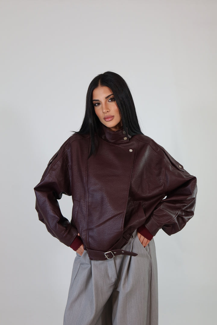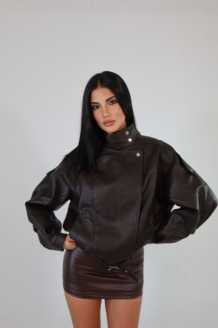 Chiodo in ecopelle martellata dalla vestibilità over. Il giubbino si adatta da una XS ad una taglia M/L.