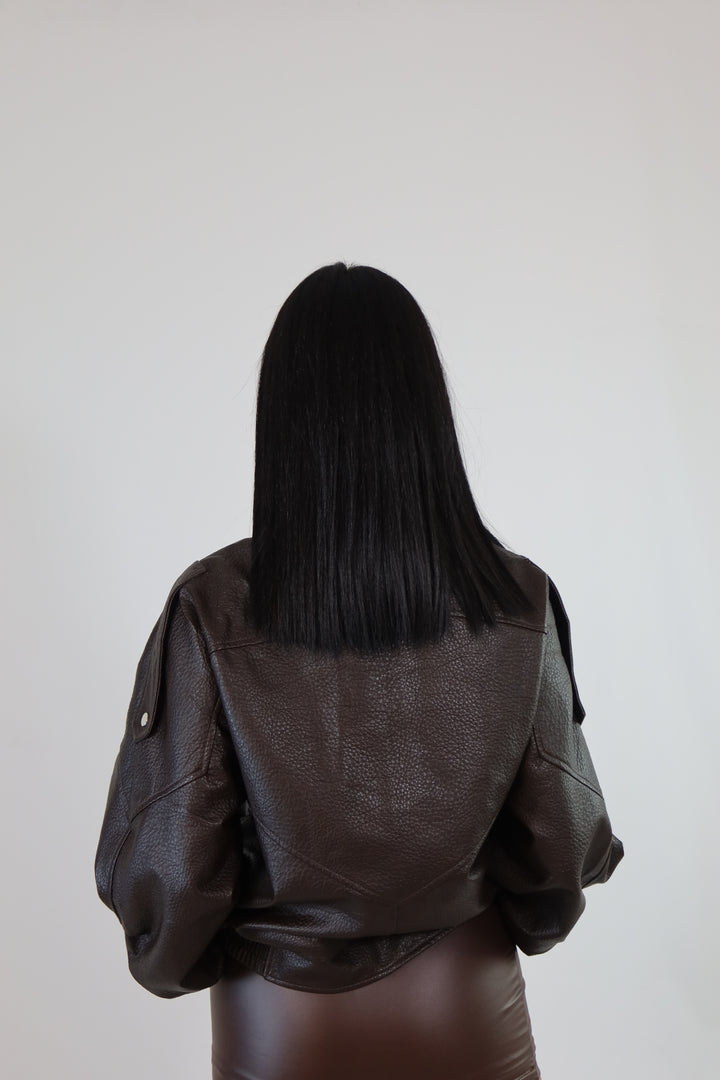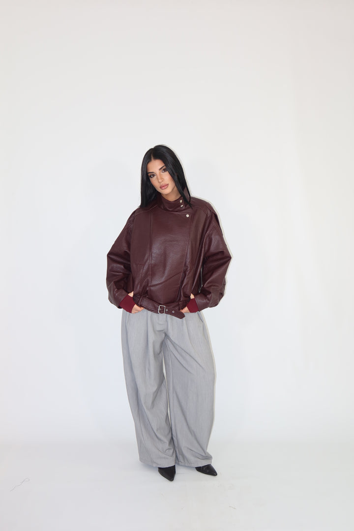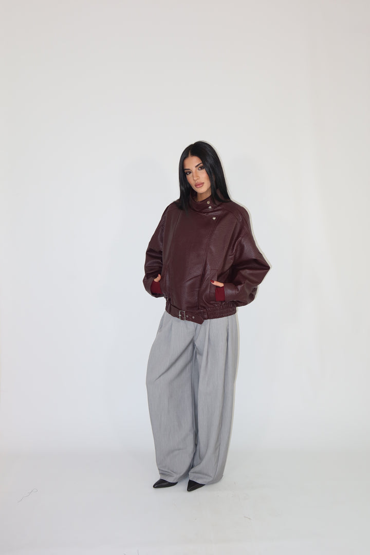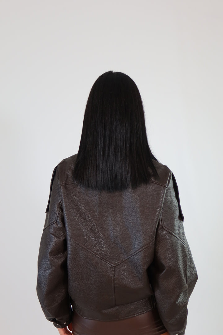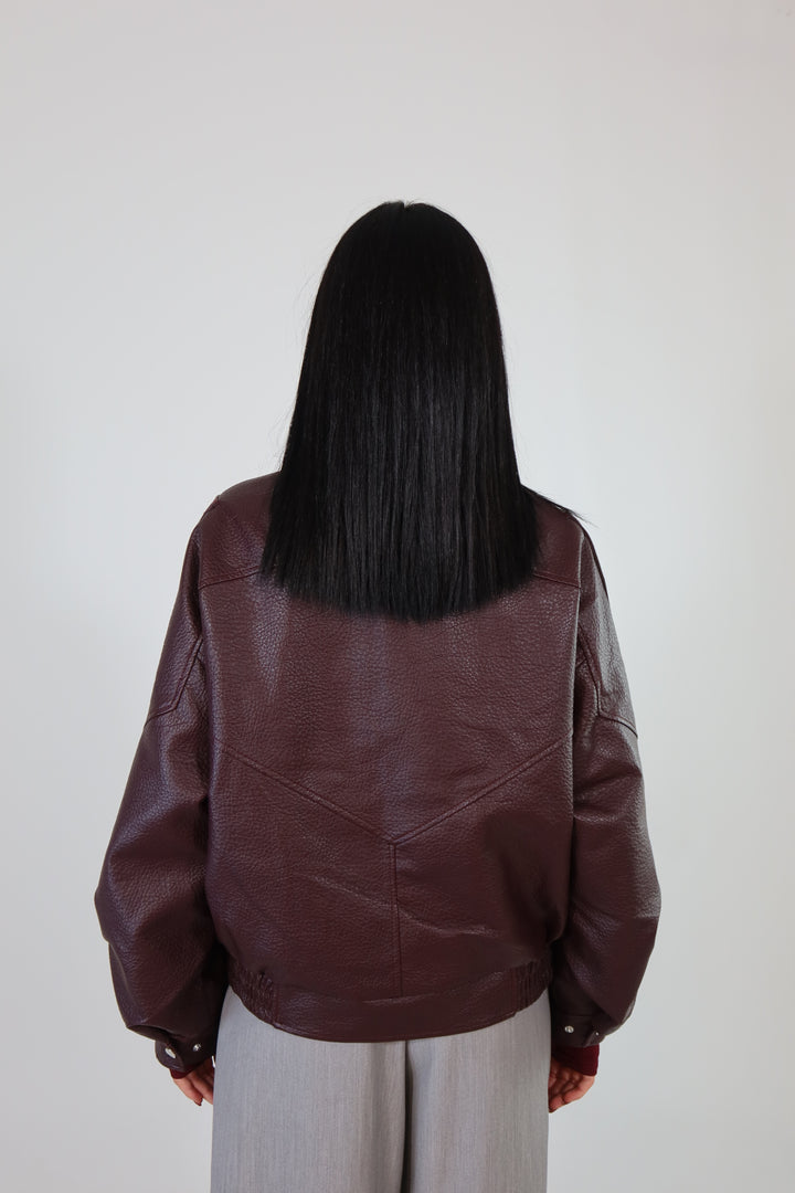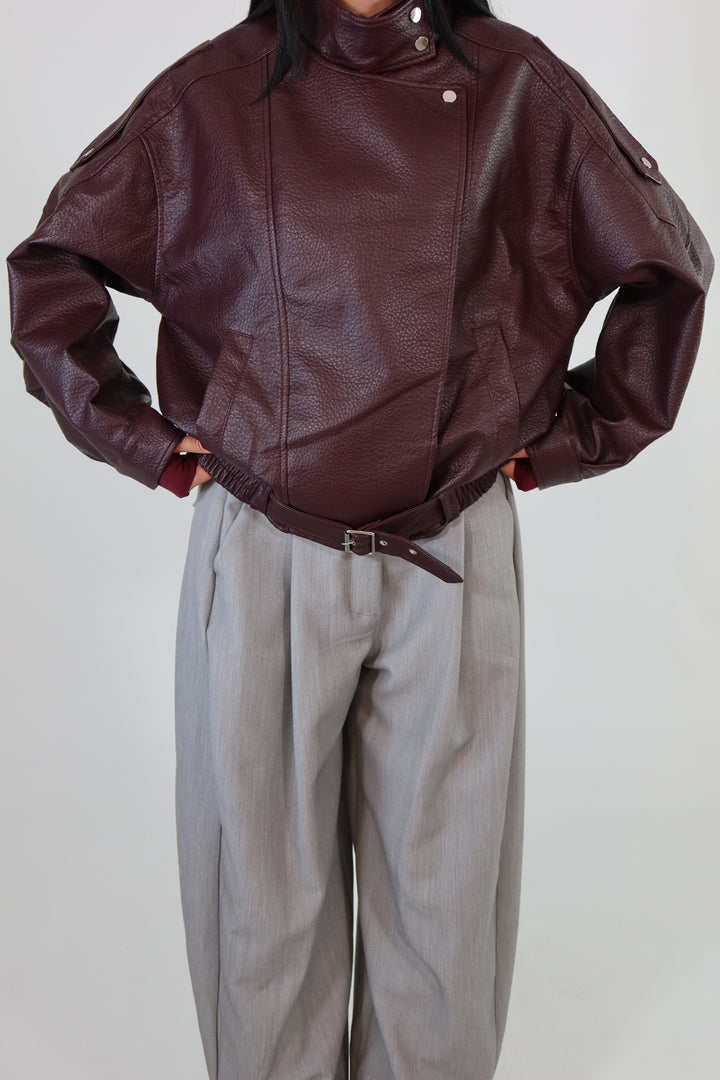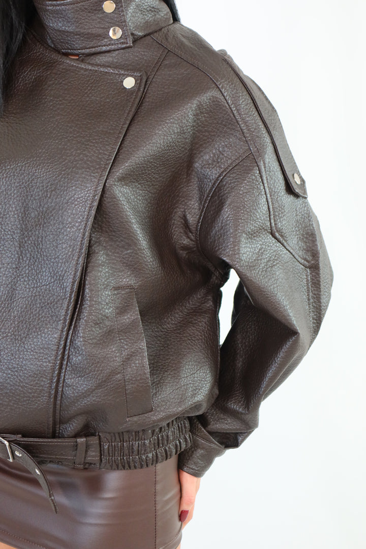 Chiodo in ecopelle martellata dalla vestibilità over. Il giubbino si adatta da una XS ad una taglia M/L.