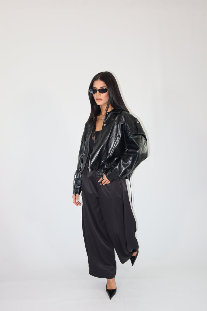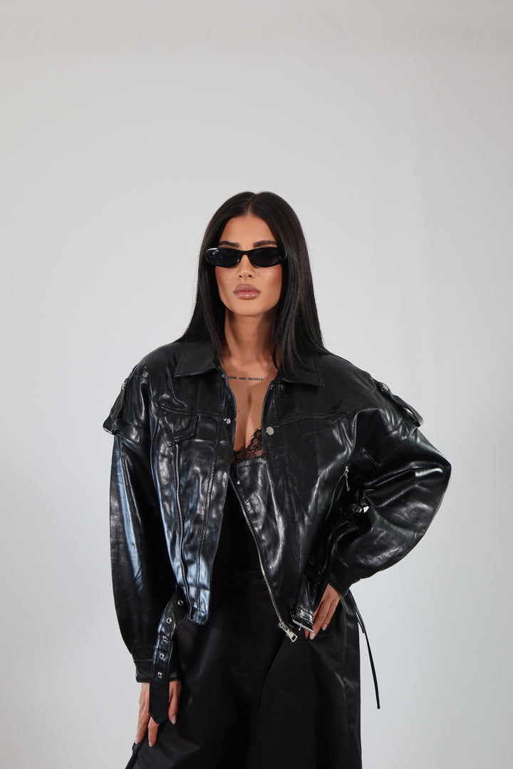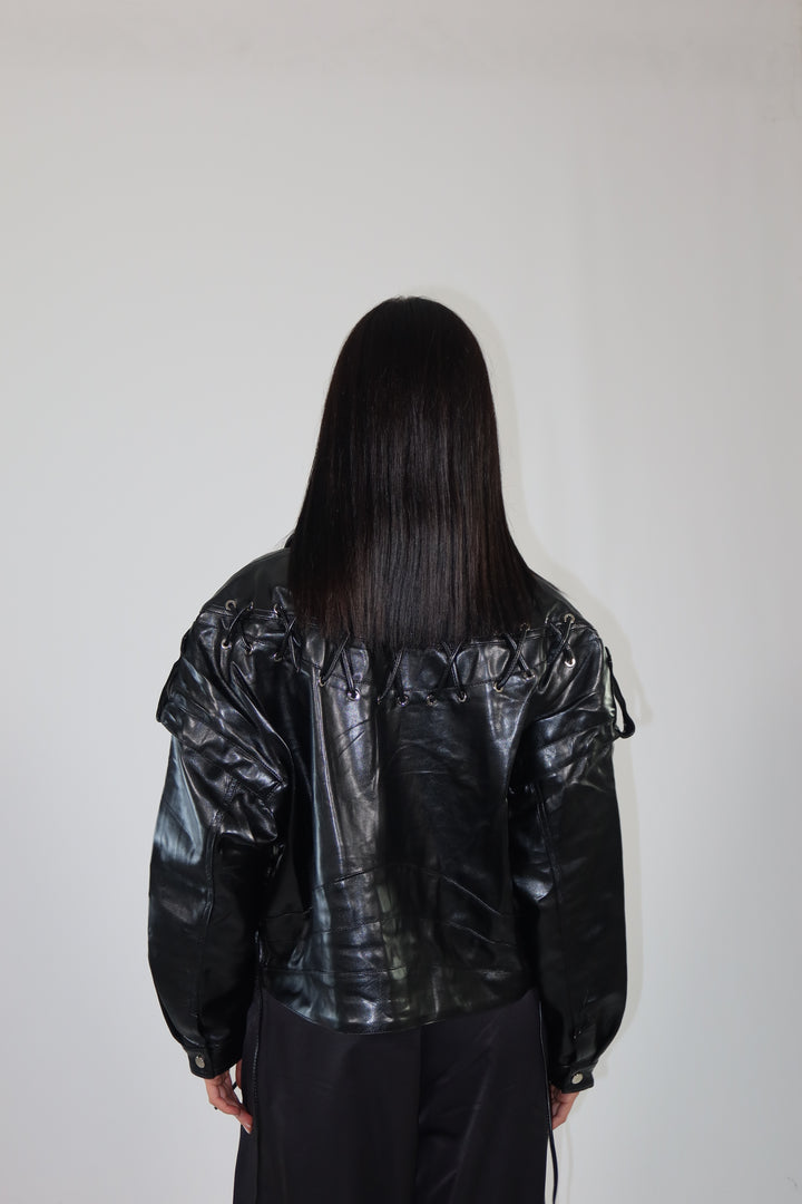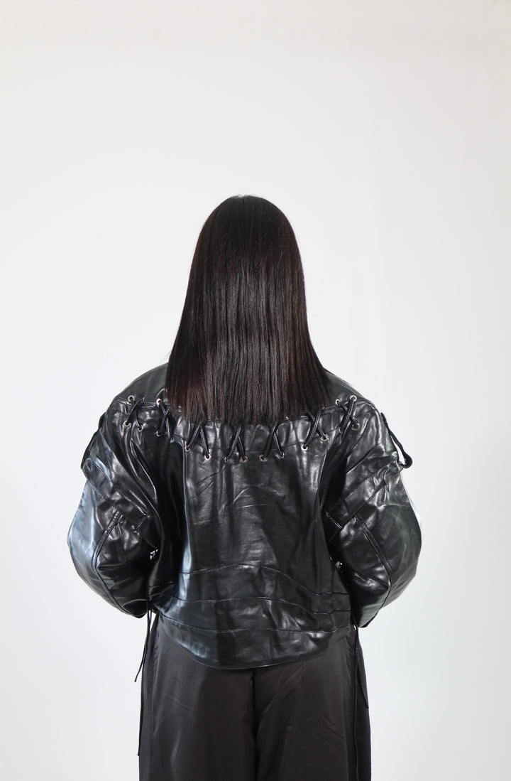 Giubbotto in ecopelle con stringhe decorative. La modella indossa la taglia S/M.