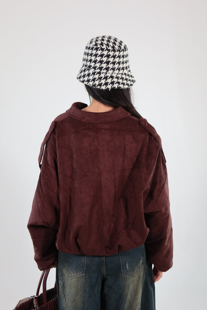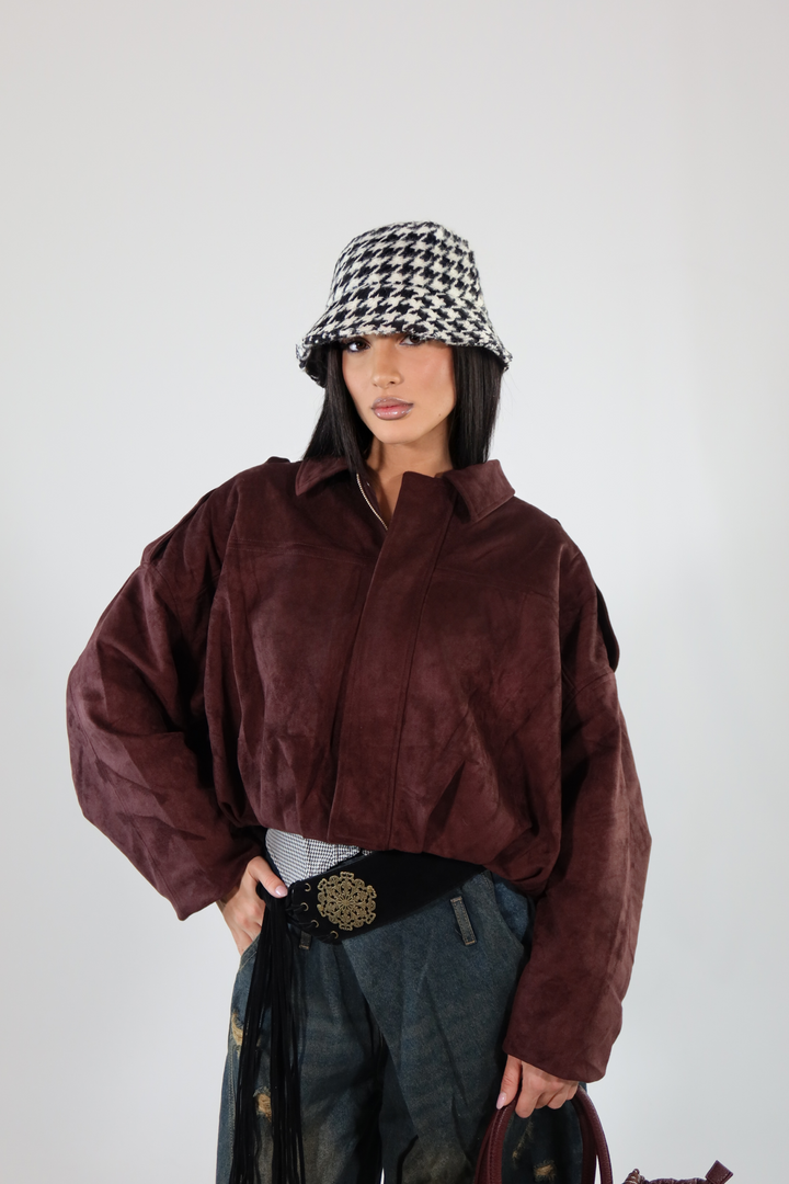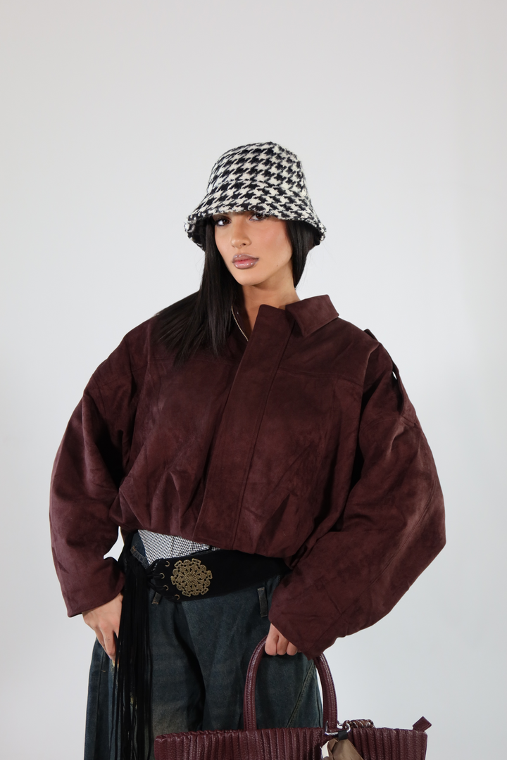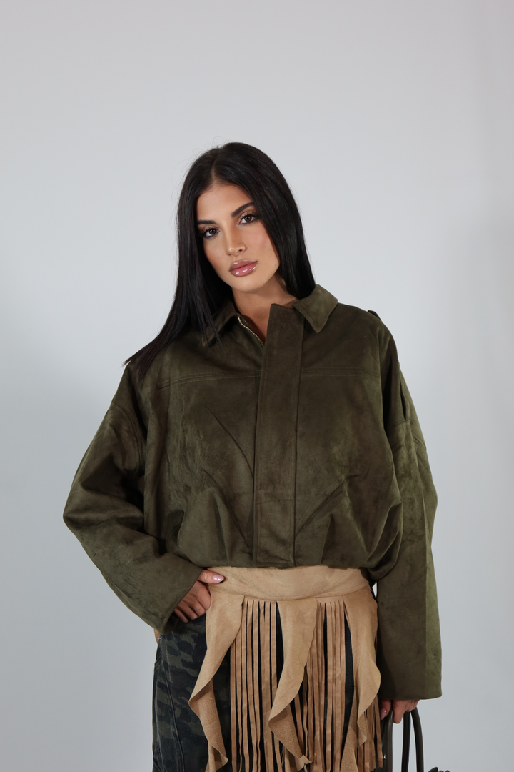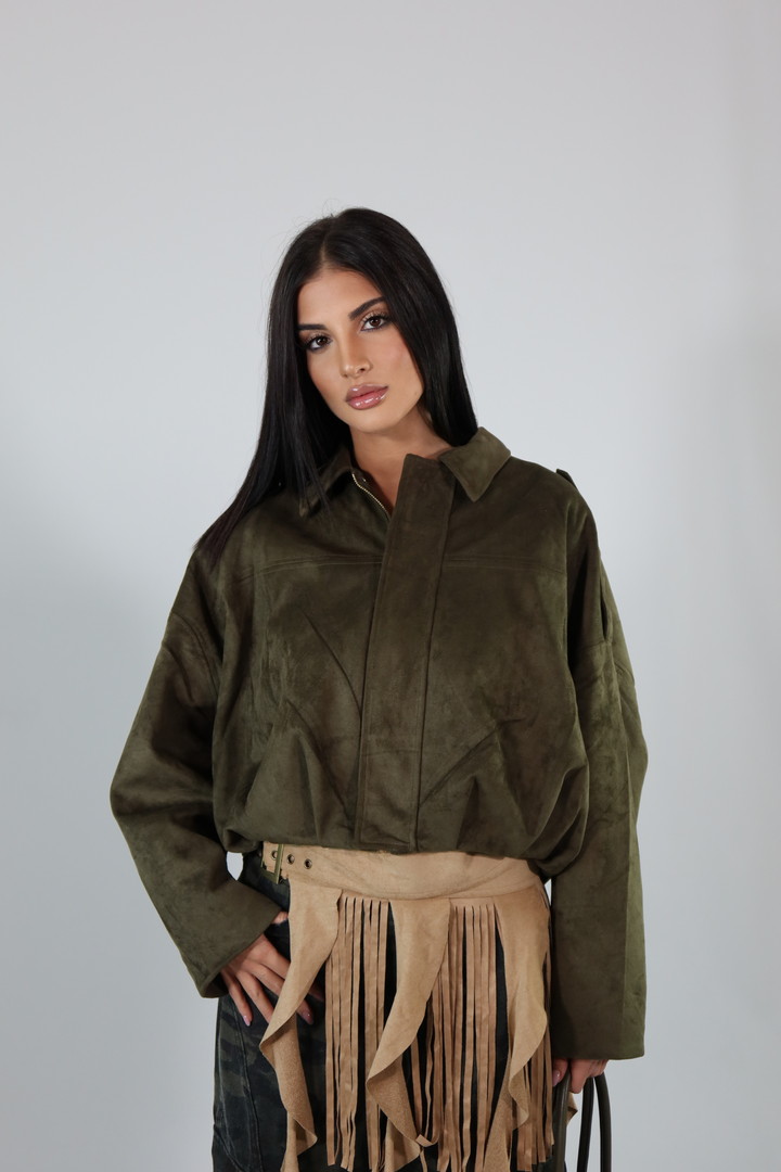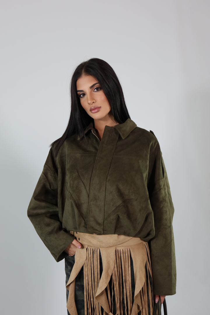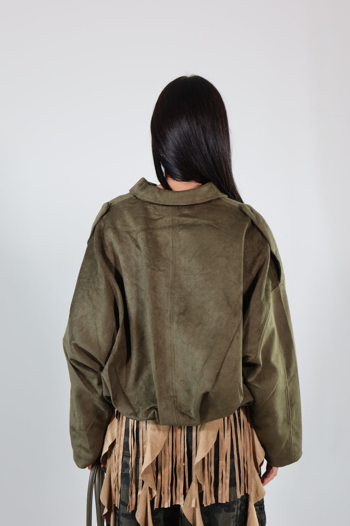Giubbotto in camoscio con zip dalla vestibilità over, foderato all’interno. Si adatta dalla XS ad una taglia M/L.