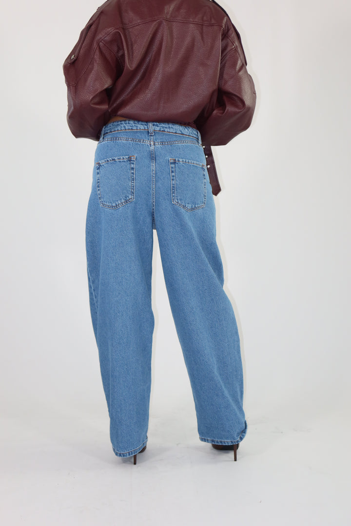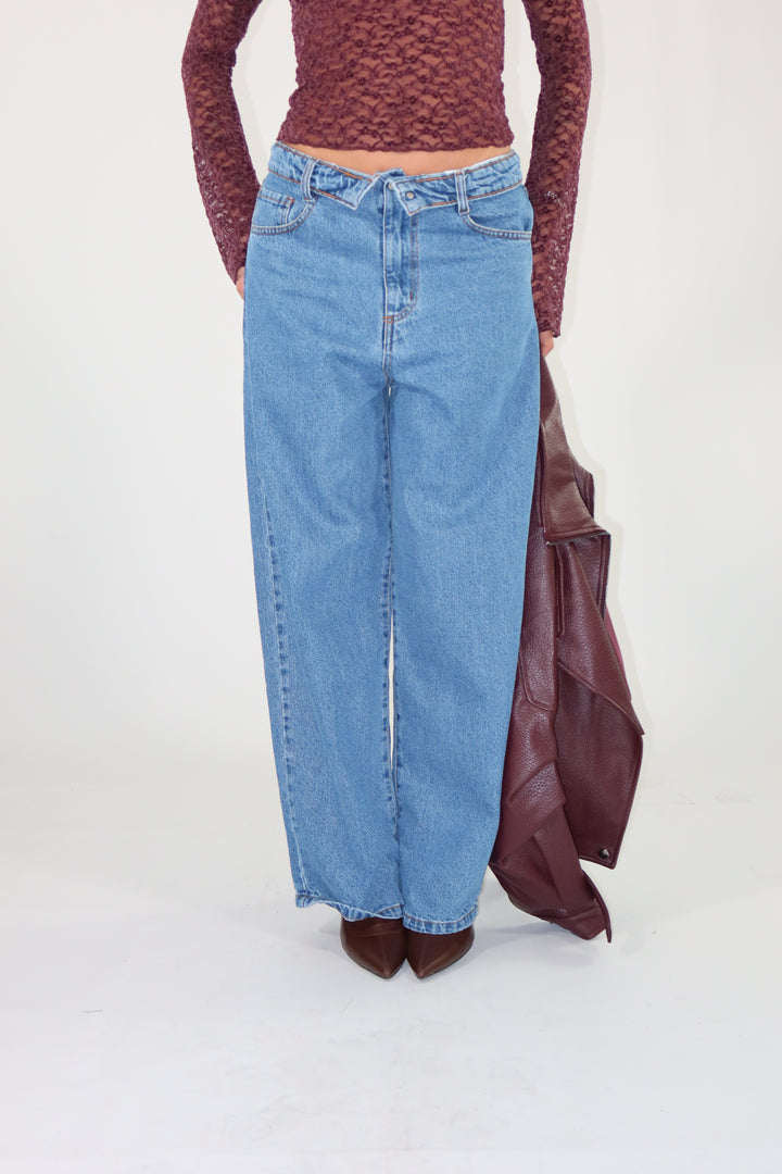 Jeans lavaggio medio con piegone in vita. La modella per un effetto più over indossa la taglia M ed è alta 1.72.