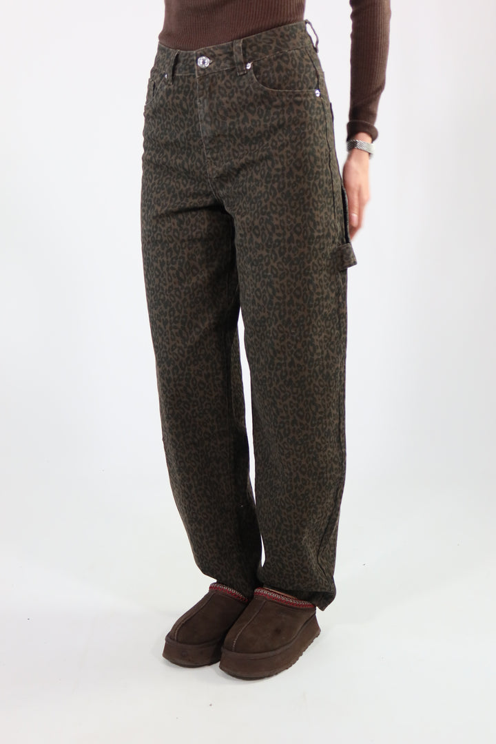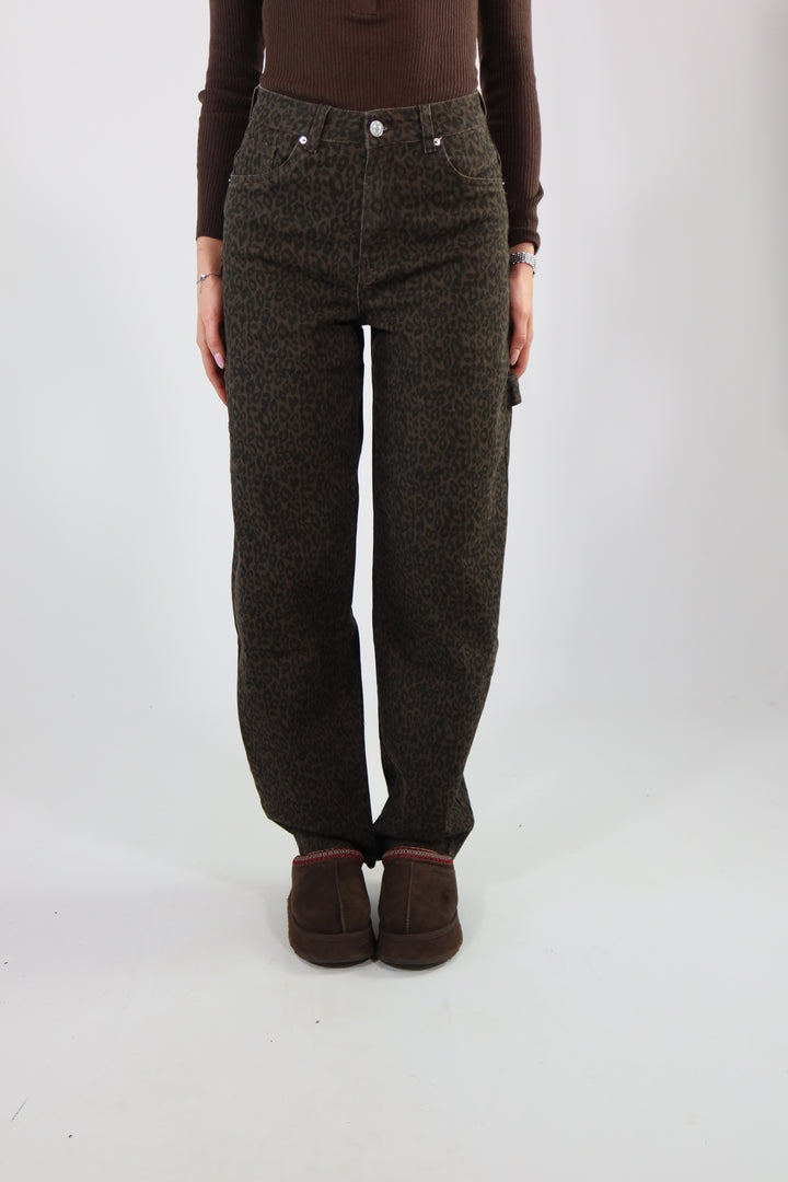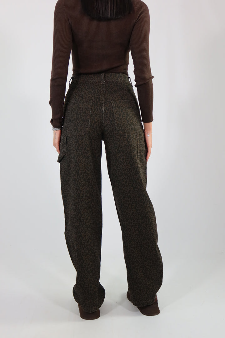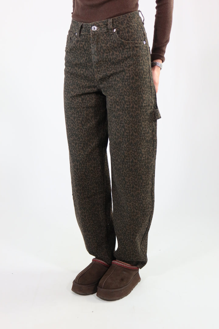 Jeans animalier a vita alta. La modella indossa la taglia 34 (XS) ed é alta 1.72.