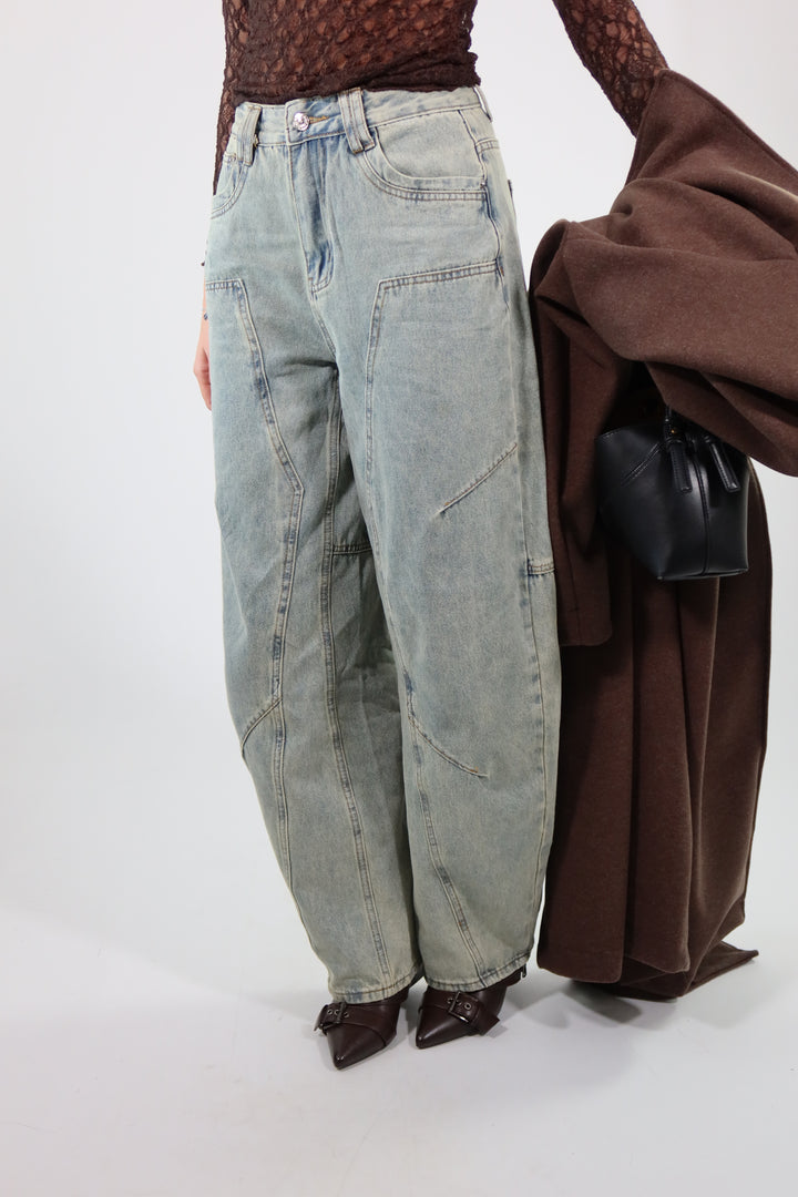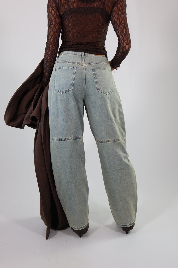 Jeans carpenter slavato, la modella indossa la taglia S ed è alta 1.72.