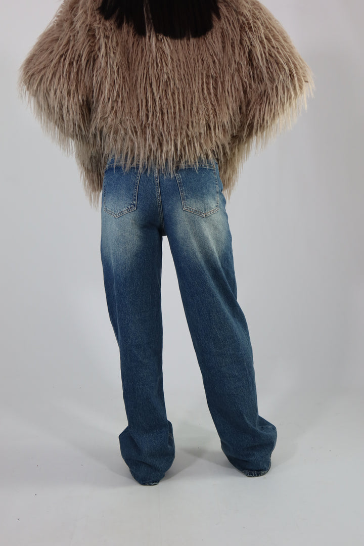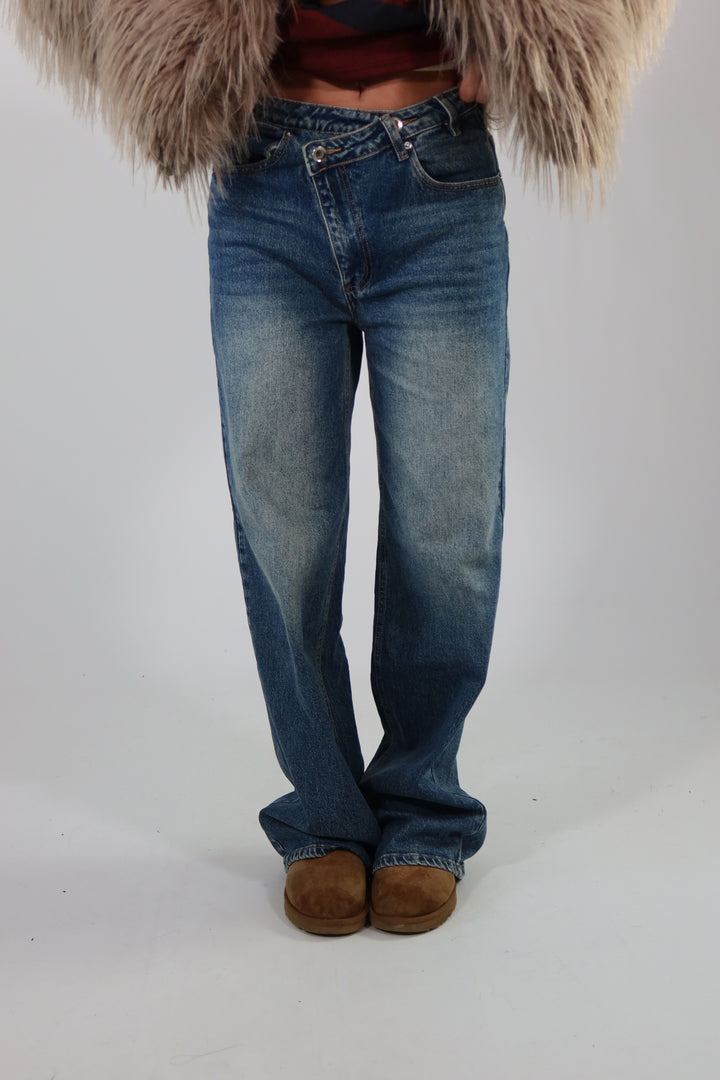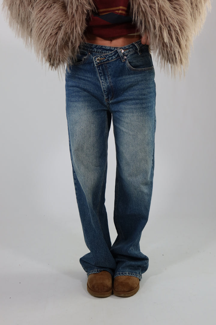 Jeans morbido asimmetrico, la modella indossa la taglia 36 (S) ed è alta 1.72.