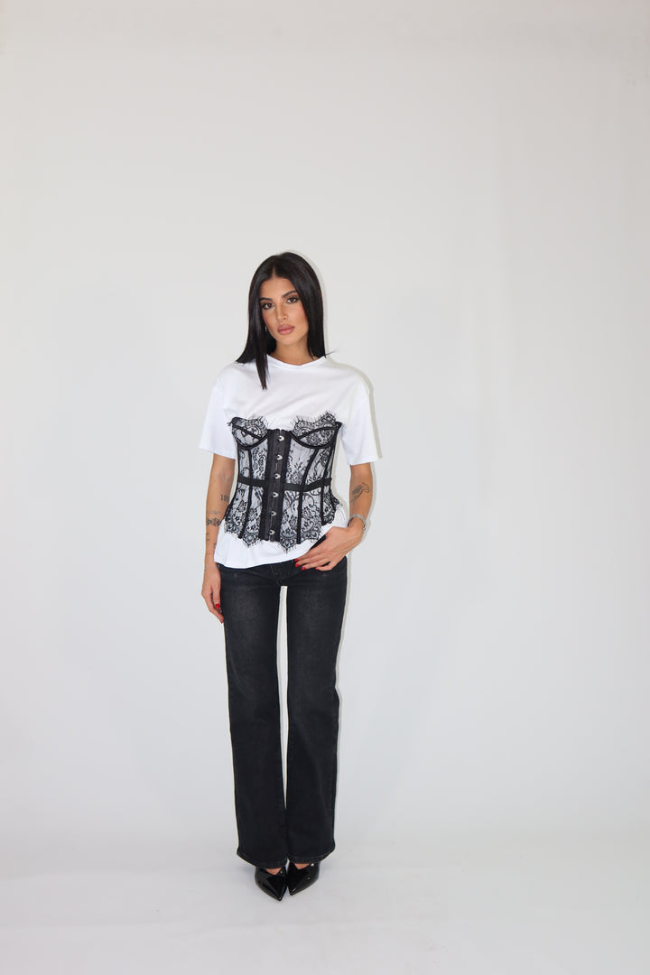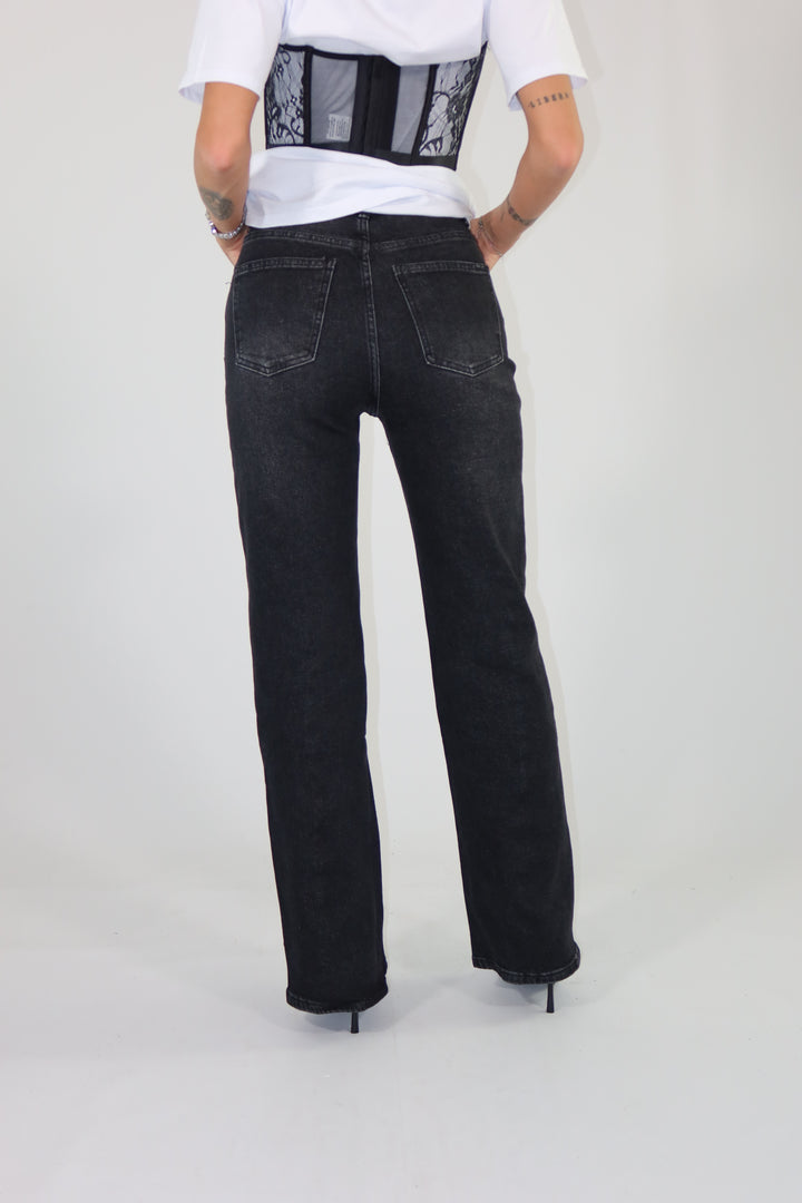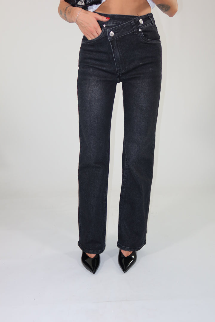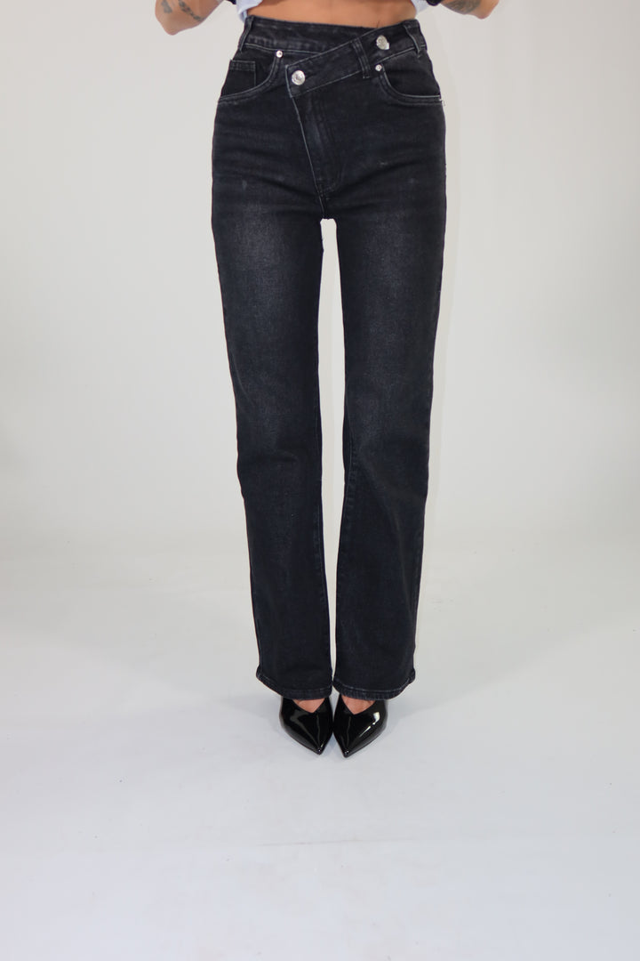 Jeans con bottone asimmetrico, la modella indossa una taglia XS ed è alta 1.72.