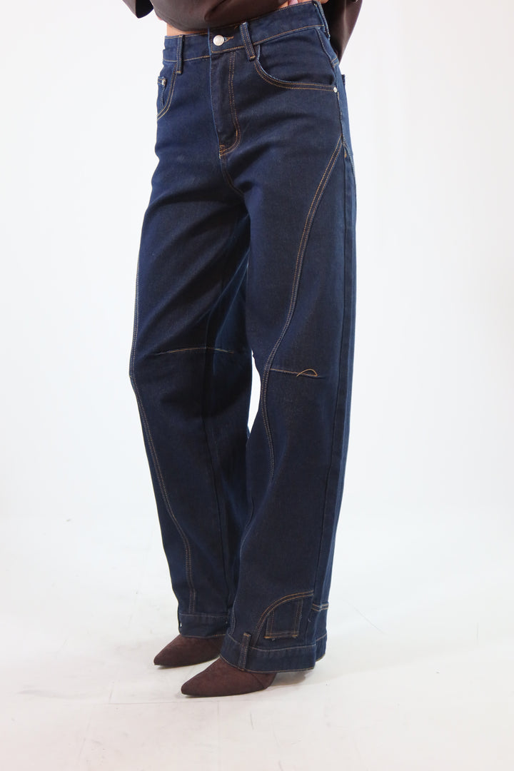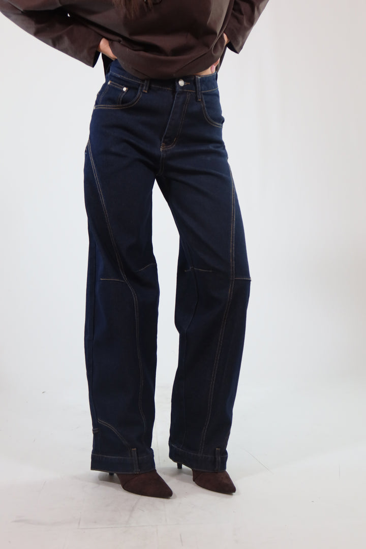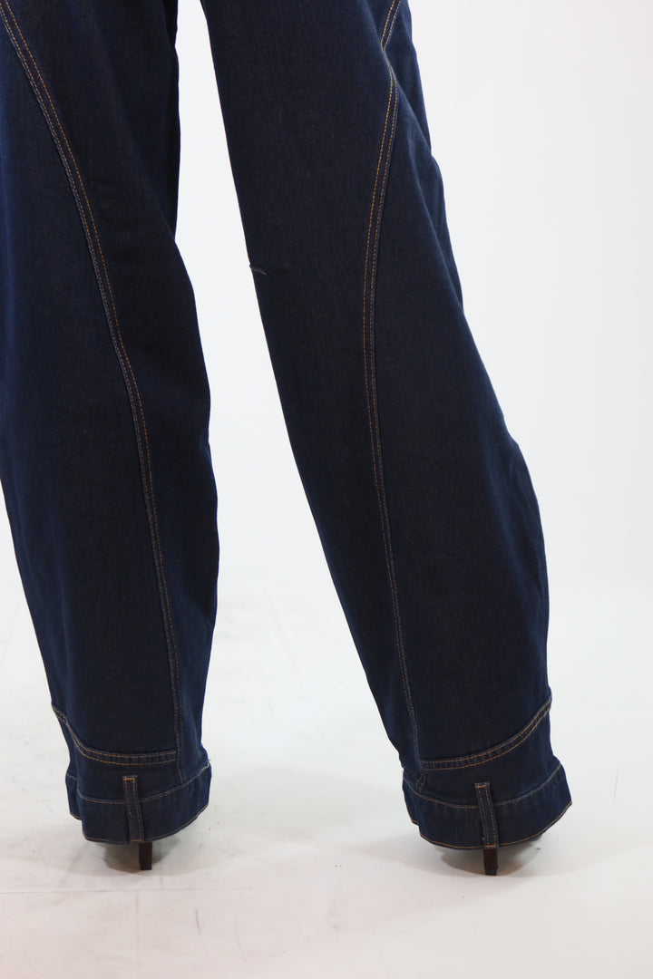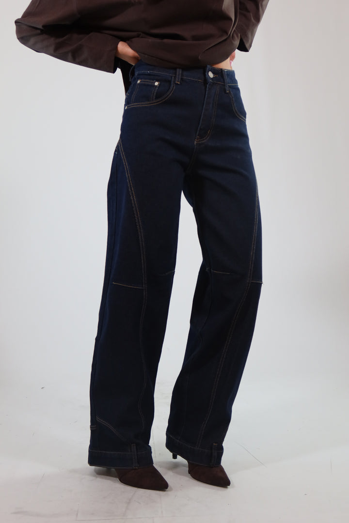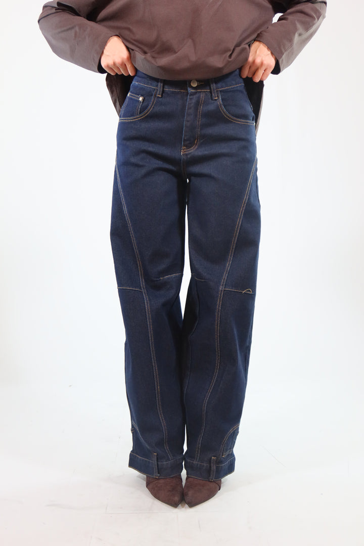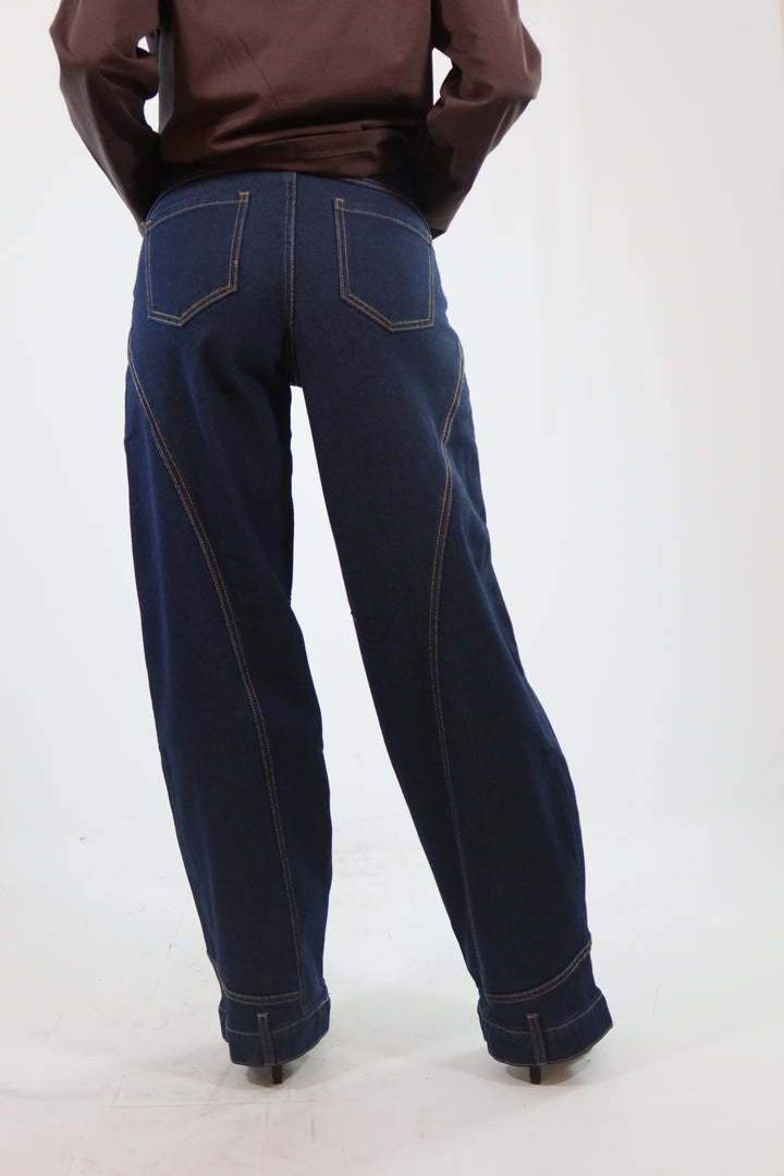 Jeans in denim scuro strutturato, la modella è alta 1.72 ed indossa la taglia XS.