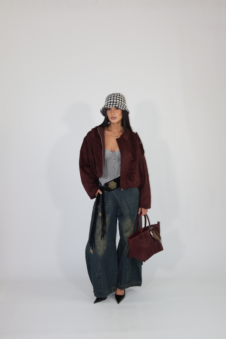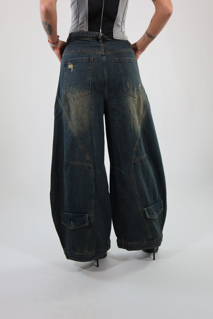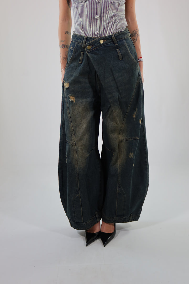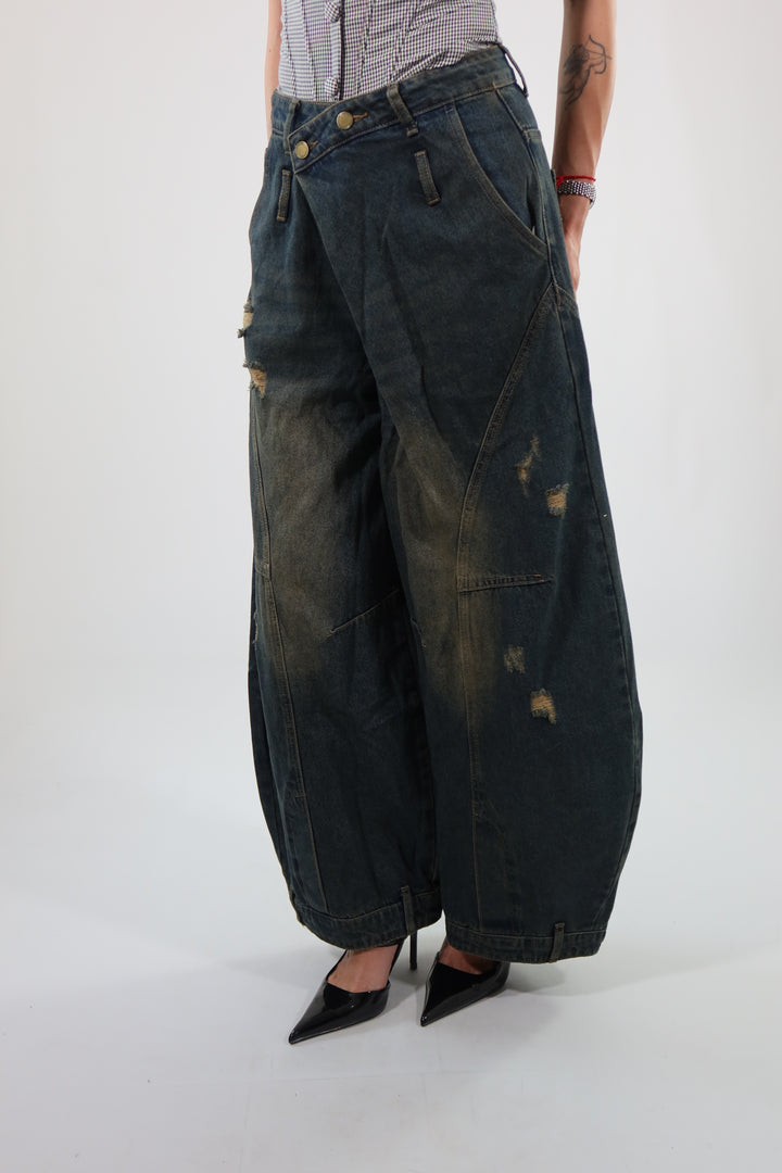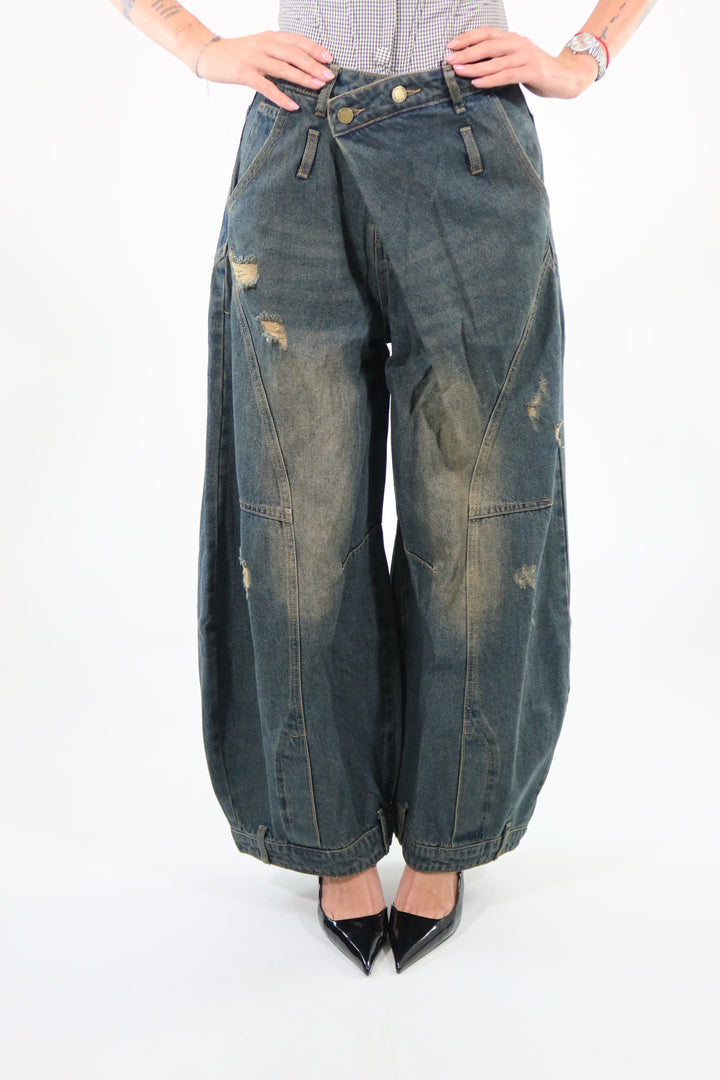 Jeans ballon con strappi lavaggio vintage, la modella indossa la taglia S ed è alta 1.72.