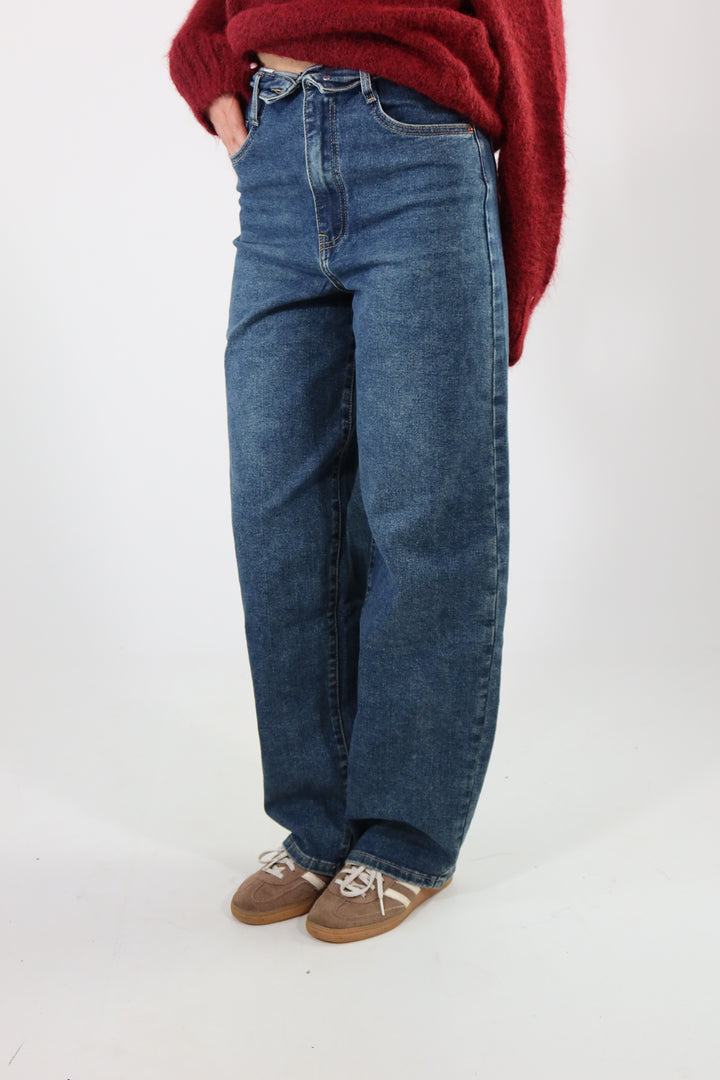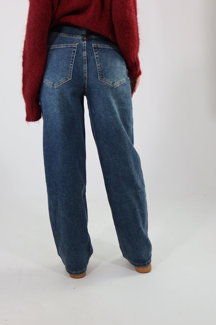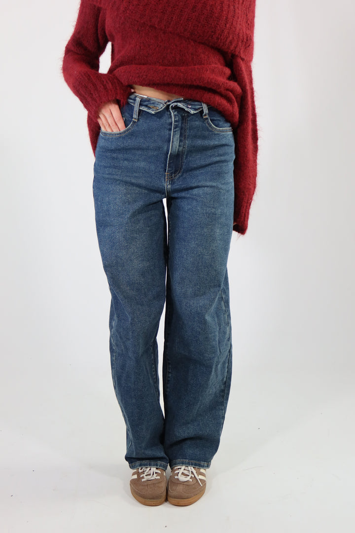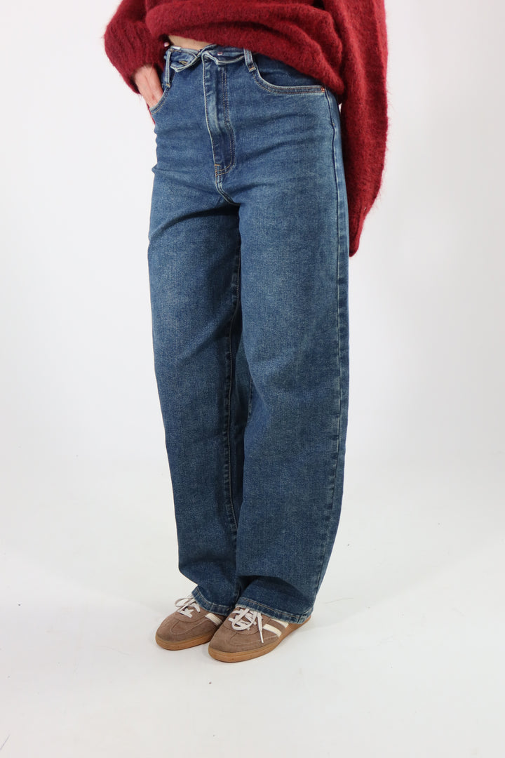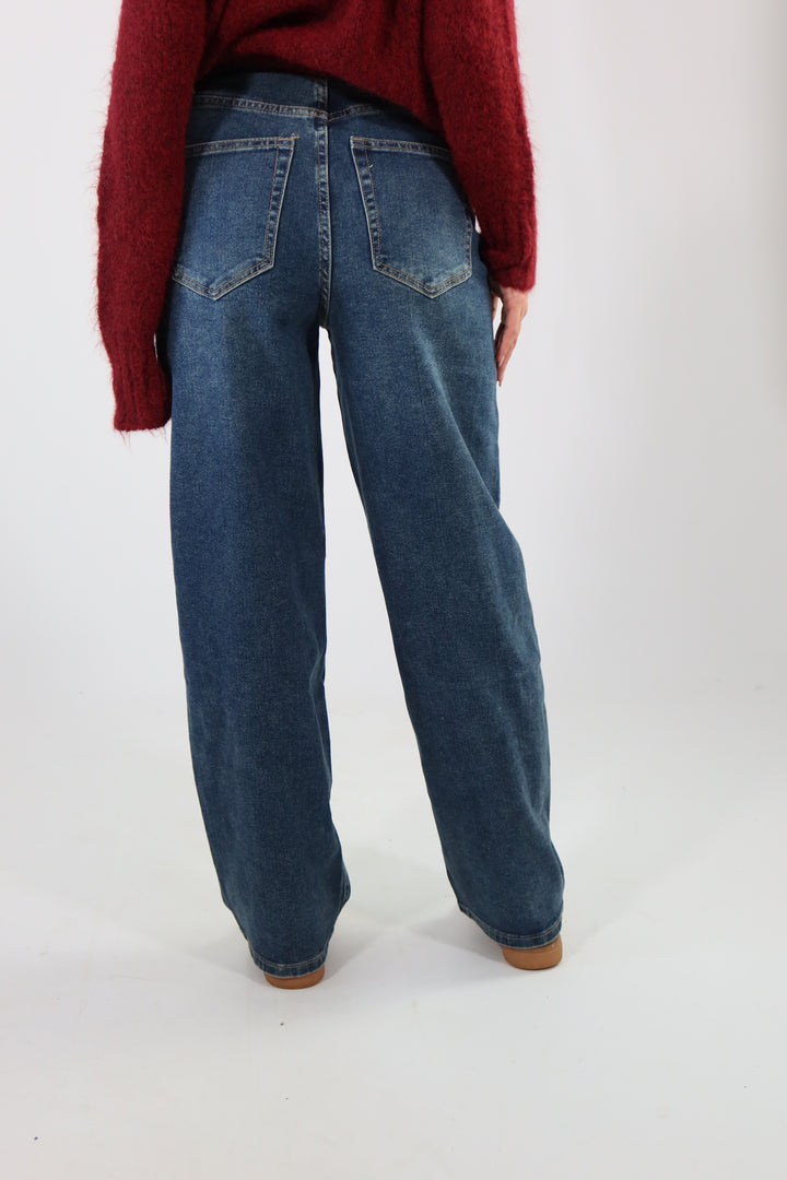 Jeans wide leg con risvolto in vita. La modella indossa la taglia 34 (XS) ed é alta 1.72.