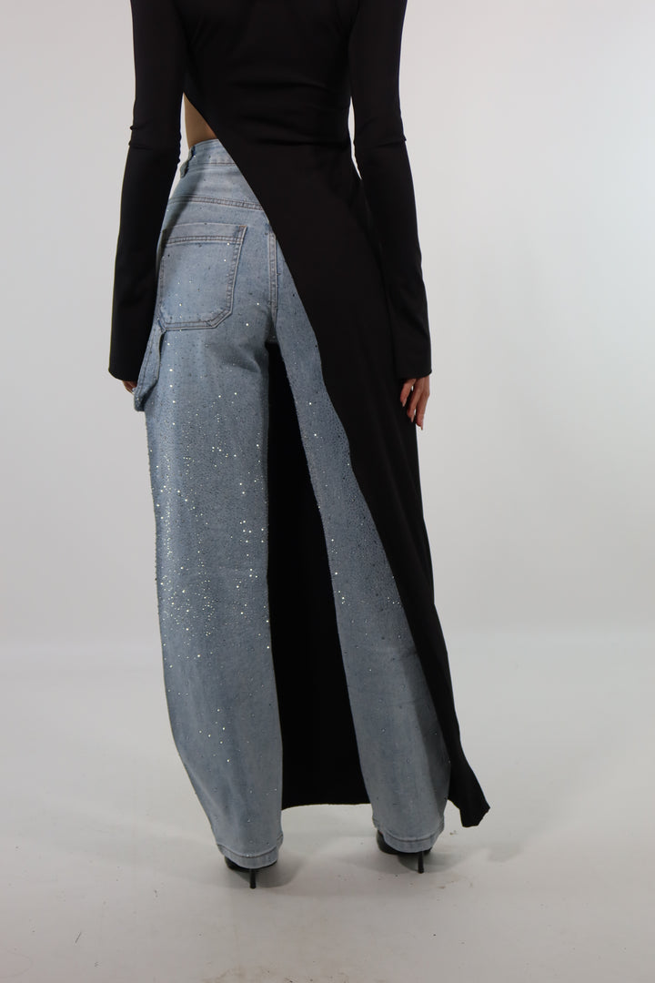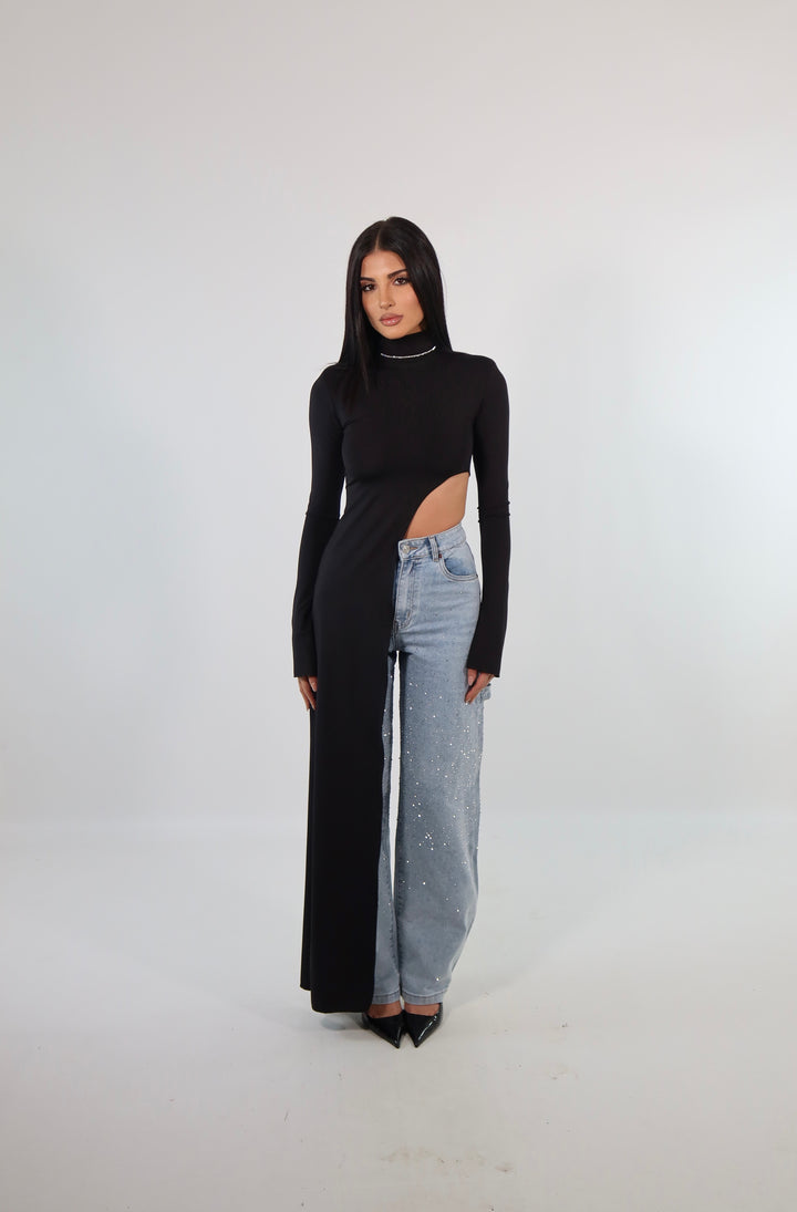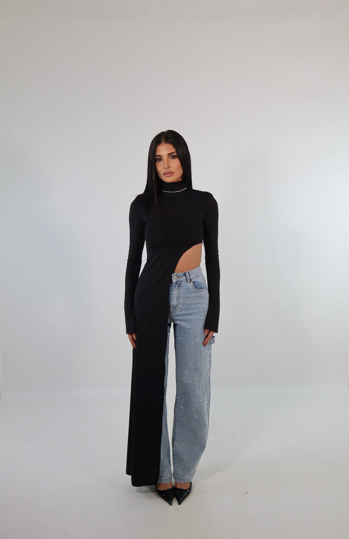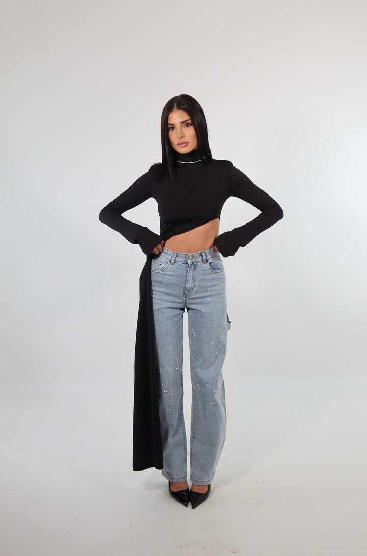 Jeans shine a vita alta, la modella indossa la taglia 34 (XS) ed è alta 1.72.