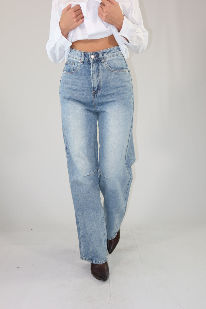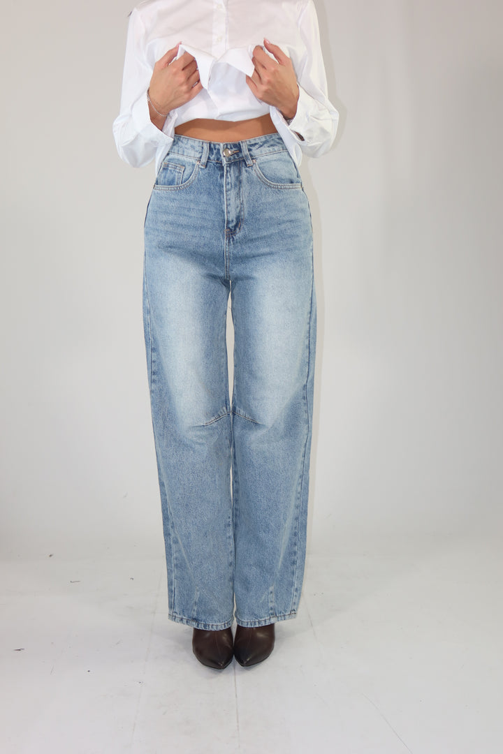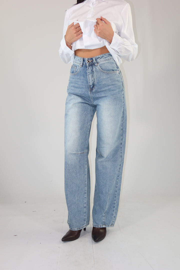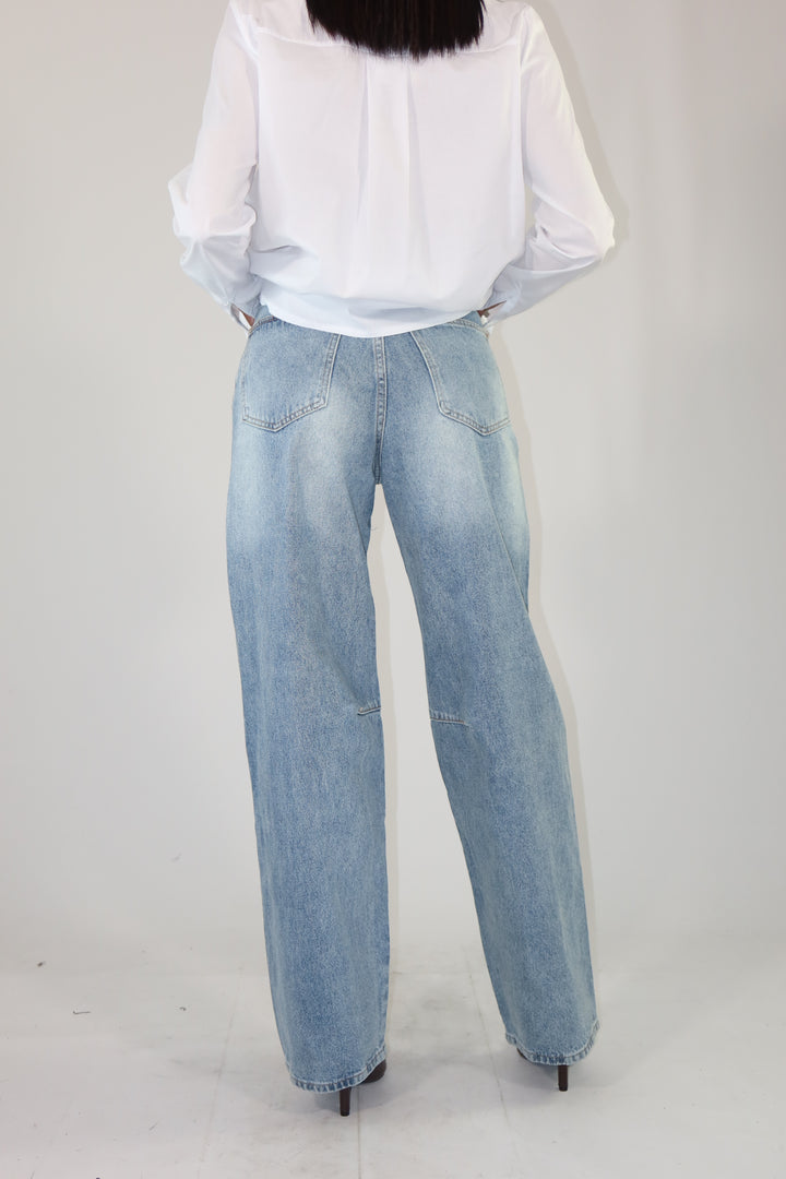 Jeans in denim chiaro con gamba larga. La modella indossa la taglia XS ed è alta 1.72.