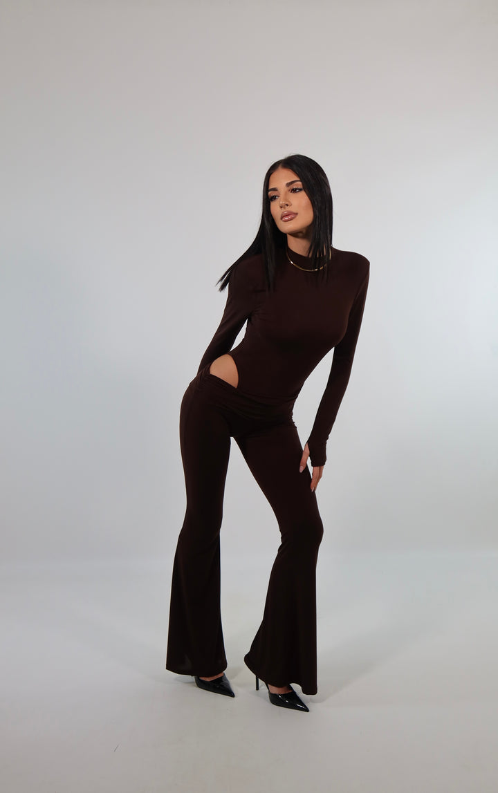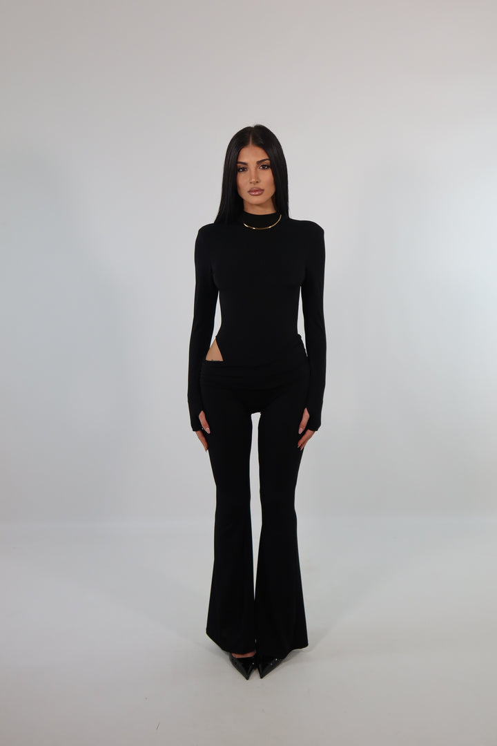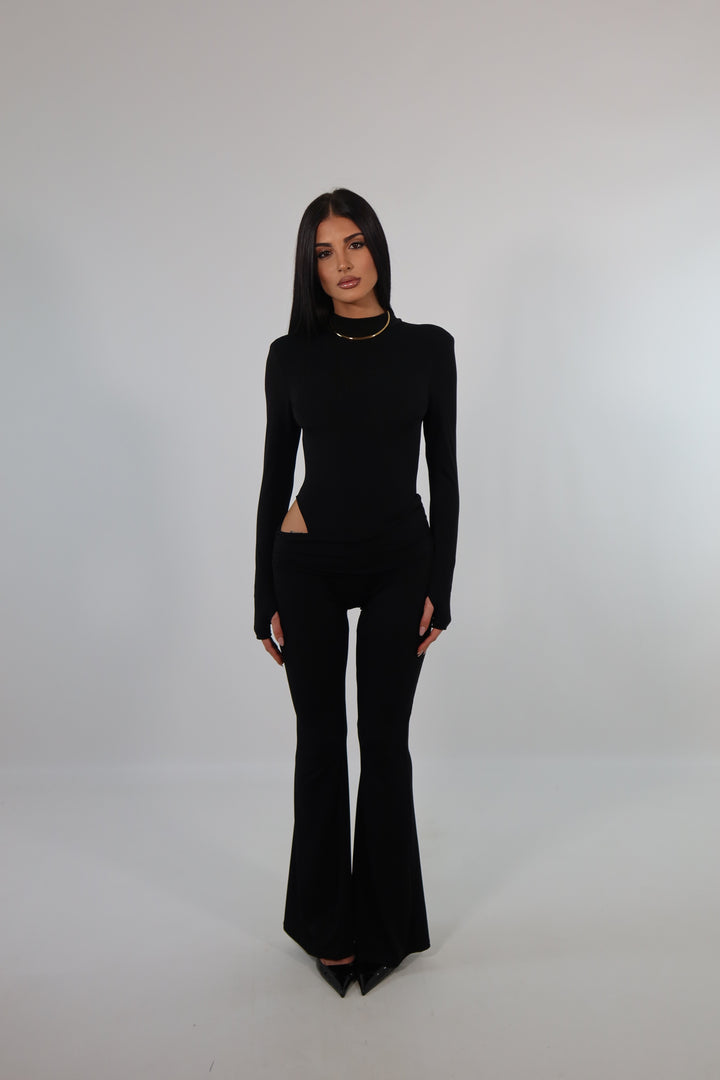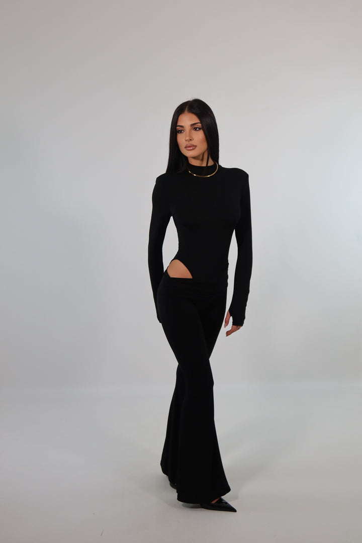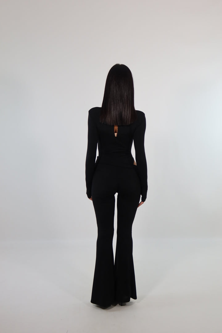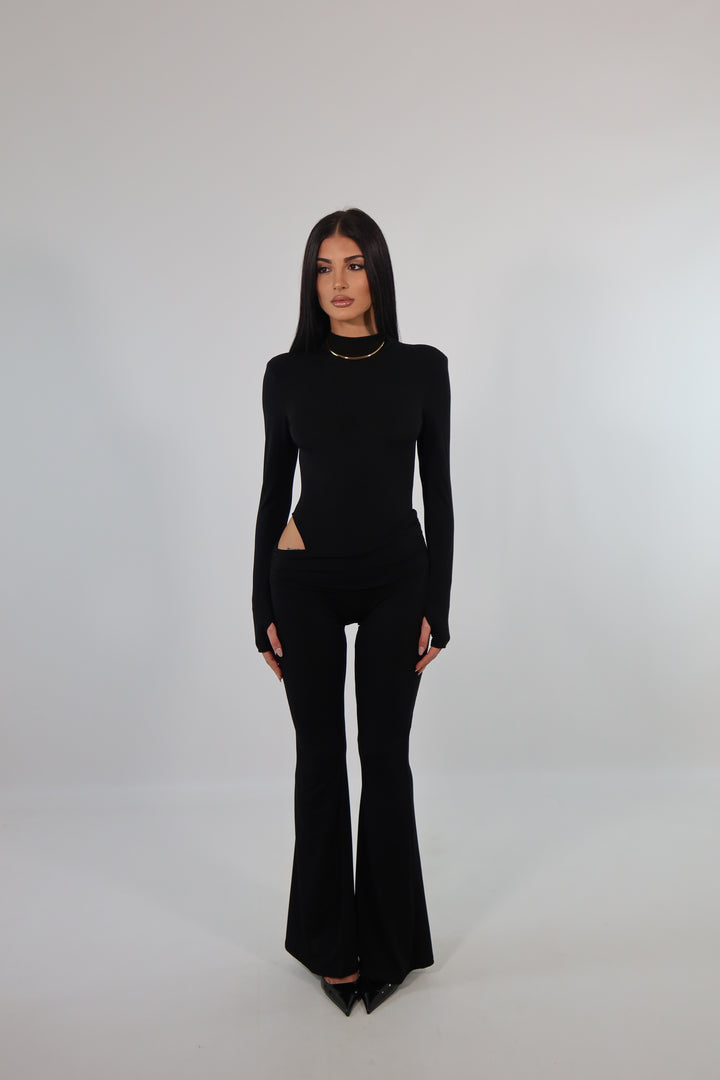 Jump in tessuto aderente ed elasticizzato con spalline rinforzate, manicotti e pantalone a zampa. Si adatta da una XS ad una taglia M/L. Per rif. la modella è una XS ed è alta 1.72.