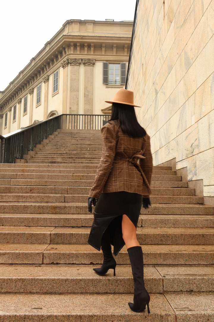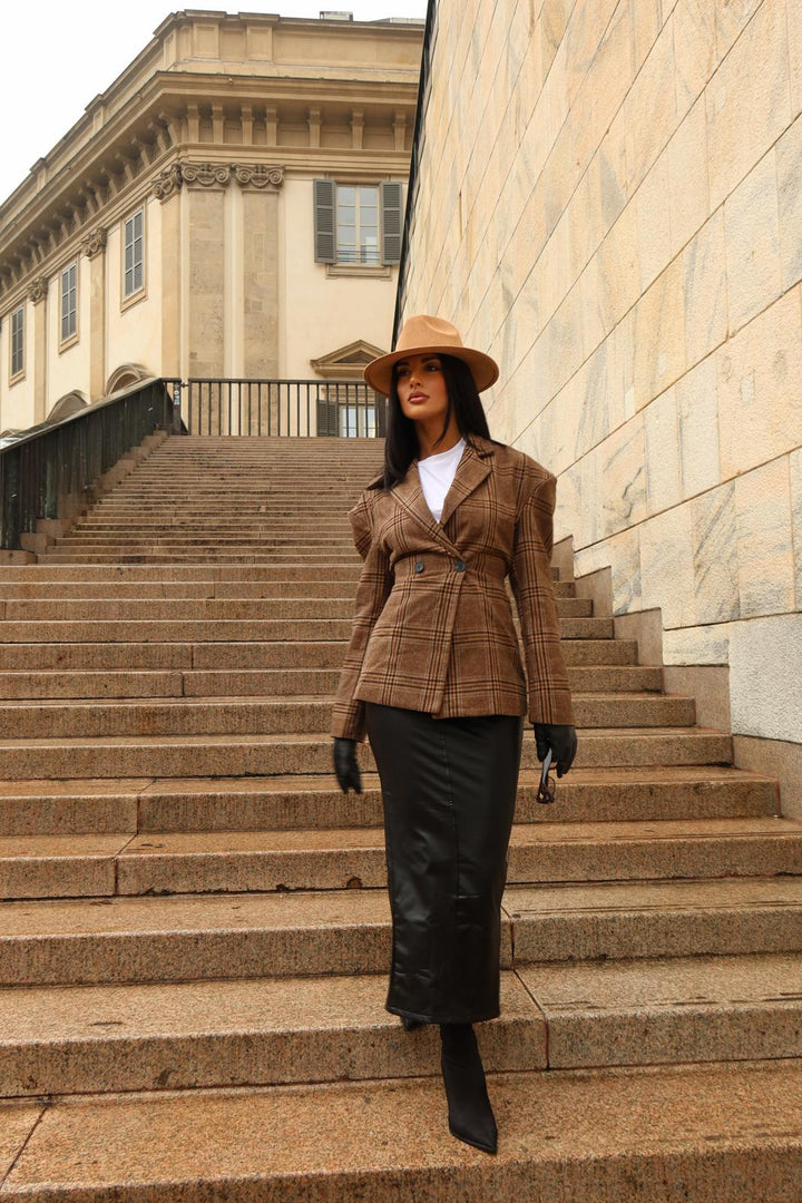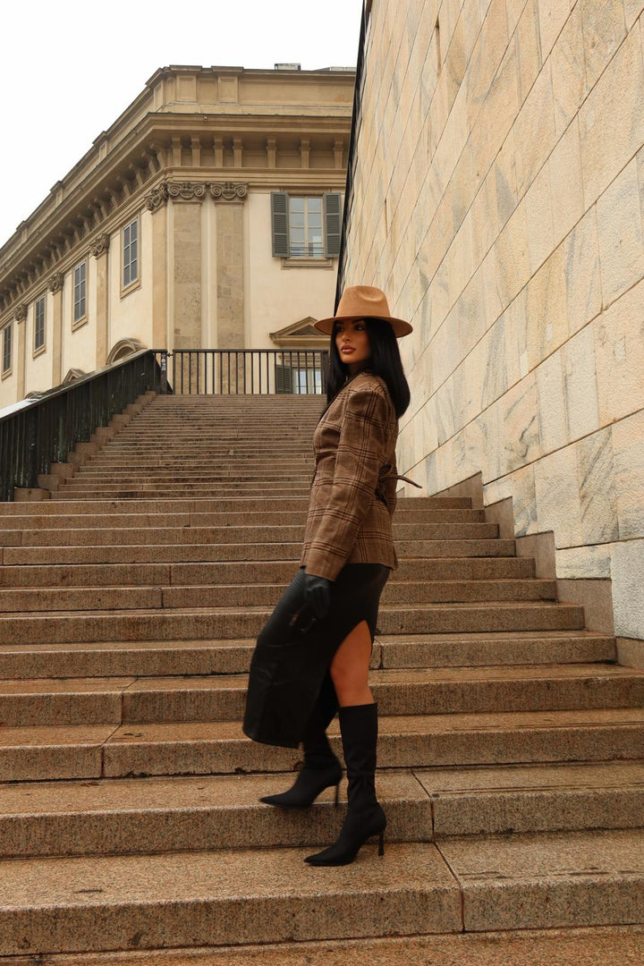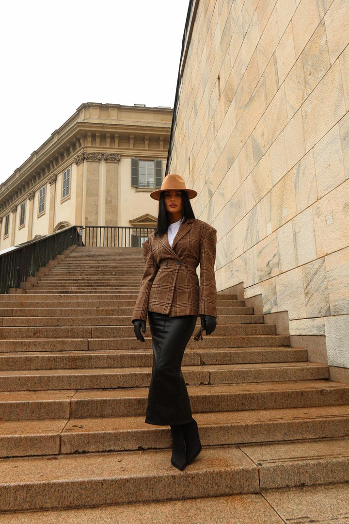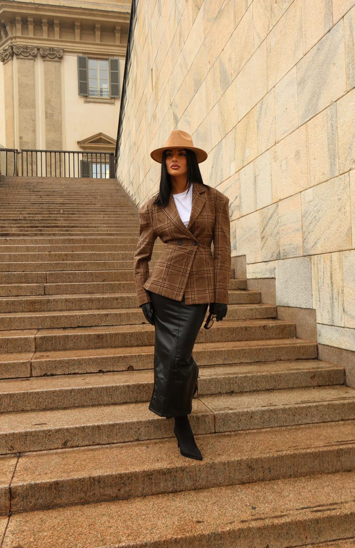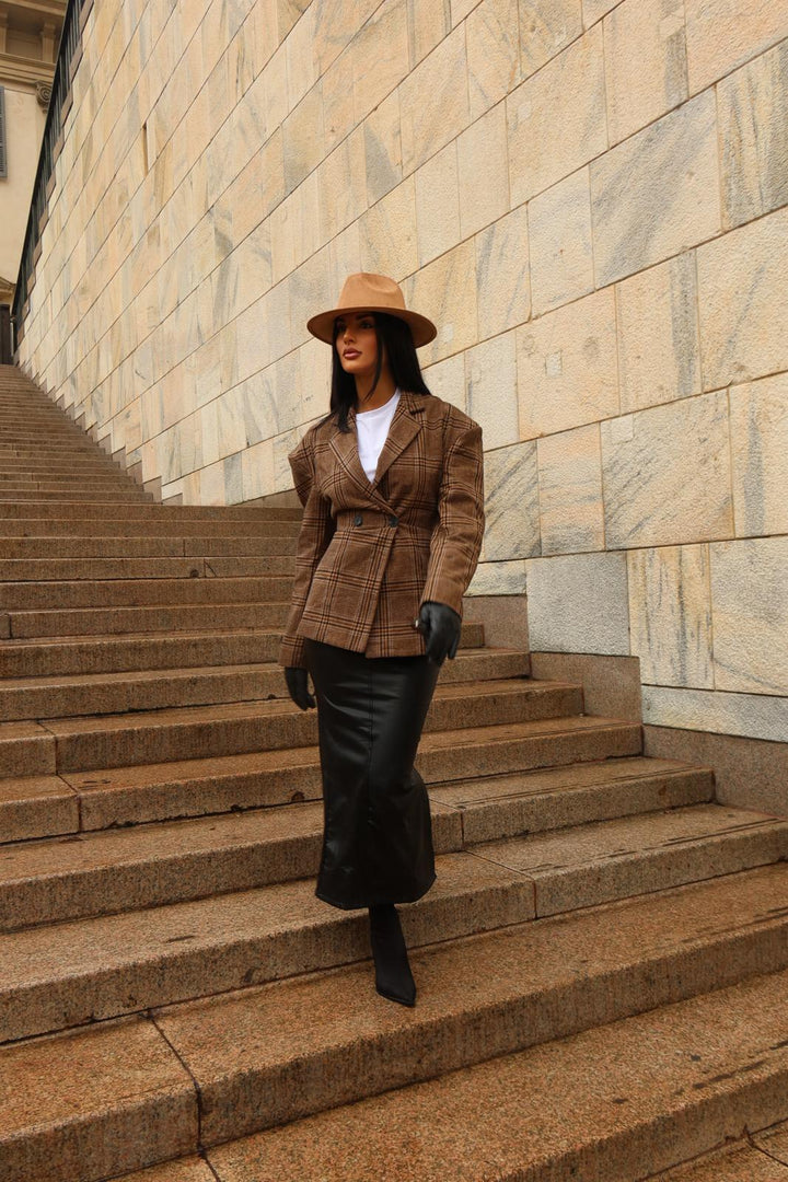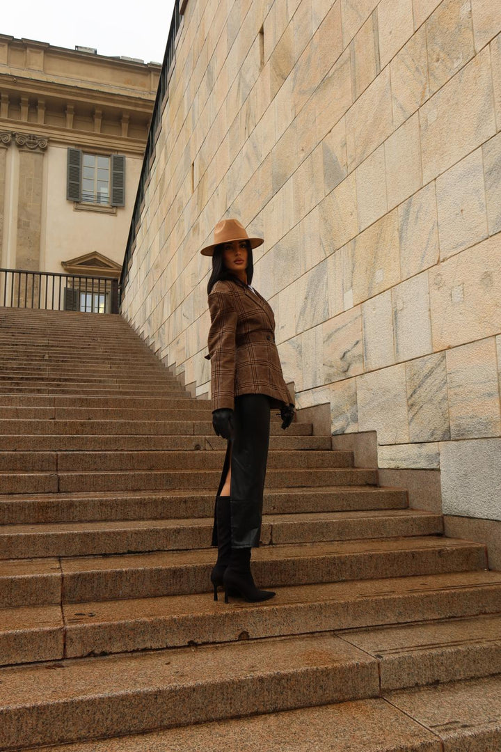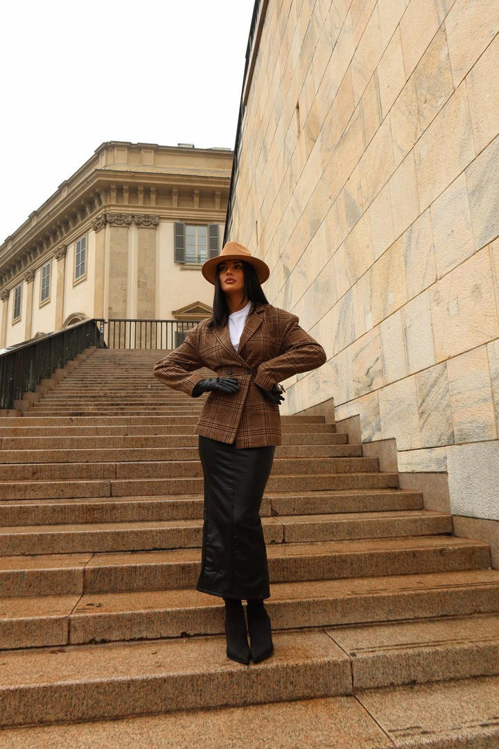 Longuette in pelle con spacco sul retro. È tessuto aderente ed elasticizzato e si adatta dalla XS ad una taglia M. Per ref. la modella è una taglia XS ed è alta 1.72.