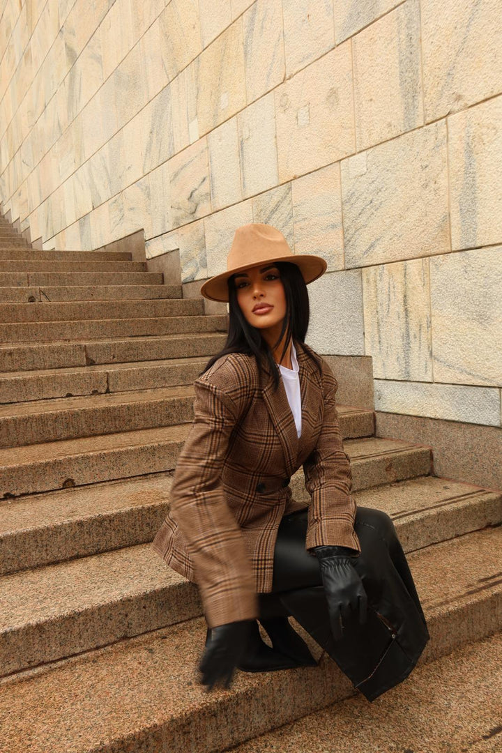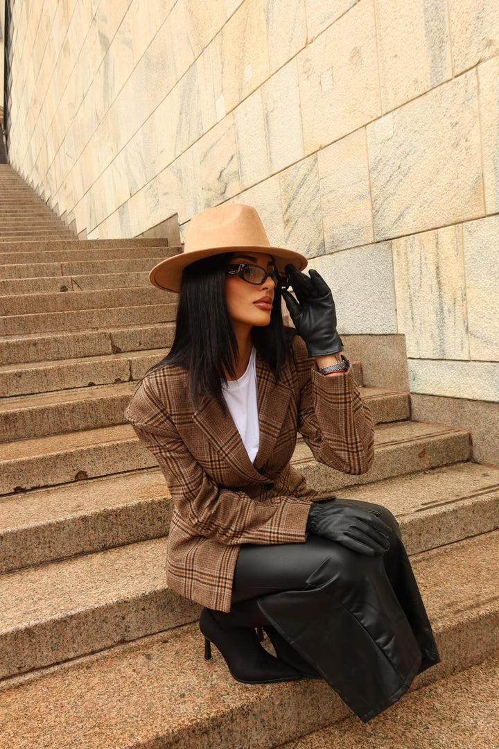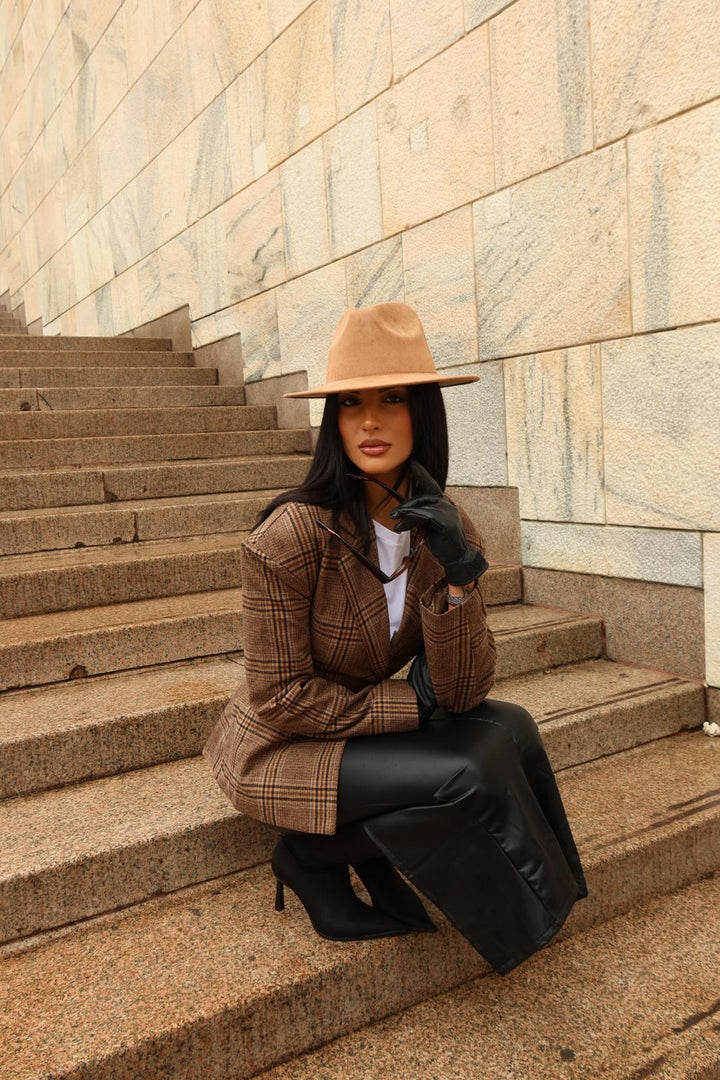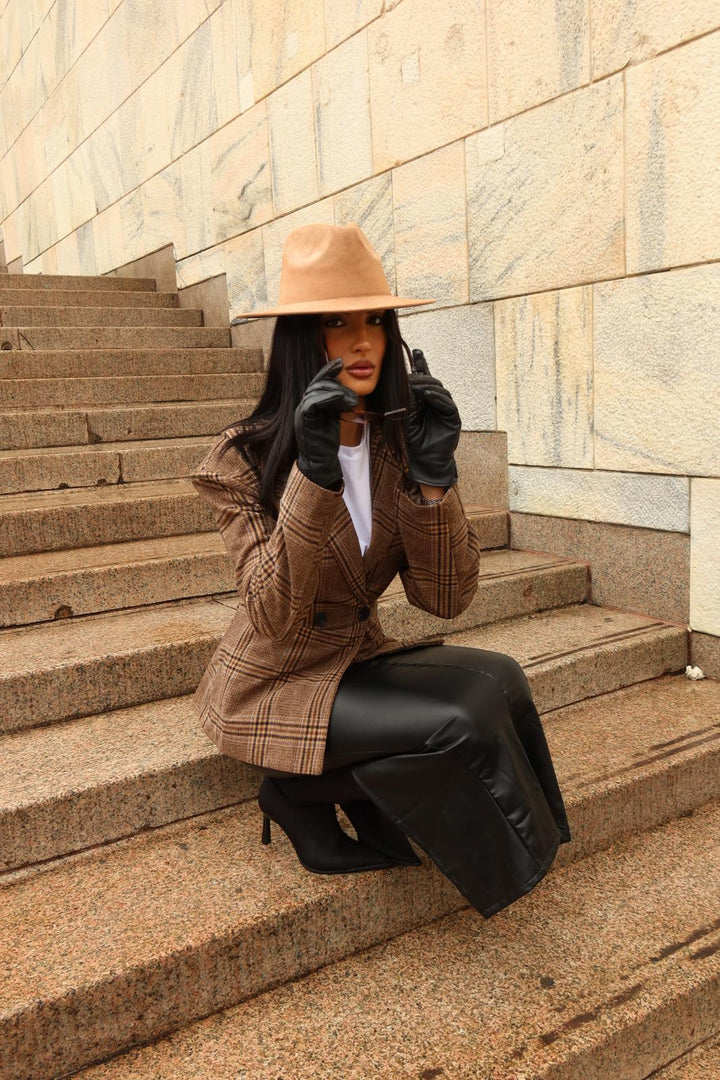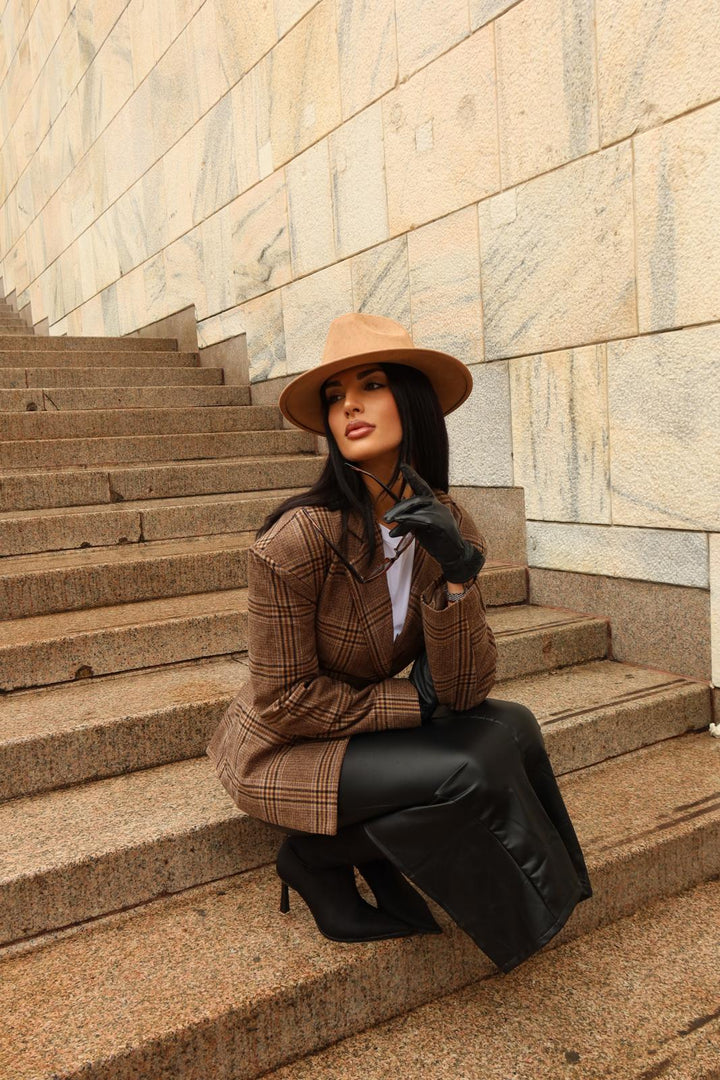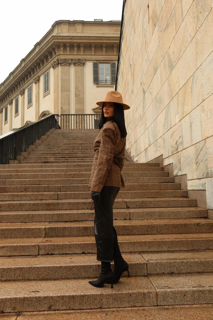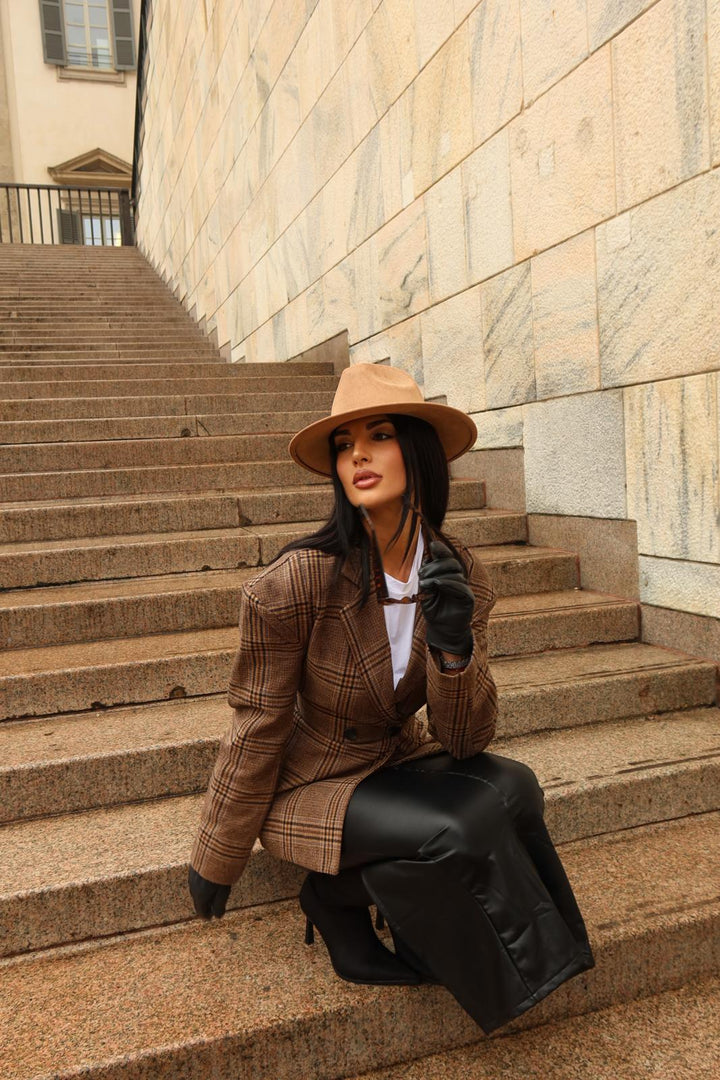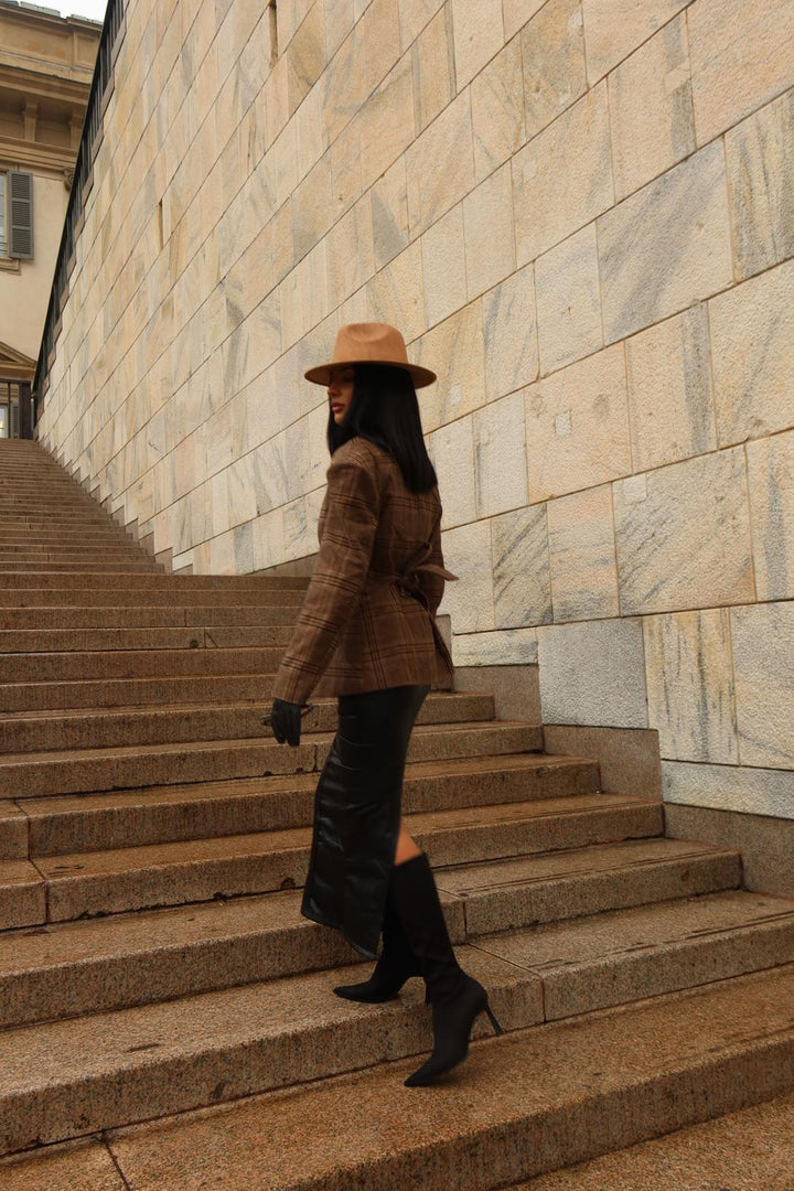 Longuette in pelle con spacco sul retro. È tessuto aderente ed elasticizzato e si adatta dalla XS ad una taglia M. Per ref. la modella è una taglia XS ed è alta 1.72.