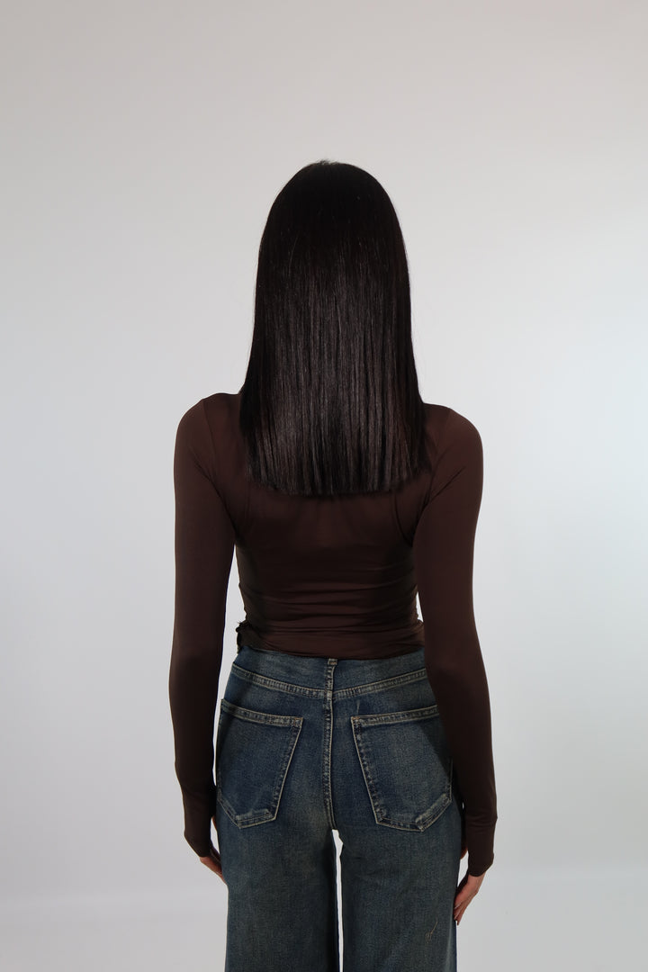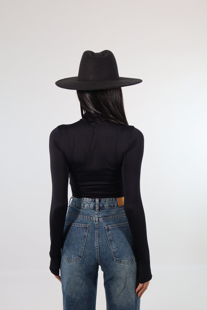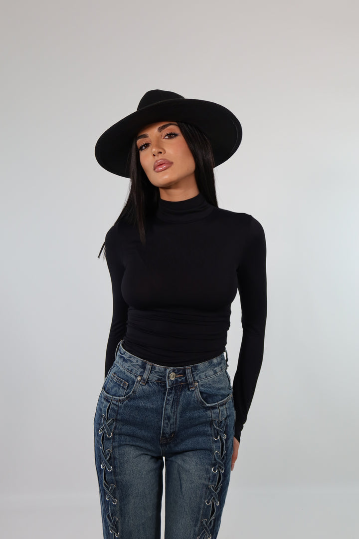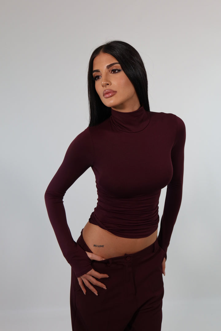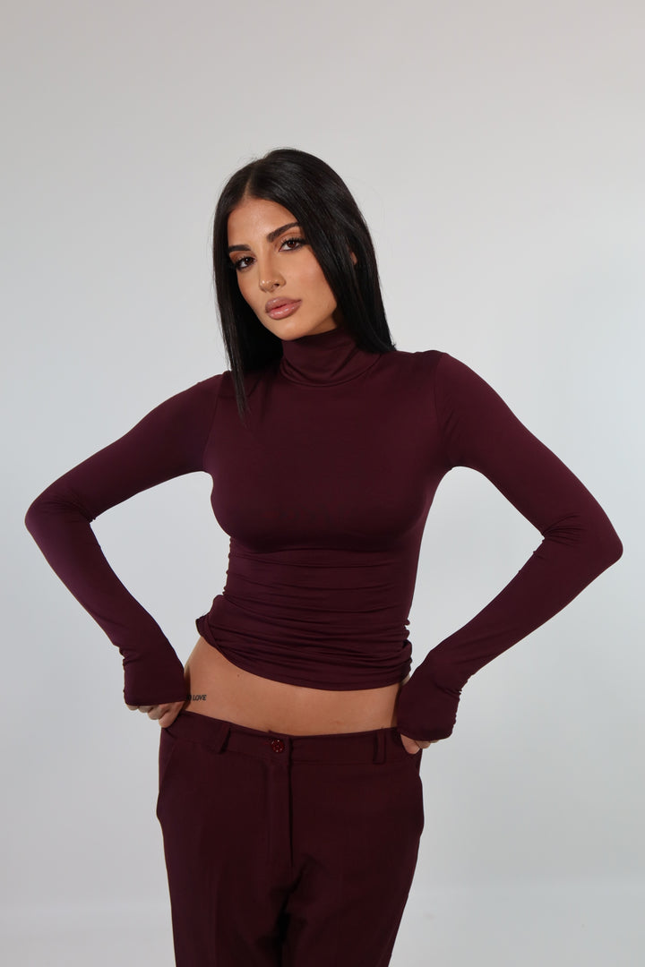 Maglia a collo alto in tessuto aderente ed elasticizzato con manicotti. Grazie al tessuto veste da una XS ad una taglia M/L.