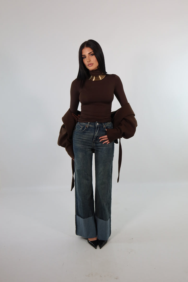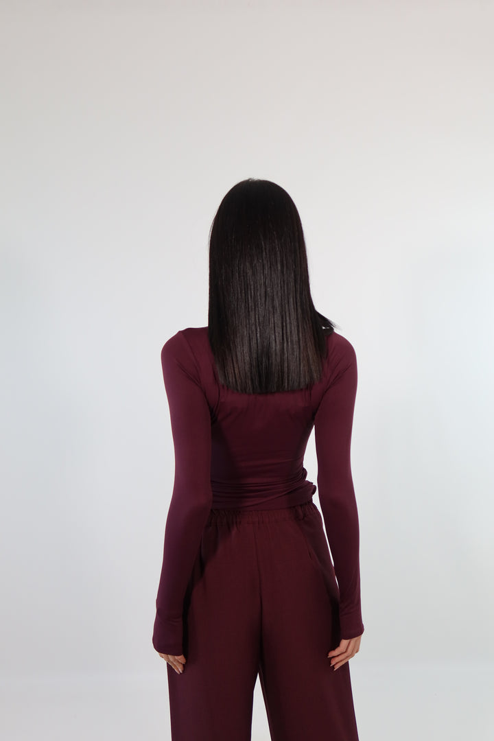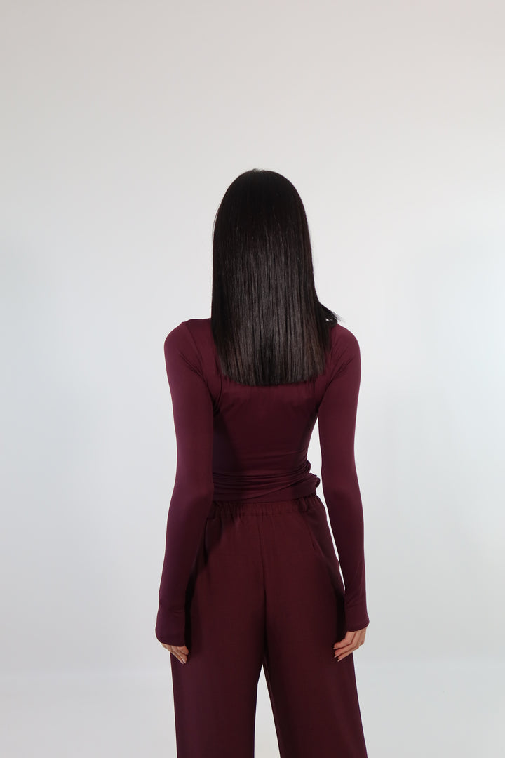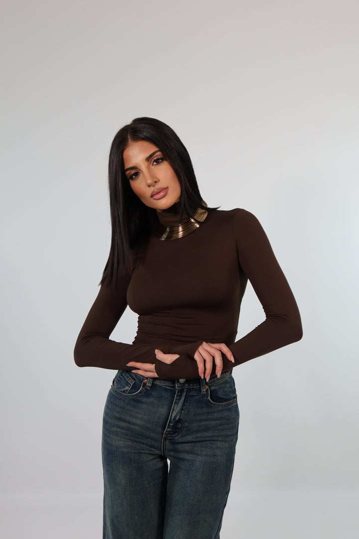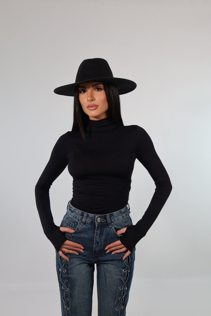 Maglia a collo alto in tessuto aderente ed elasticizzato con manicotti. Grazie al tessuto veste da una XS ad una taglia M/L.