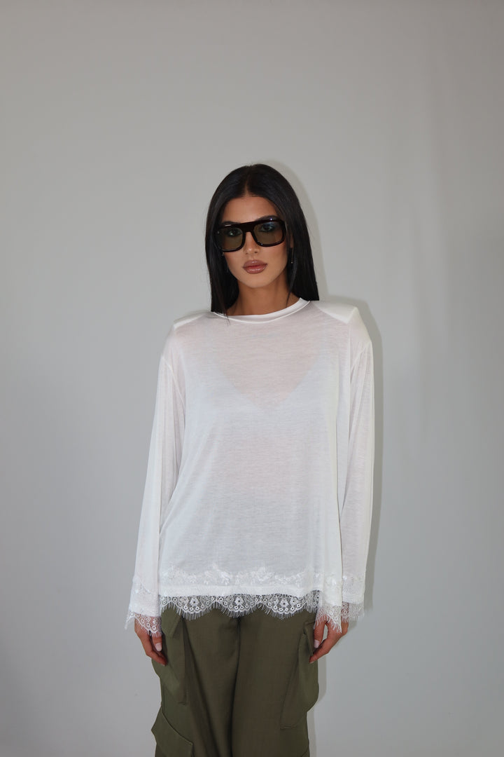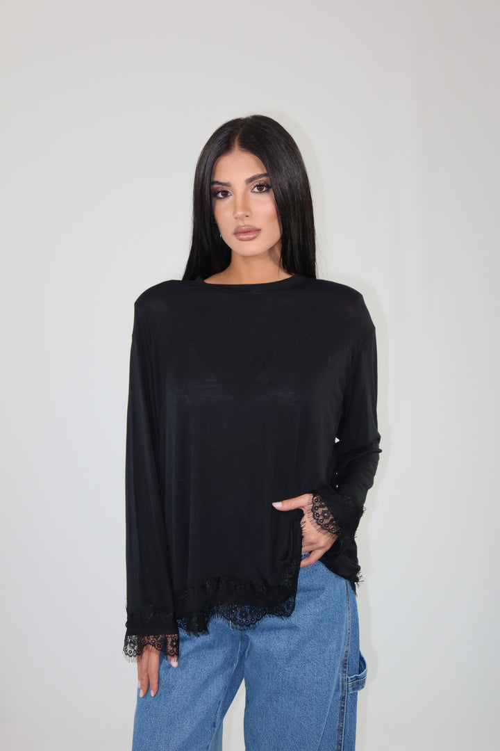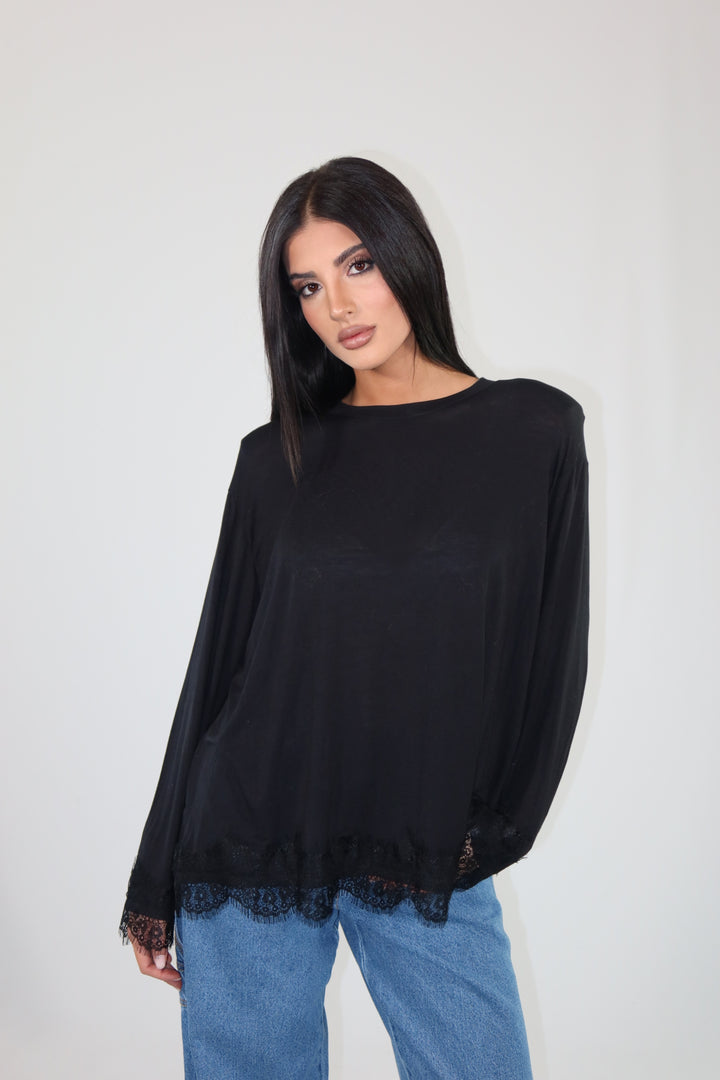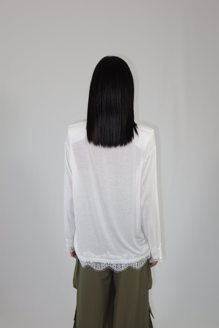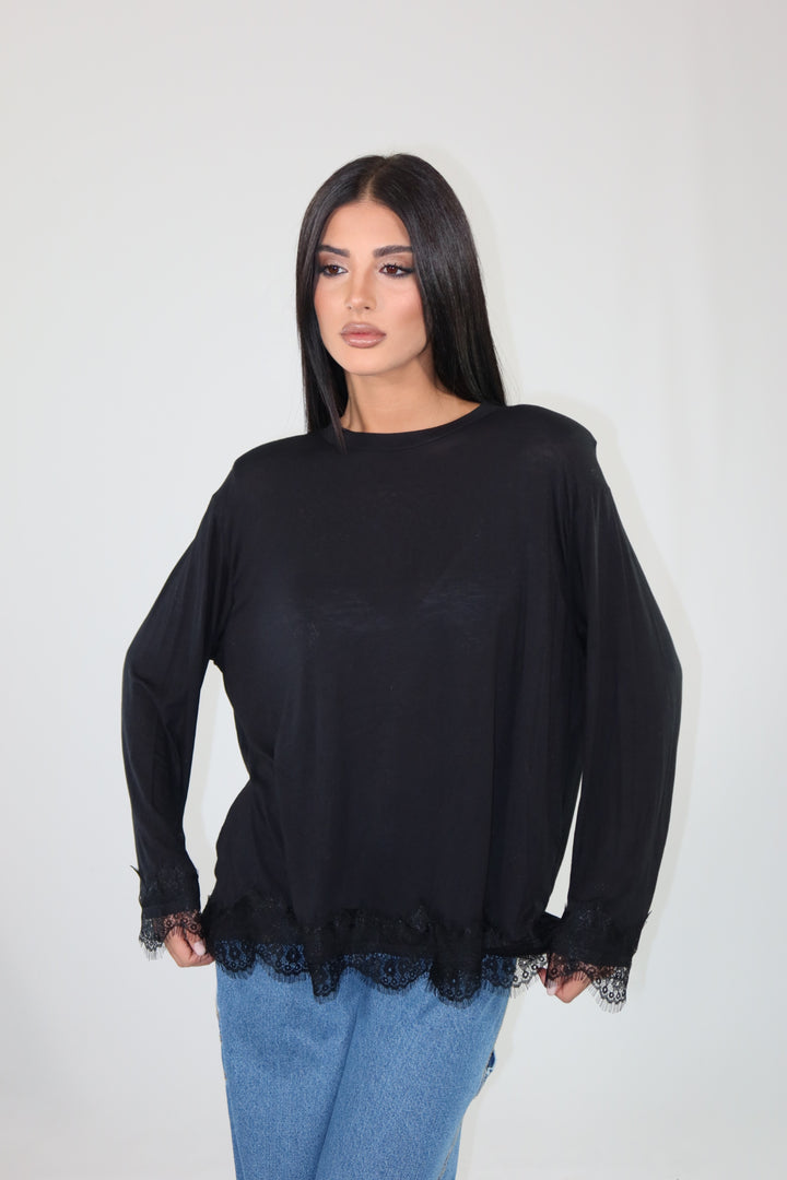 Maglia con spalline imbottite, decorata con pizzo sul fondo e sulle maniche ha una vestibilità morbida.