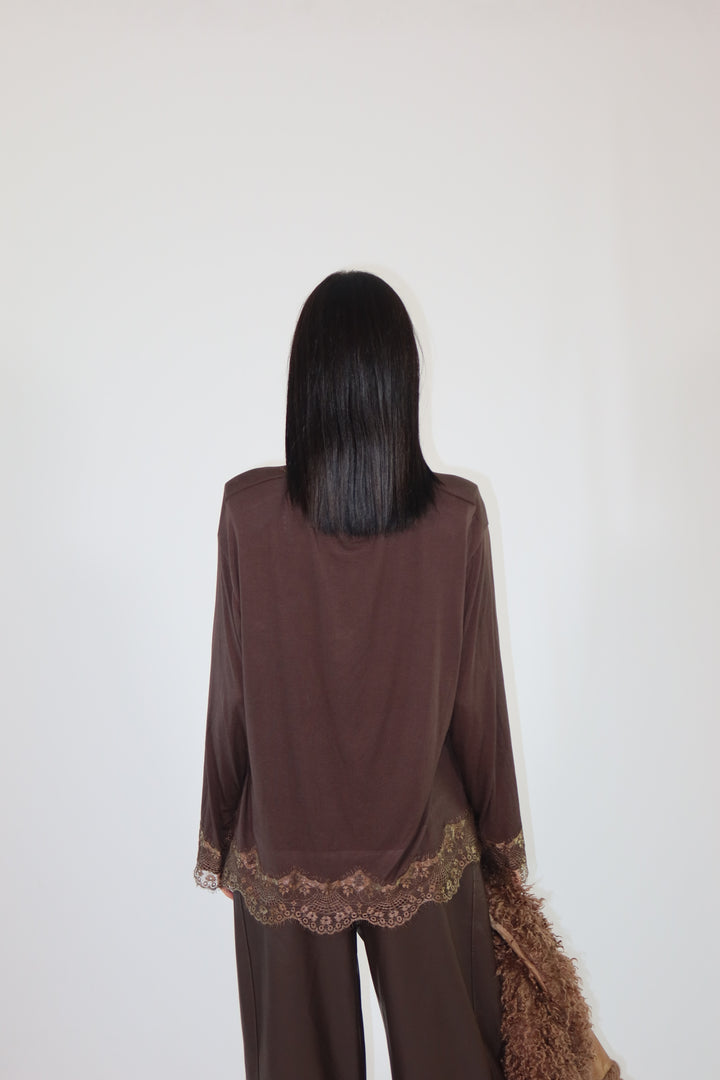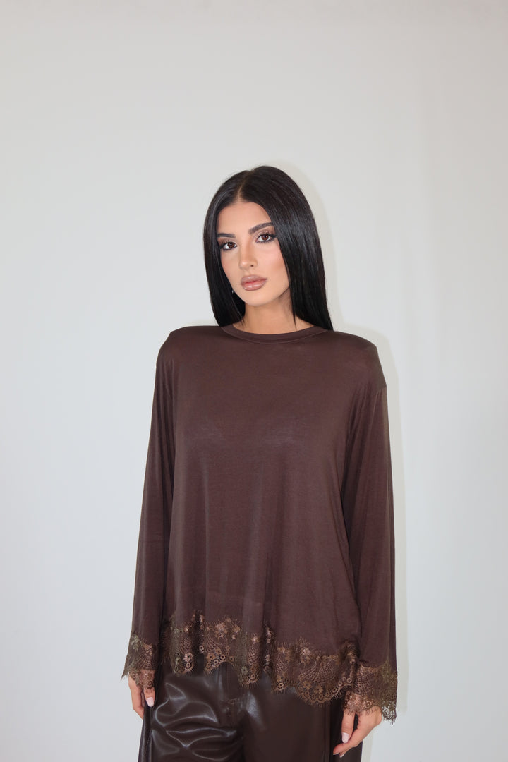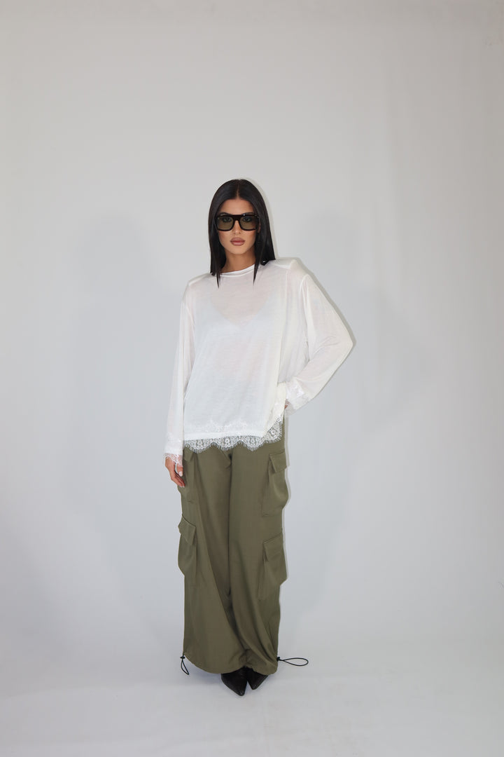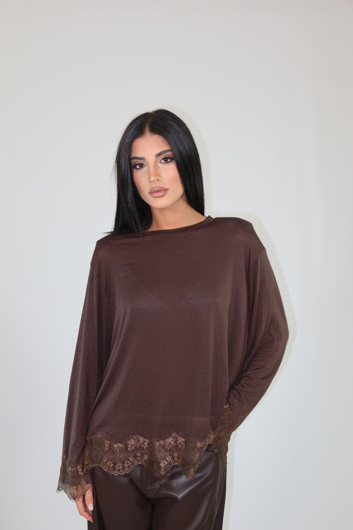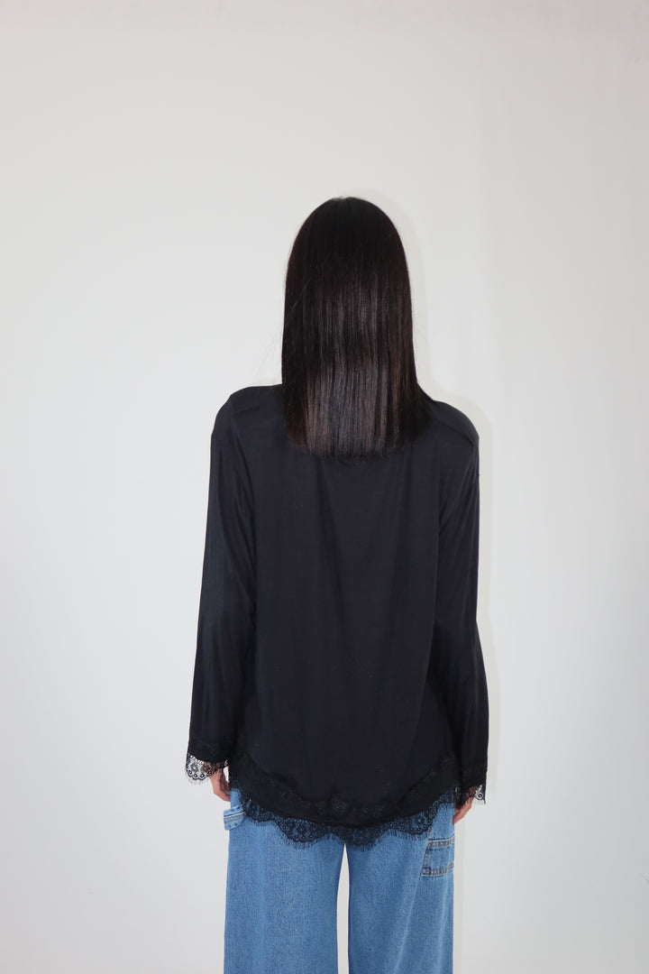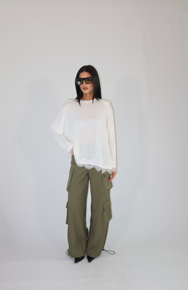 Maglia con spalline imbottite, decorata con pizzo sul fondo e sulle maniche ha una vestibilità morbida.