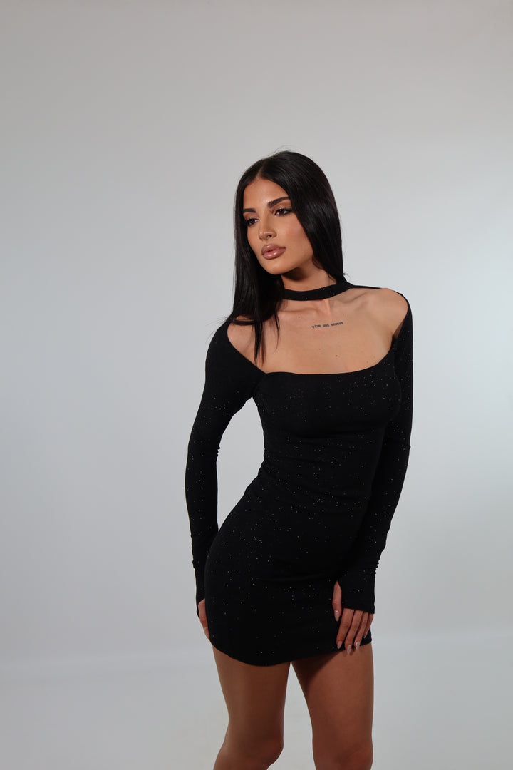 Mini Dress lurex in tessuto aderente ed elasticizzato con coppe preformate, manicotti e collier. Si adatta da una XS ad una taglia M/L.