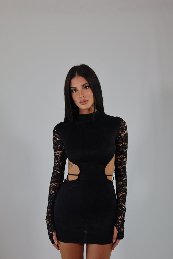 Mini dress in pizzo aderente ed elasticizzato con lacci sulla schiena. Si adatta dalla XS alla taglia M/L.