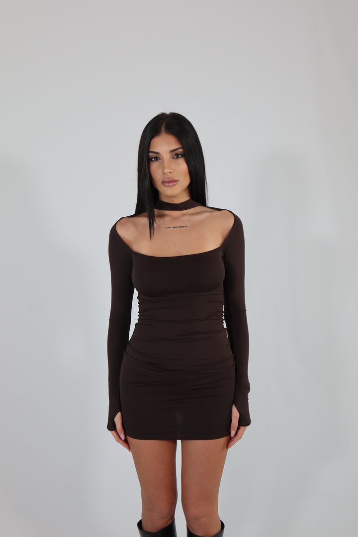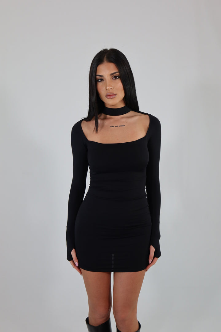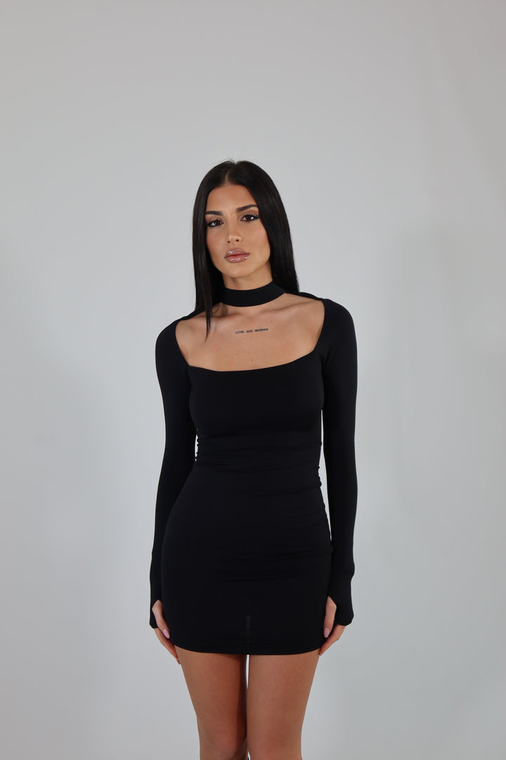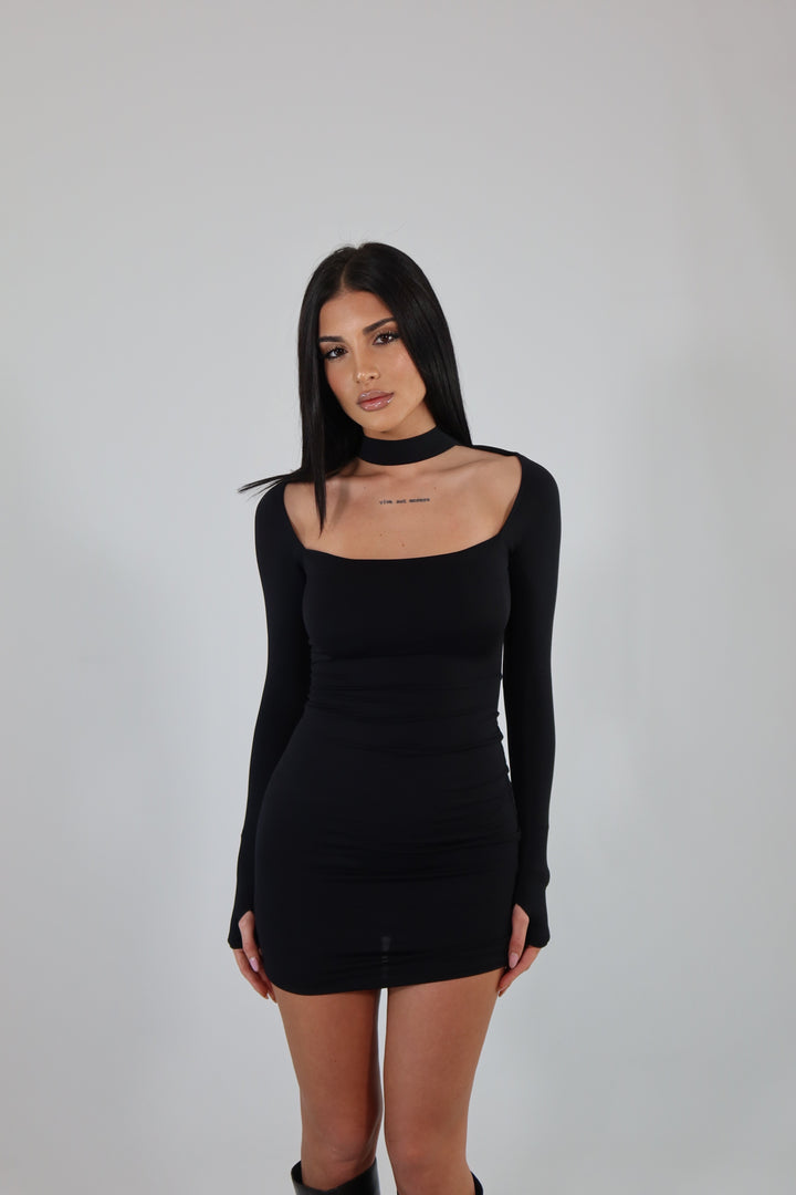 Mini Dress in tessuto aderente ed elasticizzato con coppe preformate, manicotti e collier. Si adatta da una XS ad una taglia M/L.