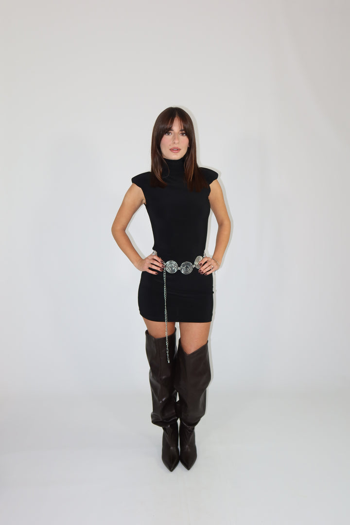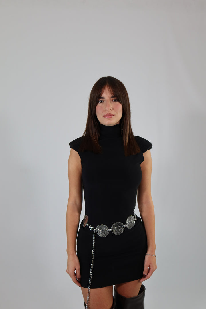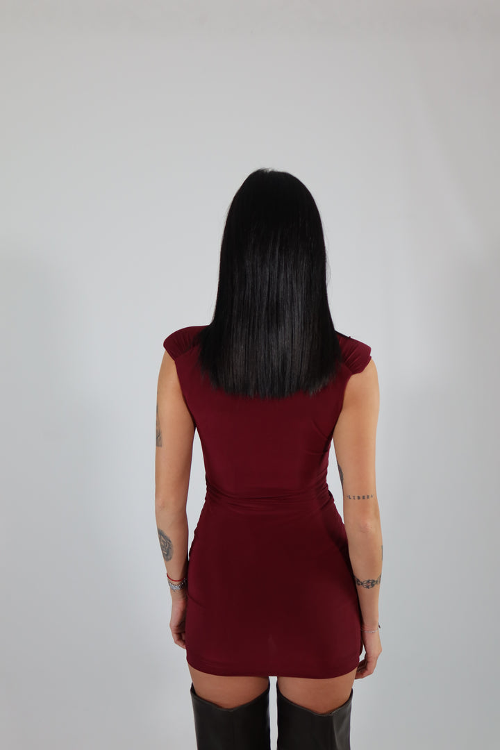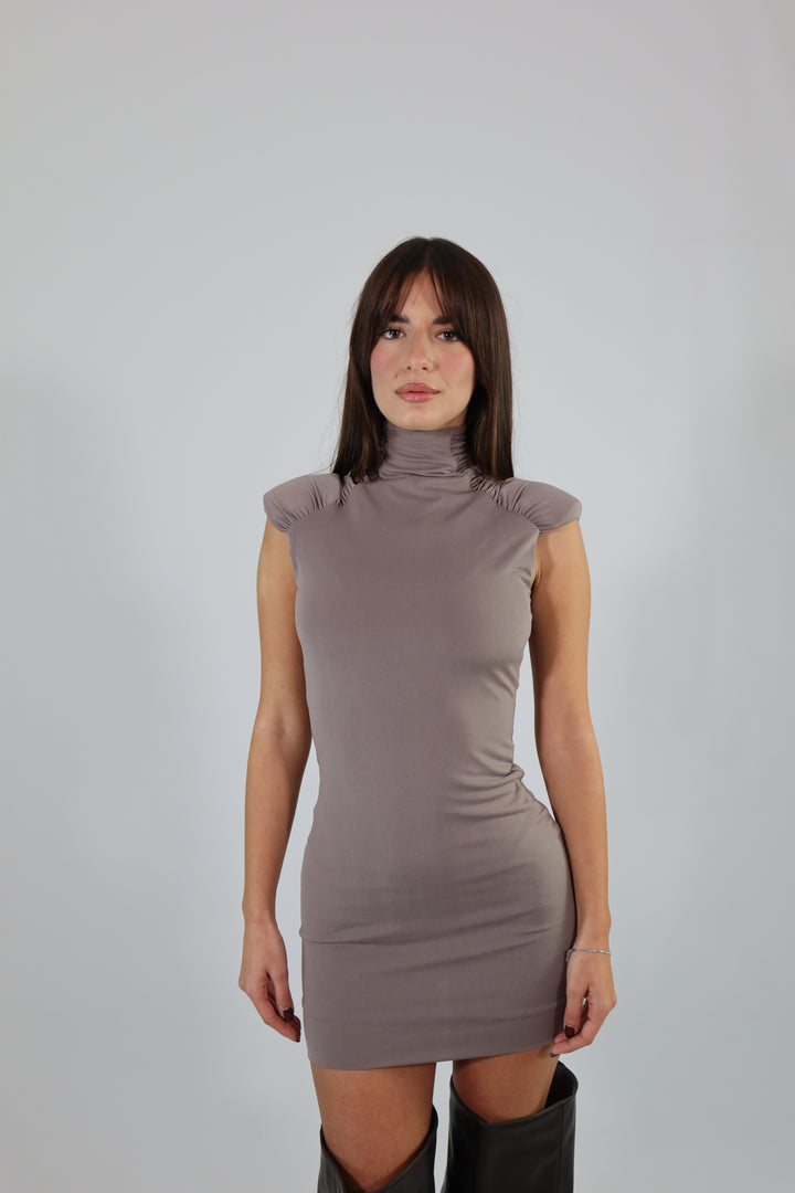 Mini dress in tessuto aderente ed elasticizzato con spalline imbottite. Si adatta dalla XS ad una taglia M/L.