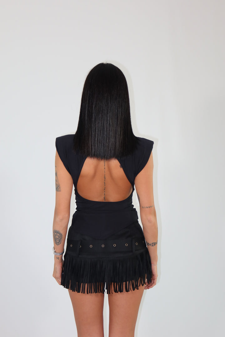 Mini gonna pantaloncino con frange e cinture. La modella indossa la taglia S/M.