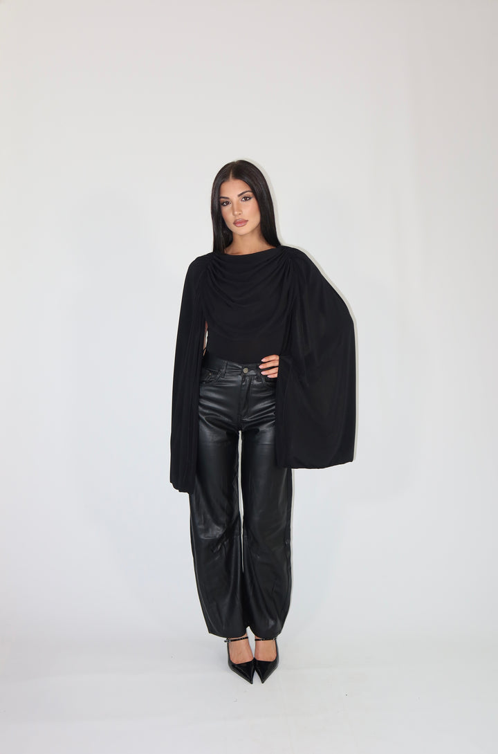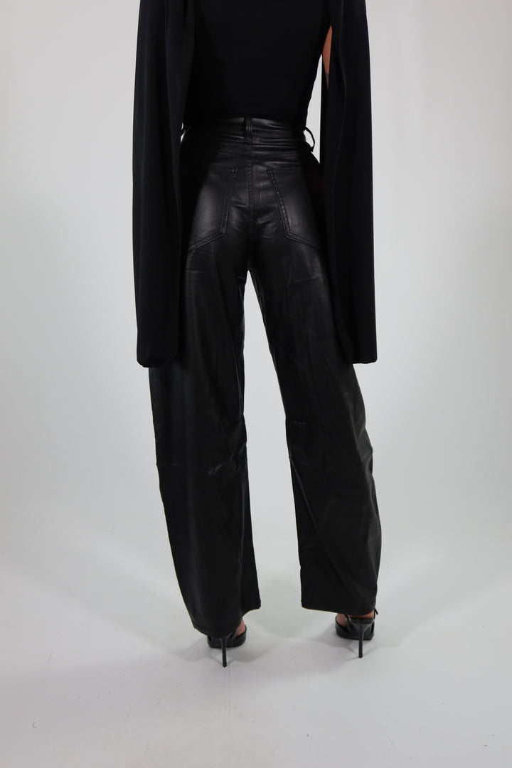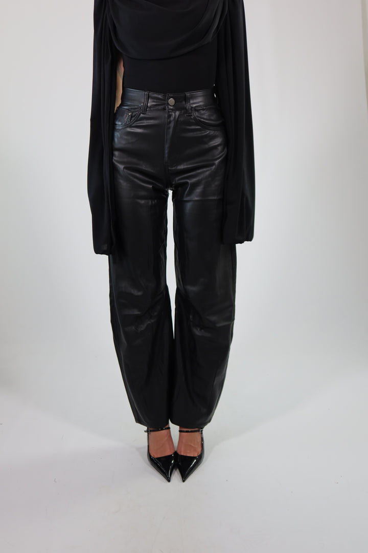 Panta in ecopelle a vita alta dal fit morbido, la modella indossa la taglia XS ed è alta 1.72.