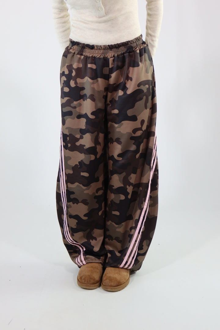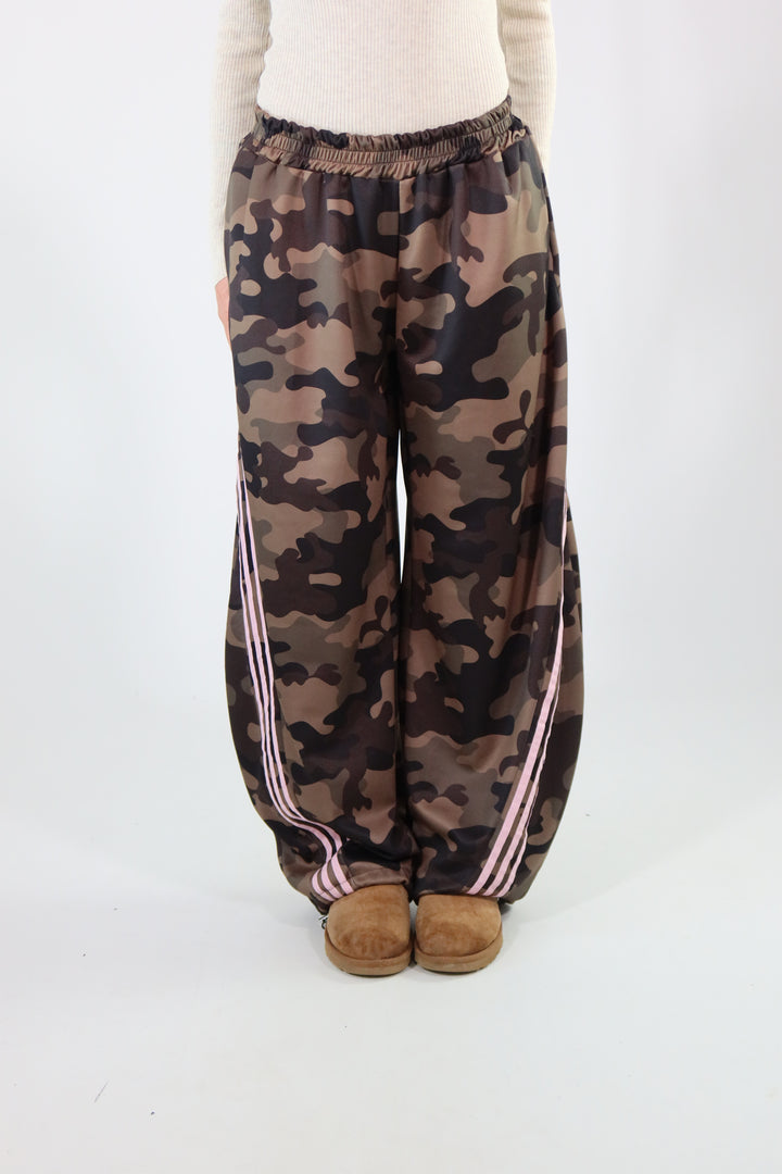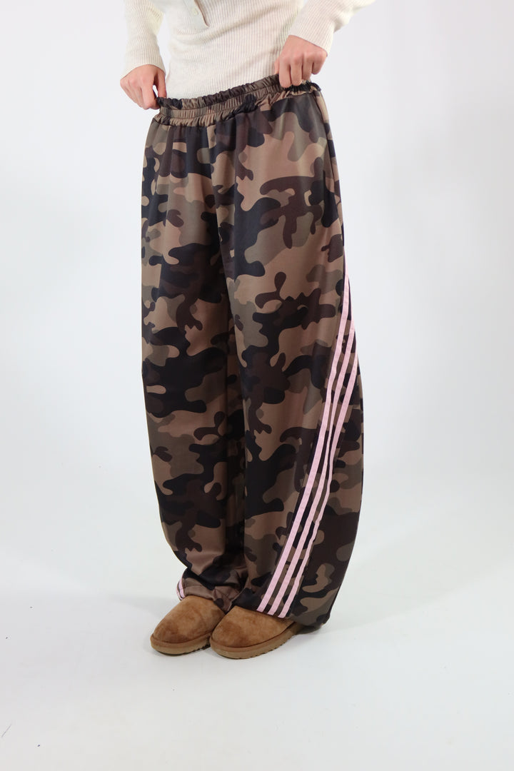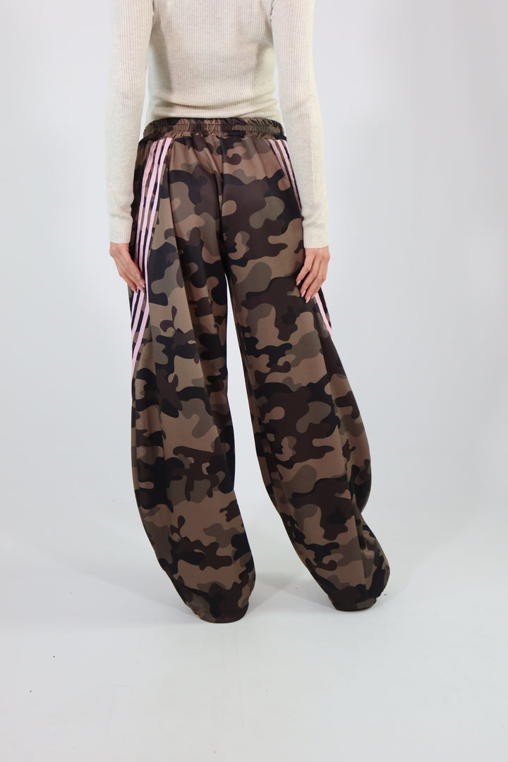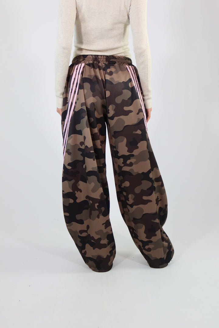 Pantalone dal fit morbido a stampa mimetica con strisce rosa laterali. Grazie all’elastico in vita il pantalone si adatta da una XS ad una taglia M/L.