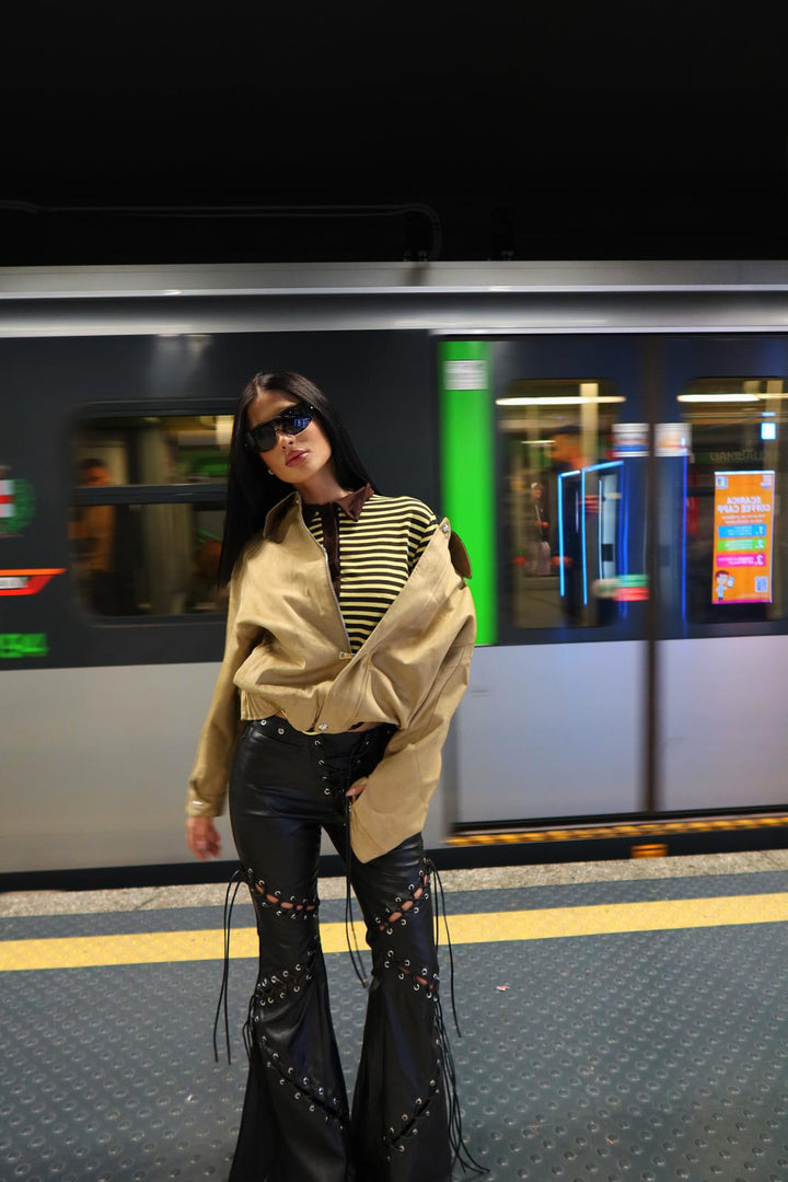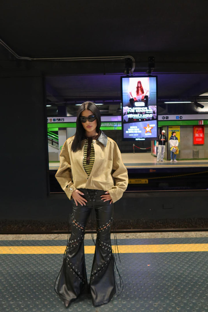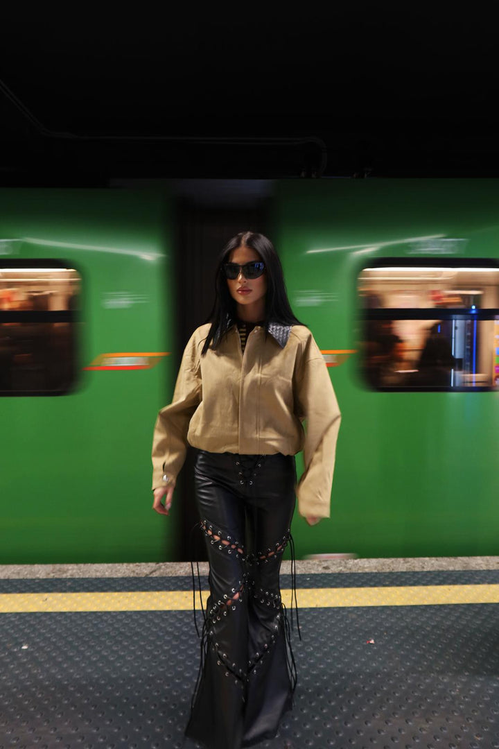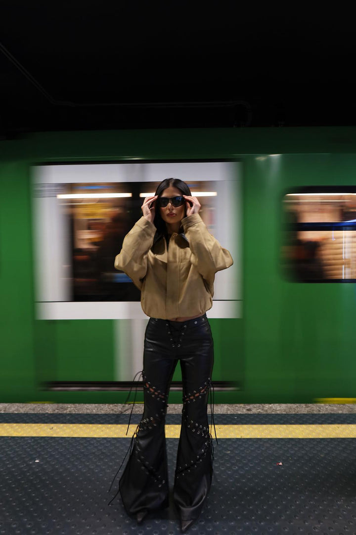 Pantalone di pelle con stringhe che cade a zampa. La modella indossa la taglia S ed è alta 1.72.