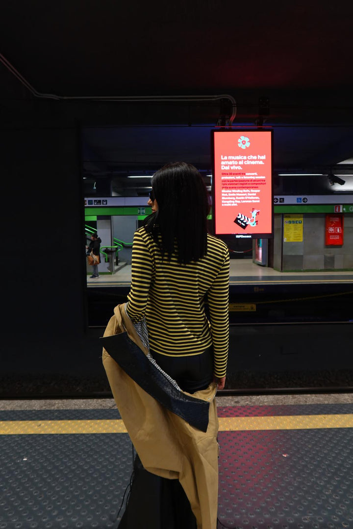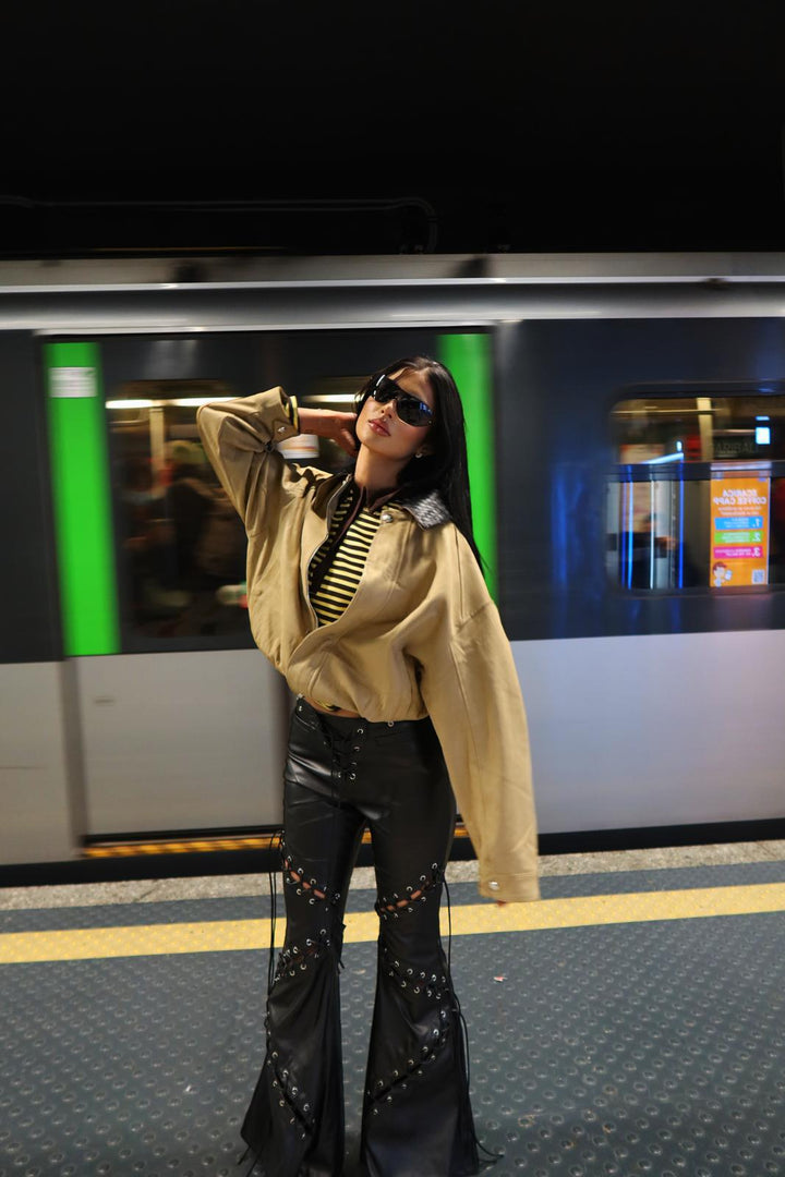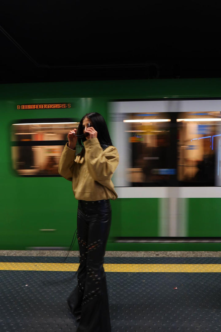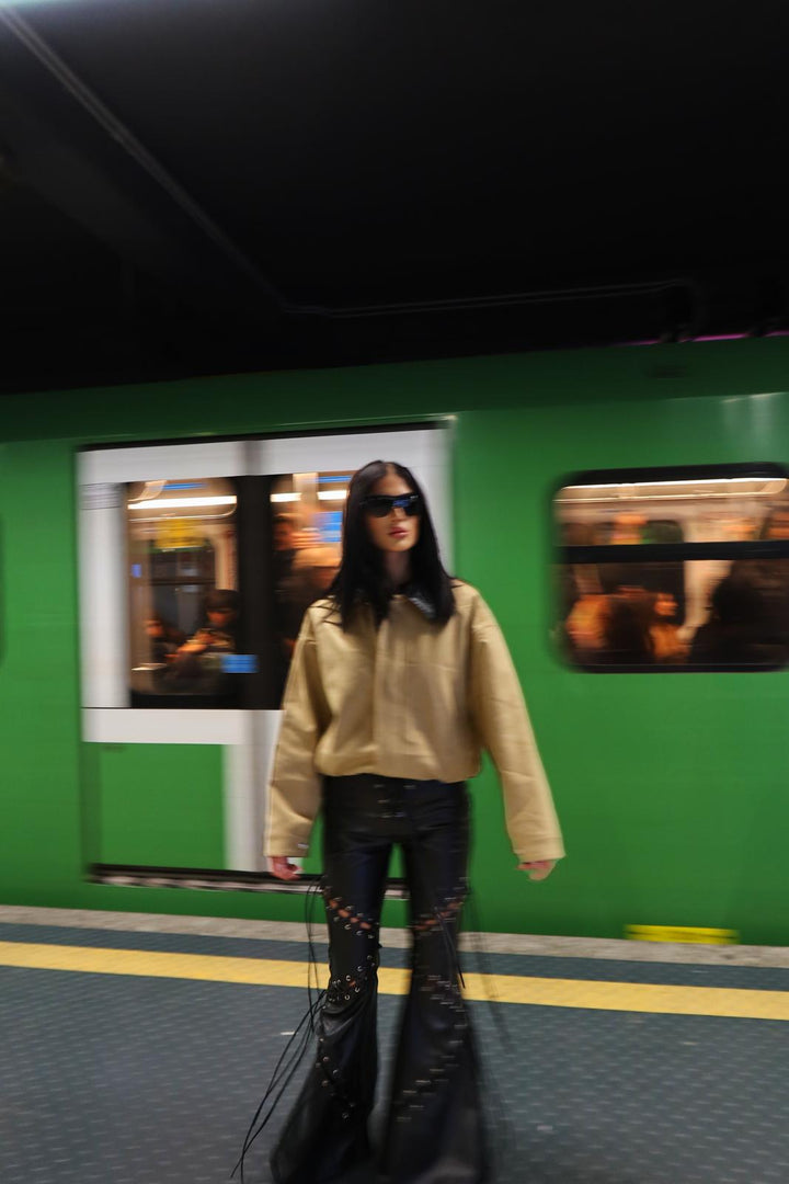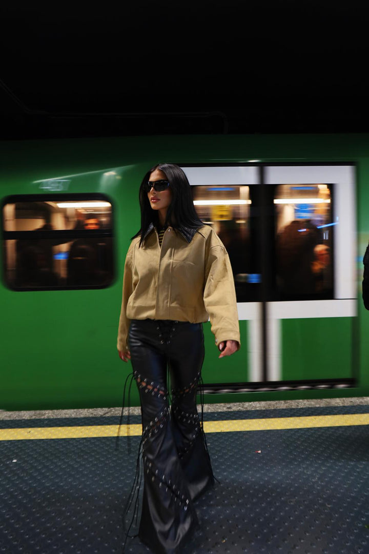 Pantalone di pelle con stringhe che cade a zampa. La modella indossa la taglia S ed è alta 1.72.