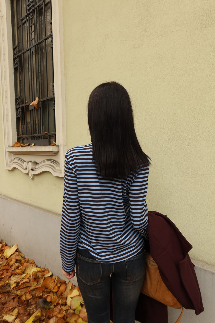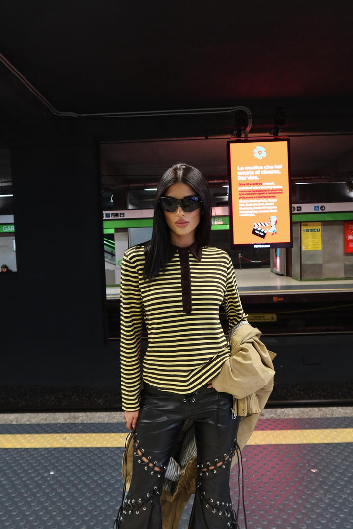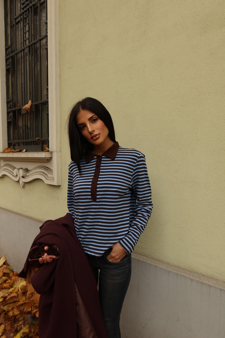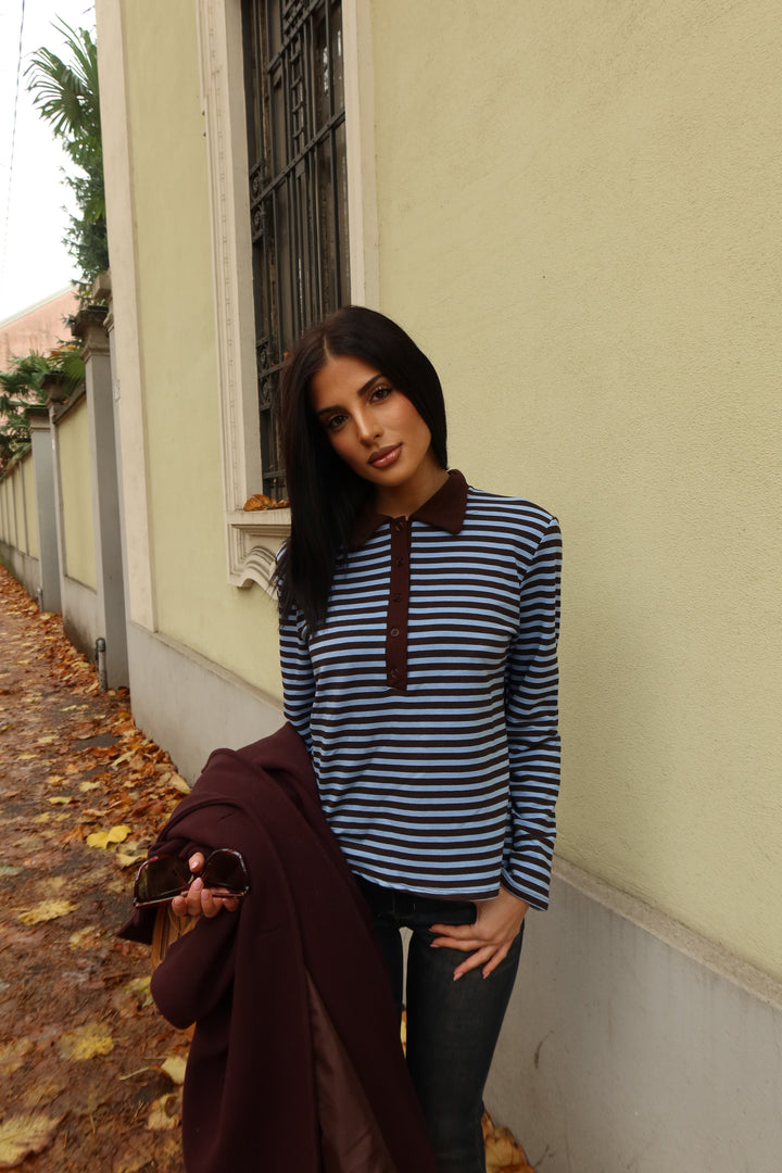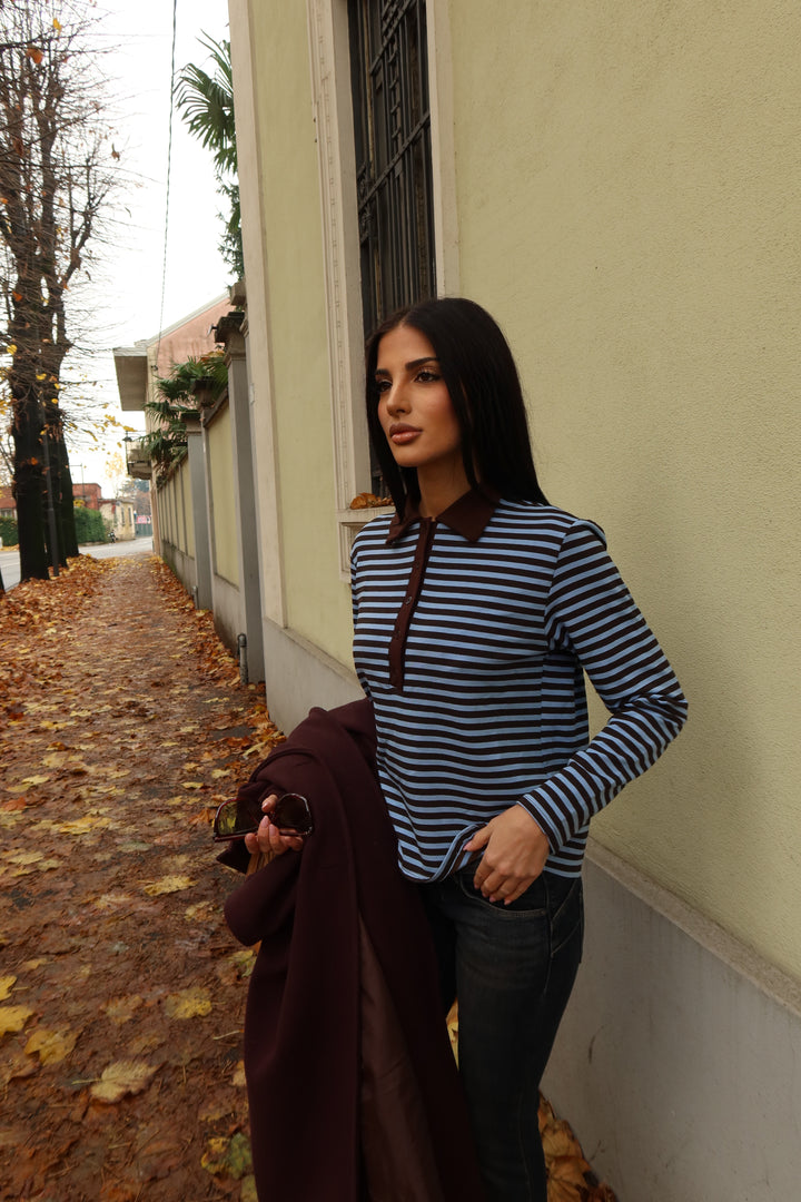Polo a righe strutturata con colletto e bottoncini. Materiale morbido e leggero, si adatta dalla XS ad una taglia M/L.