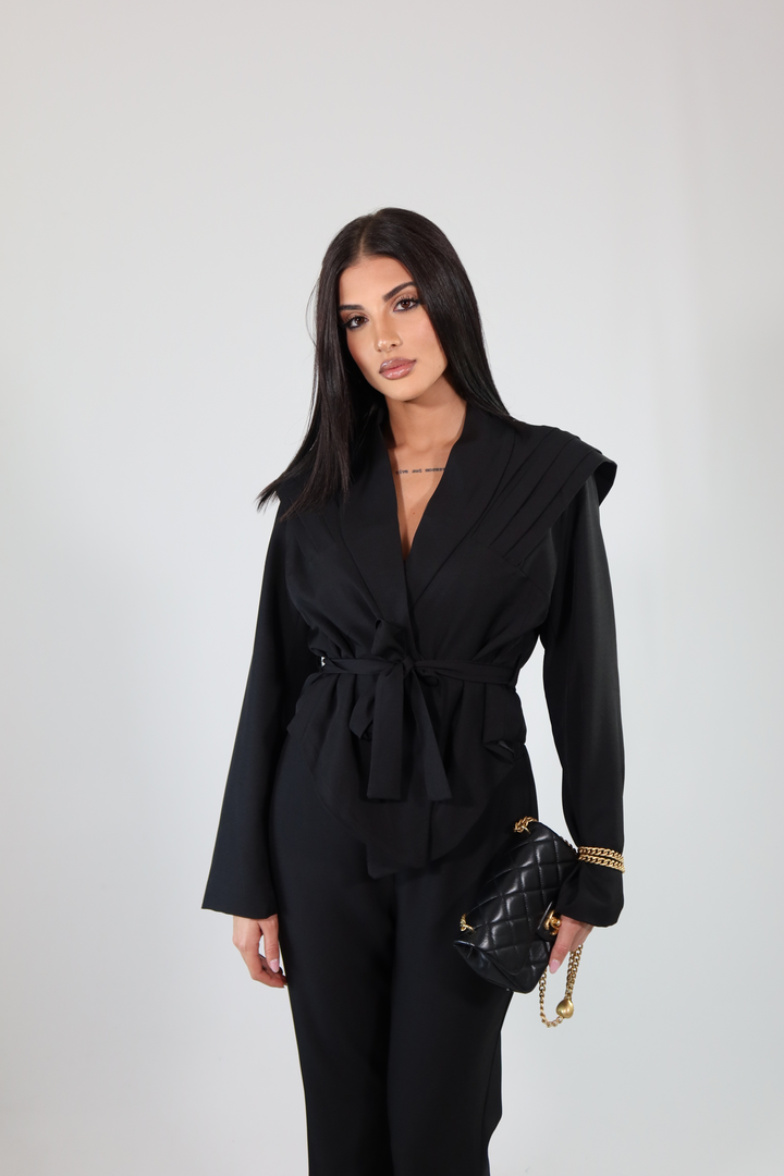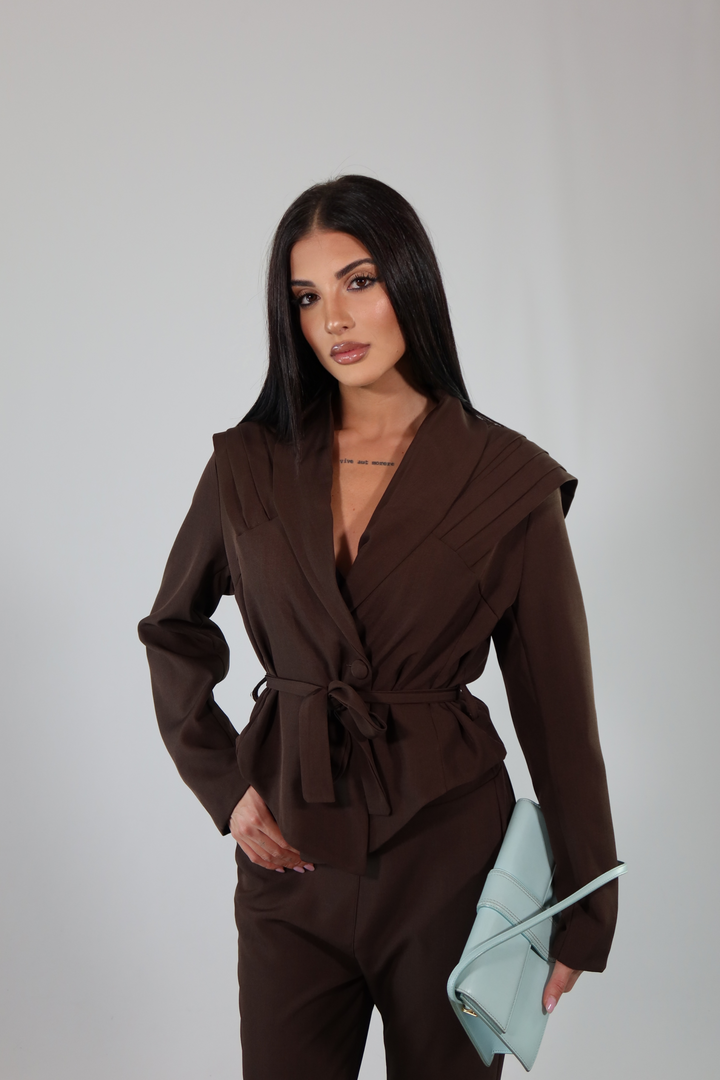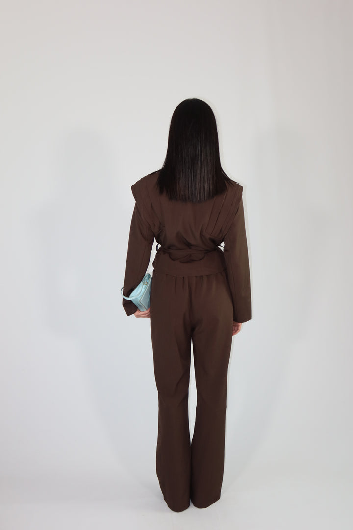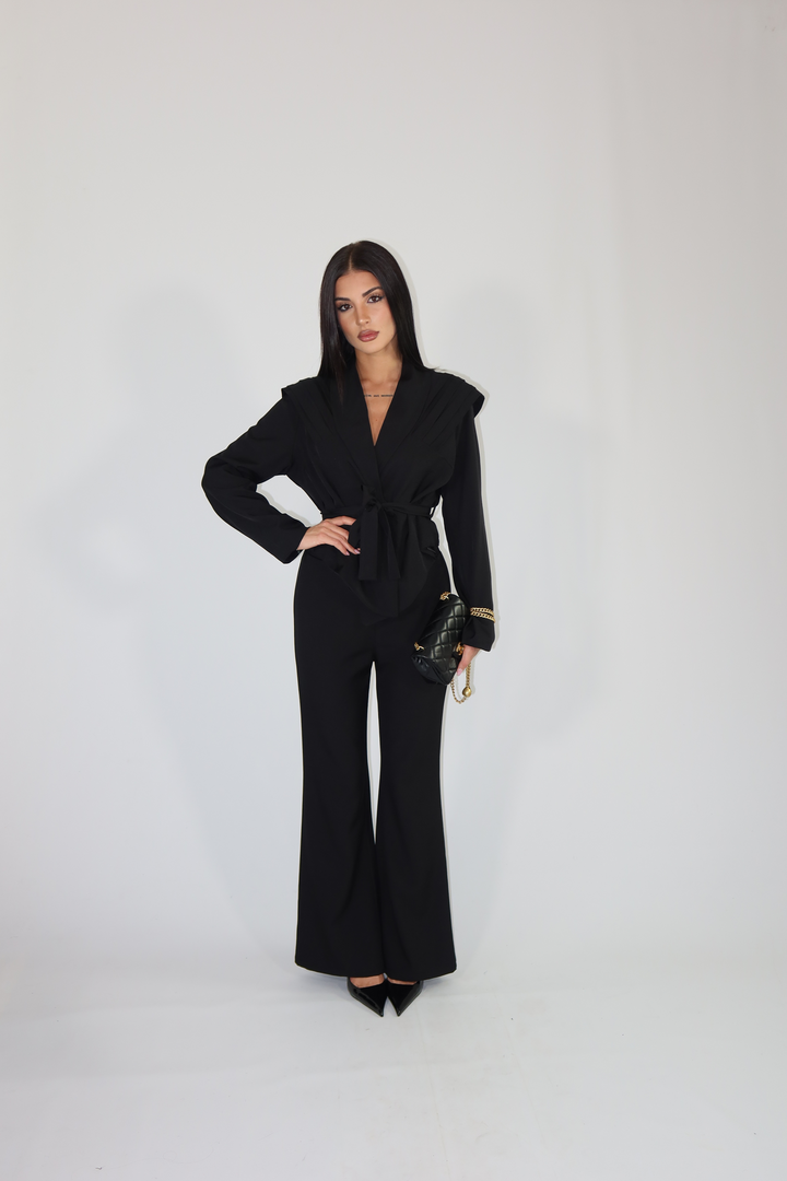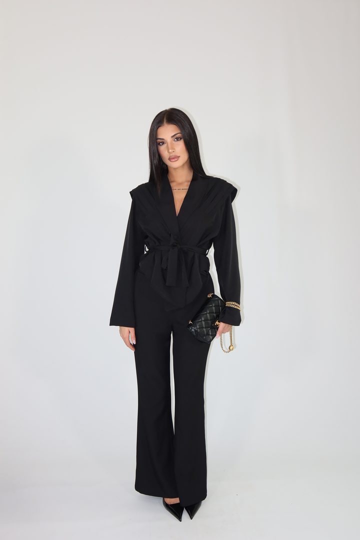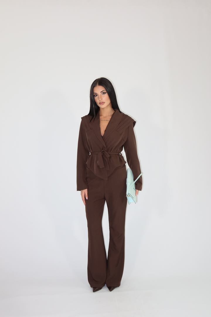 Tailleur pantalone morbido che cade leggermente a zampa e giacca avvitata con spalline rinforzate.